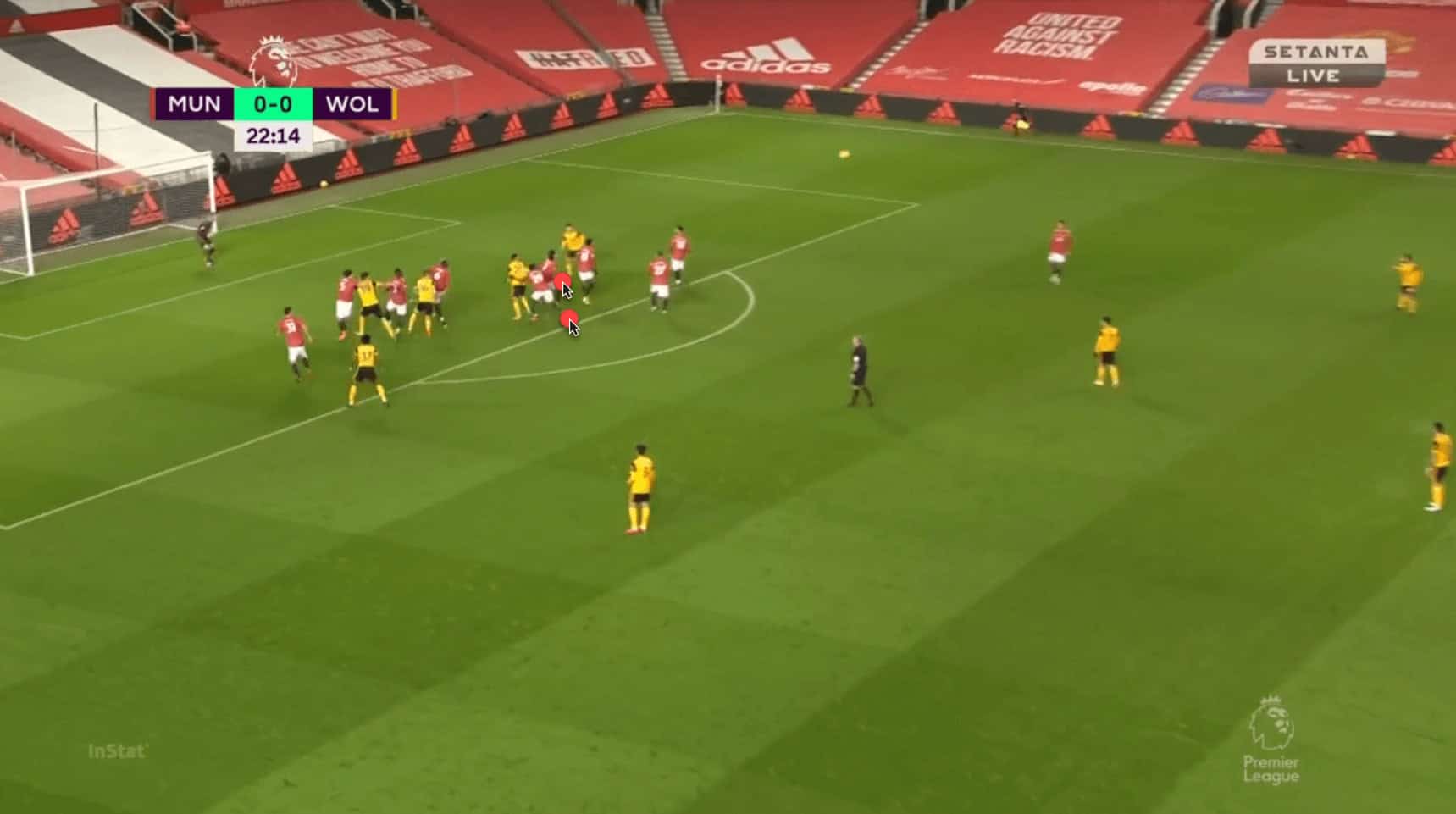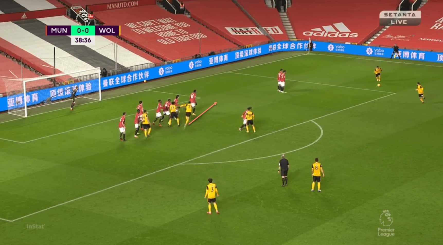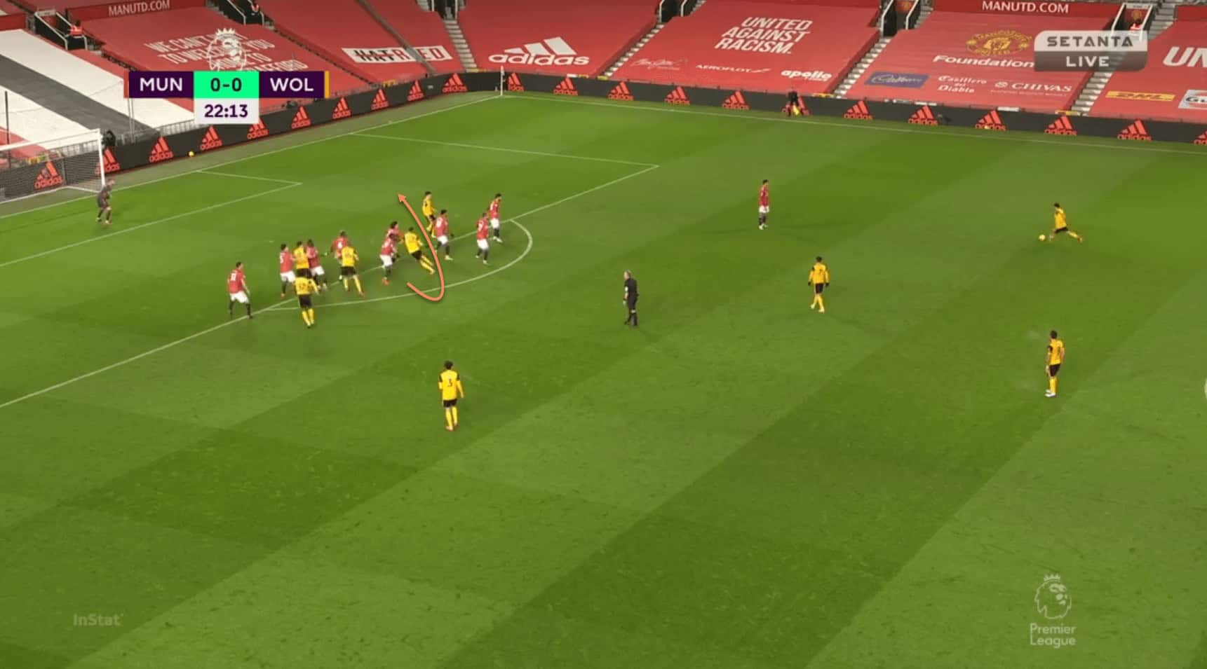 Once again, it is Saïss who gets the better of the Uruguayan. As Pedro Neto runs up to deliver the free-kick, Saïss makes a run towards the near post, which Cavani fails to follow. It can be argued that he was distracted by the presence of Adama Traoré, but Wan-Bissaka and Pogba are on hand to deal with the Spaniard. In fact, United outnumber Wolves 7-3 in this area, and yet it is a Wolves player who gets the first contact on the ball.