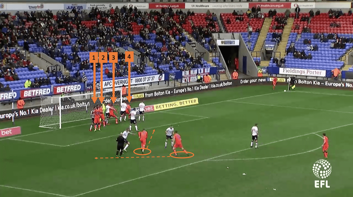 This subsequently forces the opposition to take up a deeper starting position from corners as they are forced to mark a number of men in the six-yard box. This then allows deeper runners to attack the six-yard box in one-on-one situations.Millwall EFL Championship tactical set-piece analysis statistics