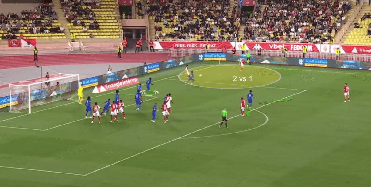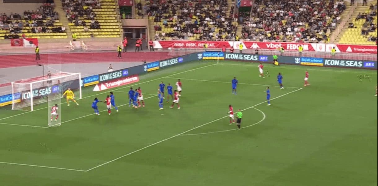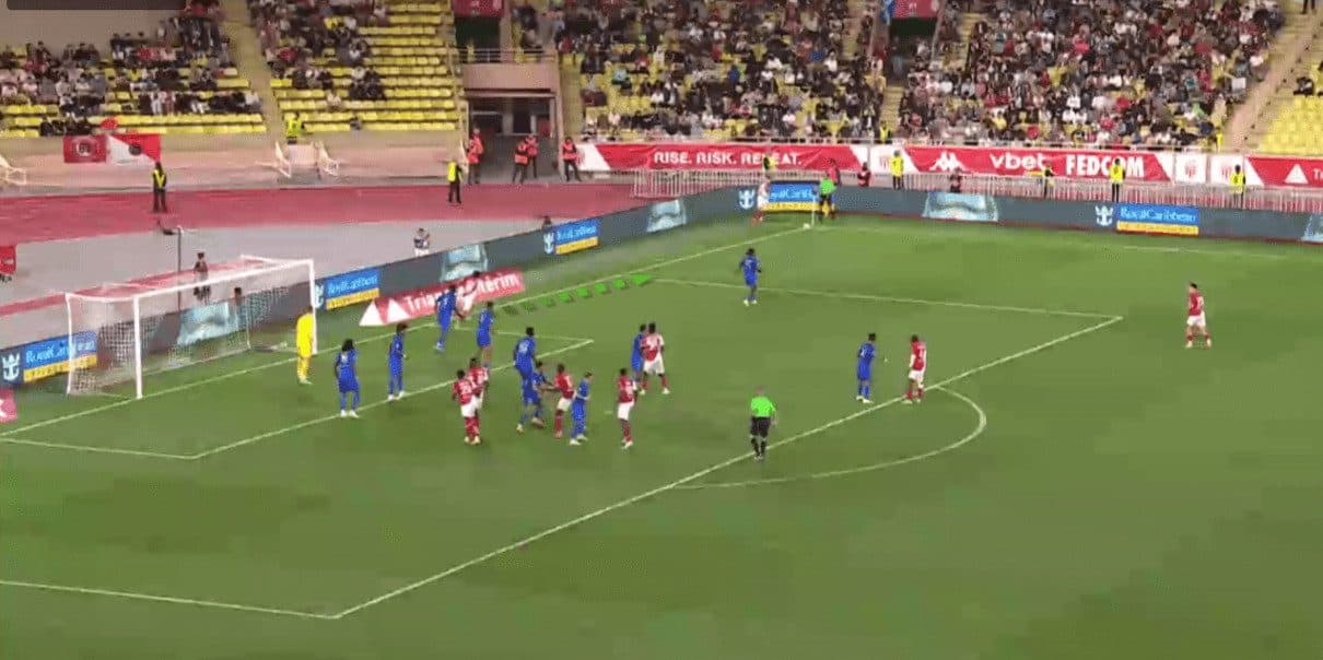 Monaco used a different short-corner routine by asking a player to come from the six-yard suddenly to receive the ball from the taker to be in a quick 2-v-1 situation against the short-option defender because of the late help of the first zonal defender.