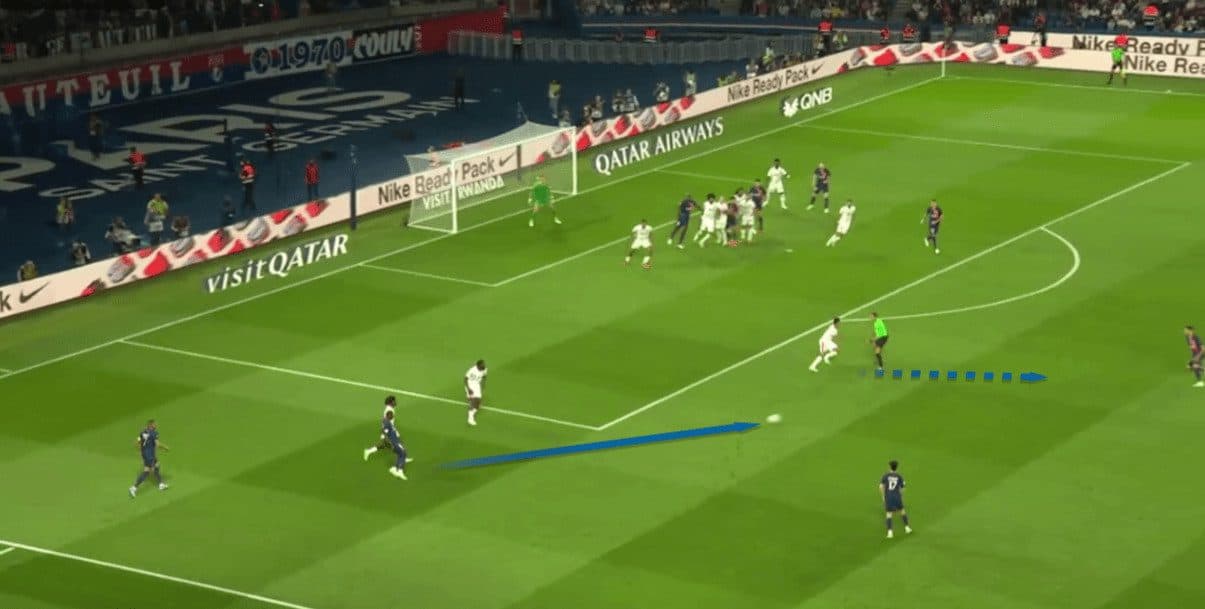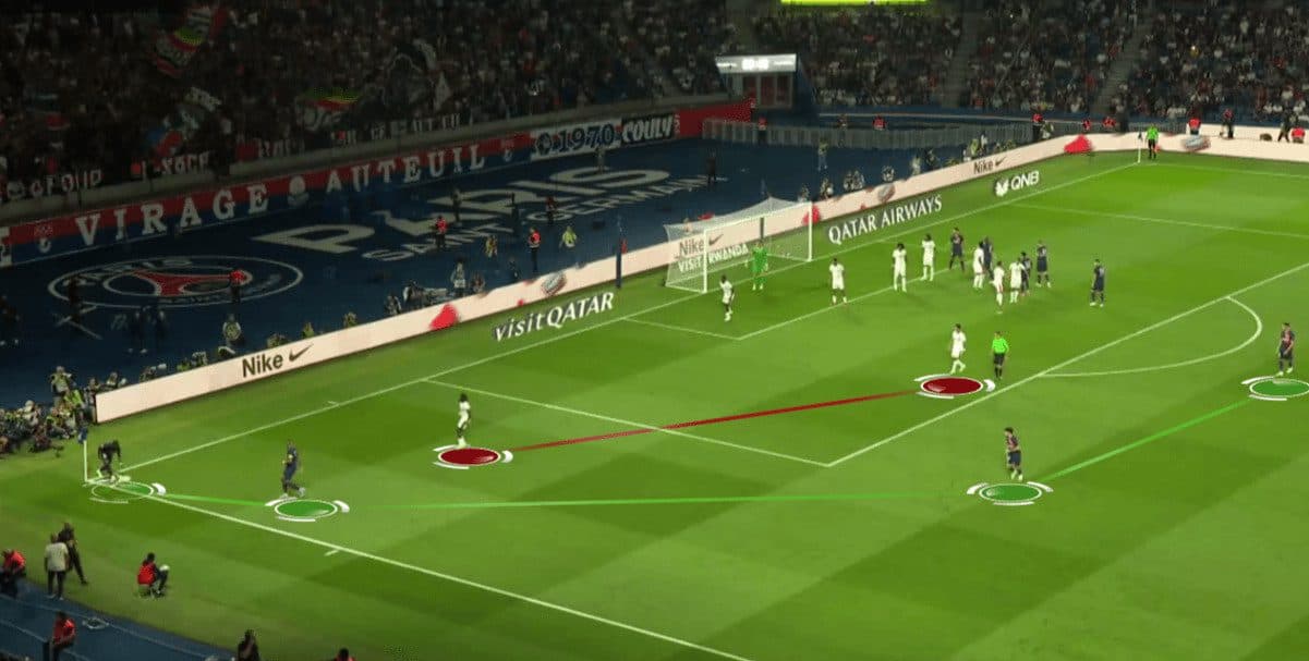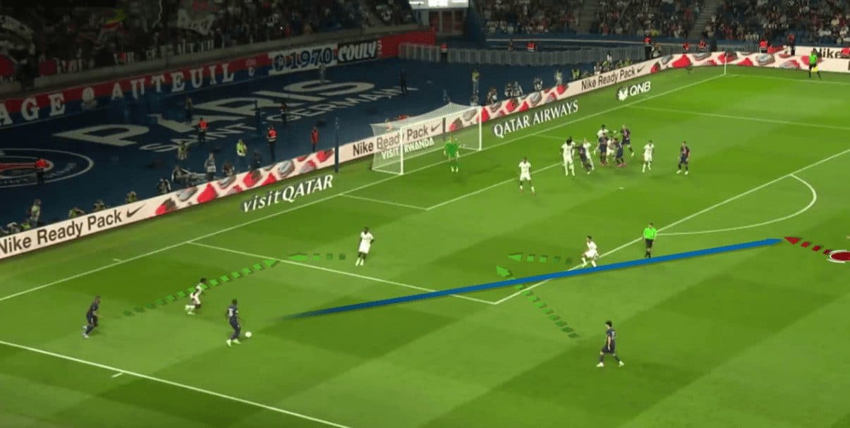 PSG tried to target the rebound zone with many short passes to end at the rebound area by using numerical superiority over the two players of Nice, the rebound defender and the short-option defender.
