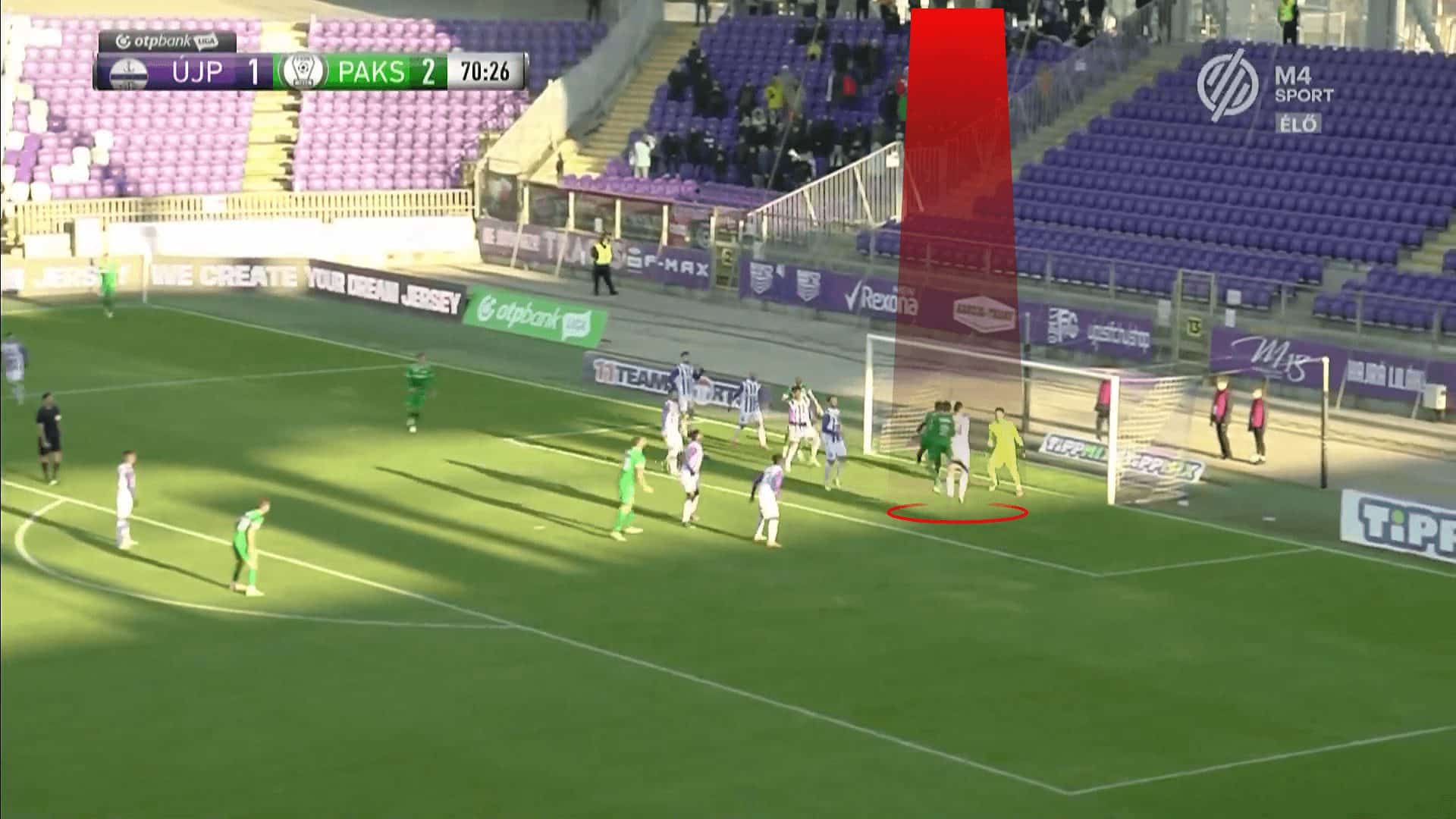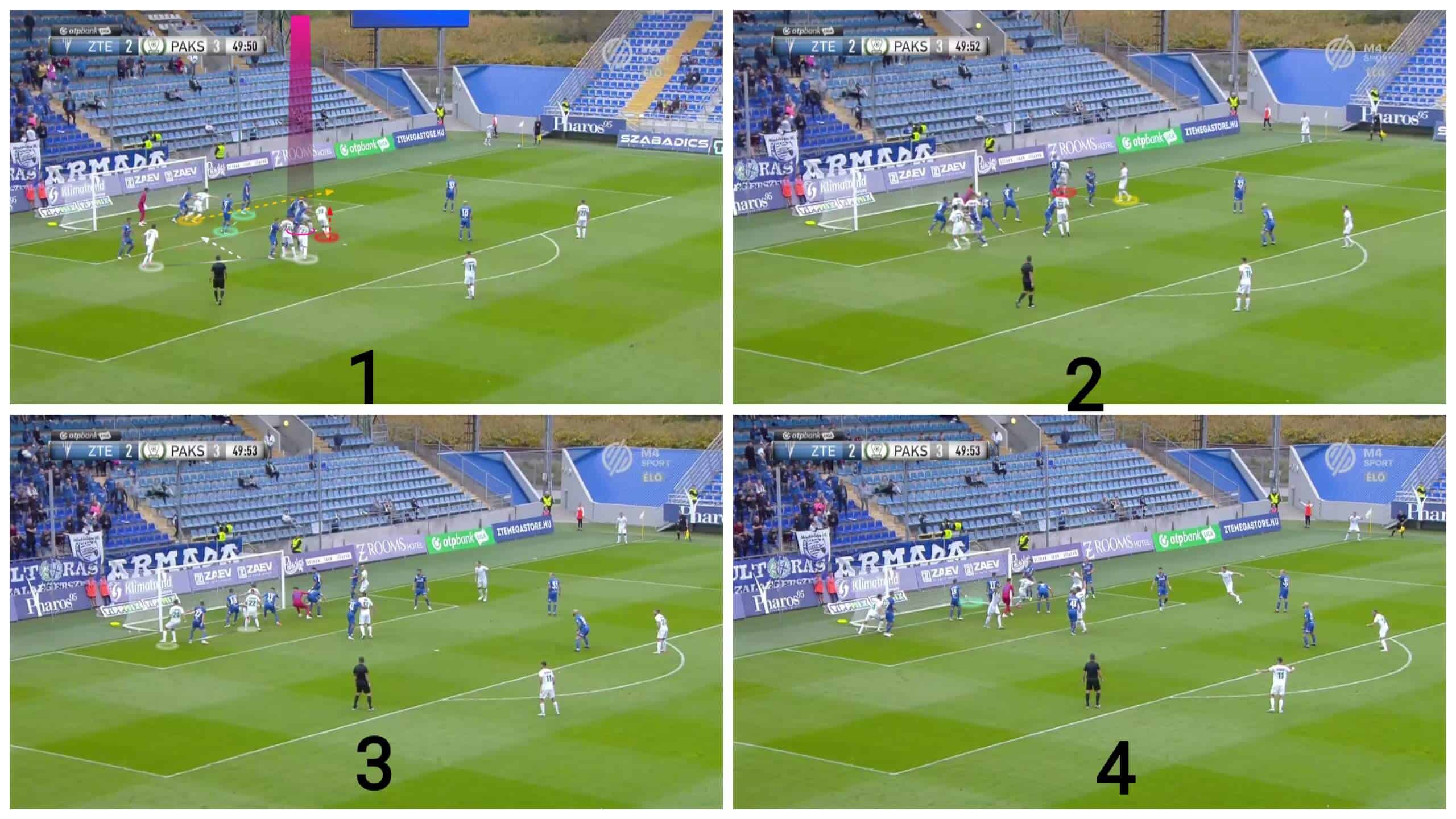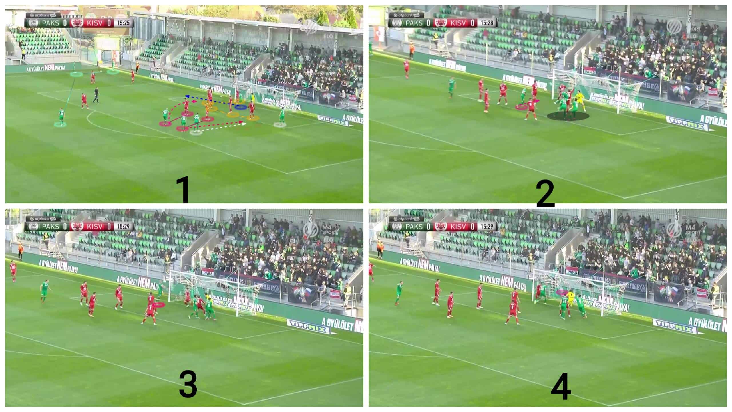 Going back to the same case after summarising their intentions, we want to get into the details deeply. At first, the defender responsible for defending flicks was dragged, worried about the short corner because Paksi FC overloaded this area, the short and rebound area, with four green players against two defenders achieving numerical superiority in case of the short option. When he got sure that the ball wouldn’t be passed shortly, he started to step back, but he was late.