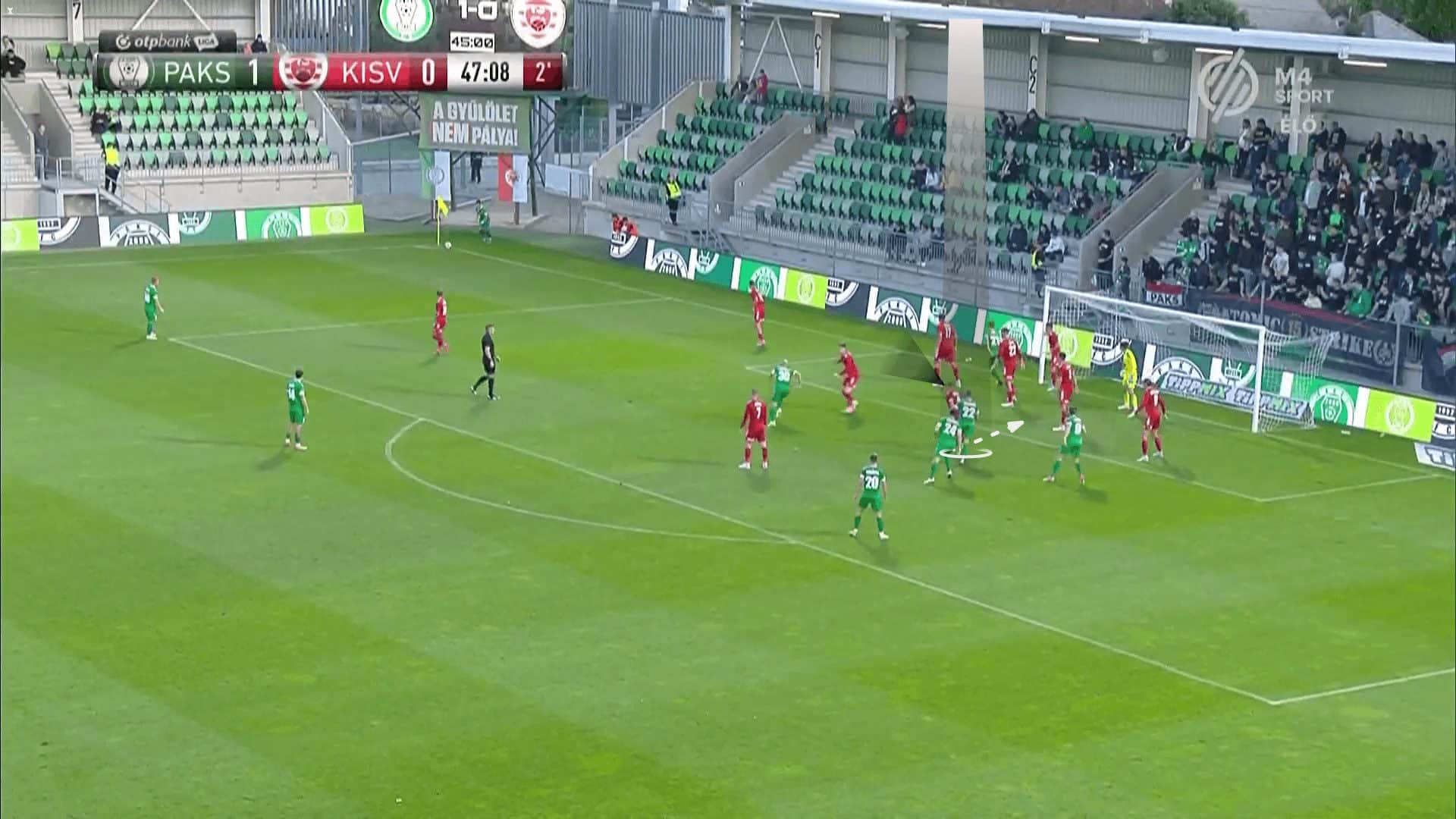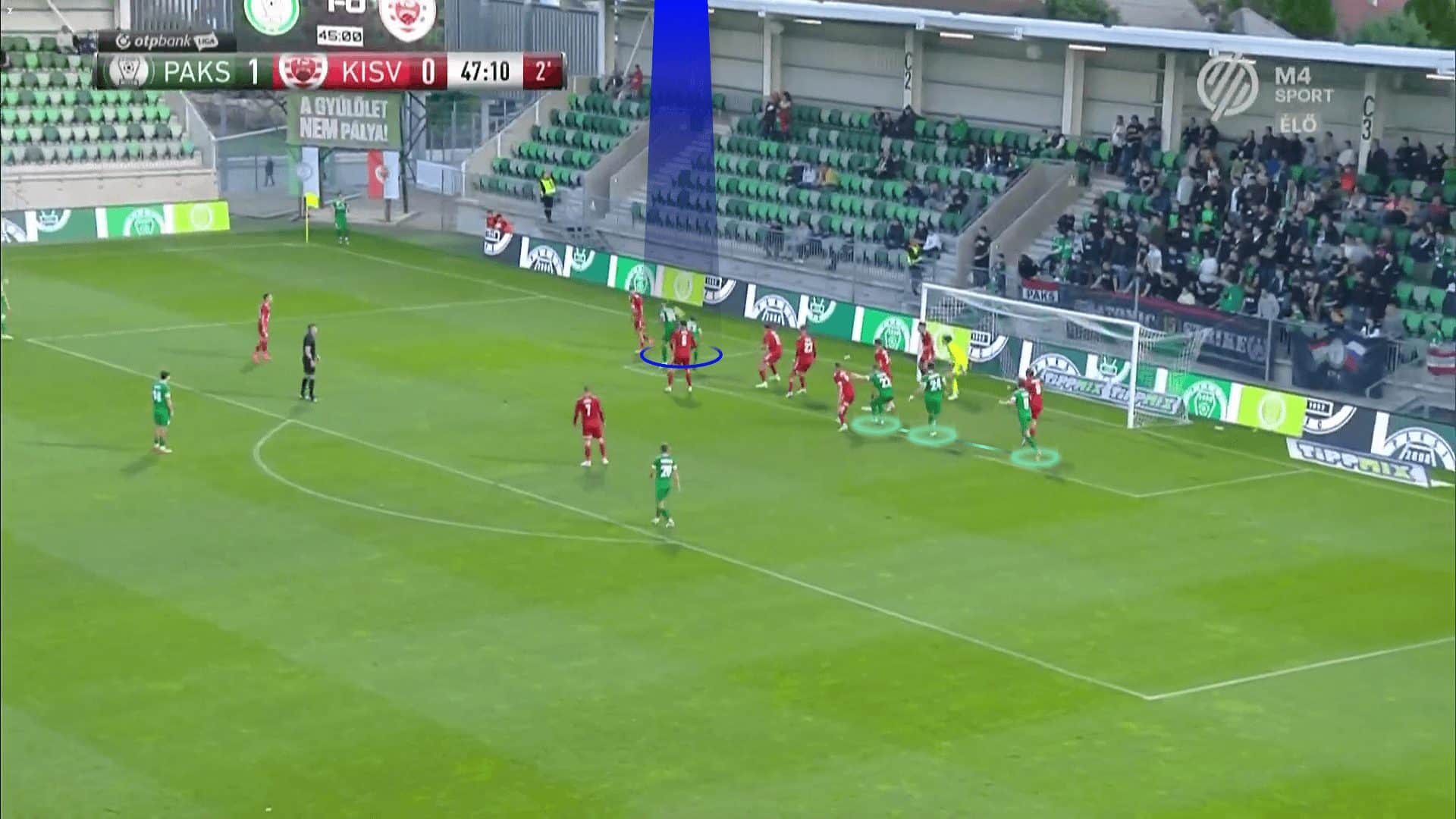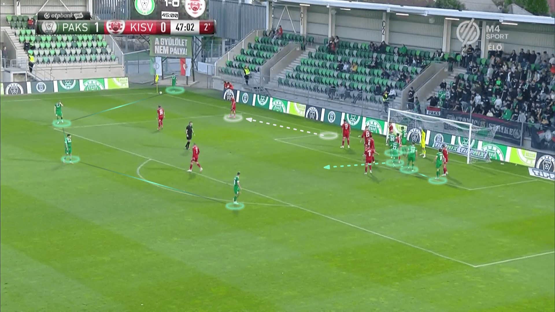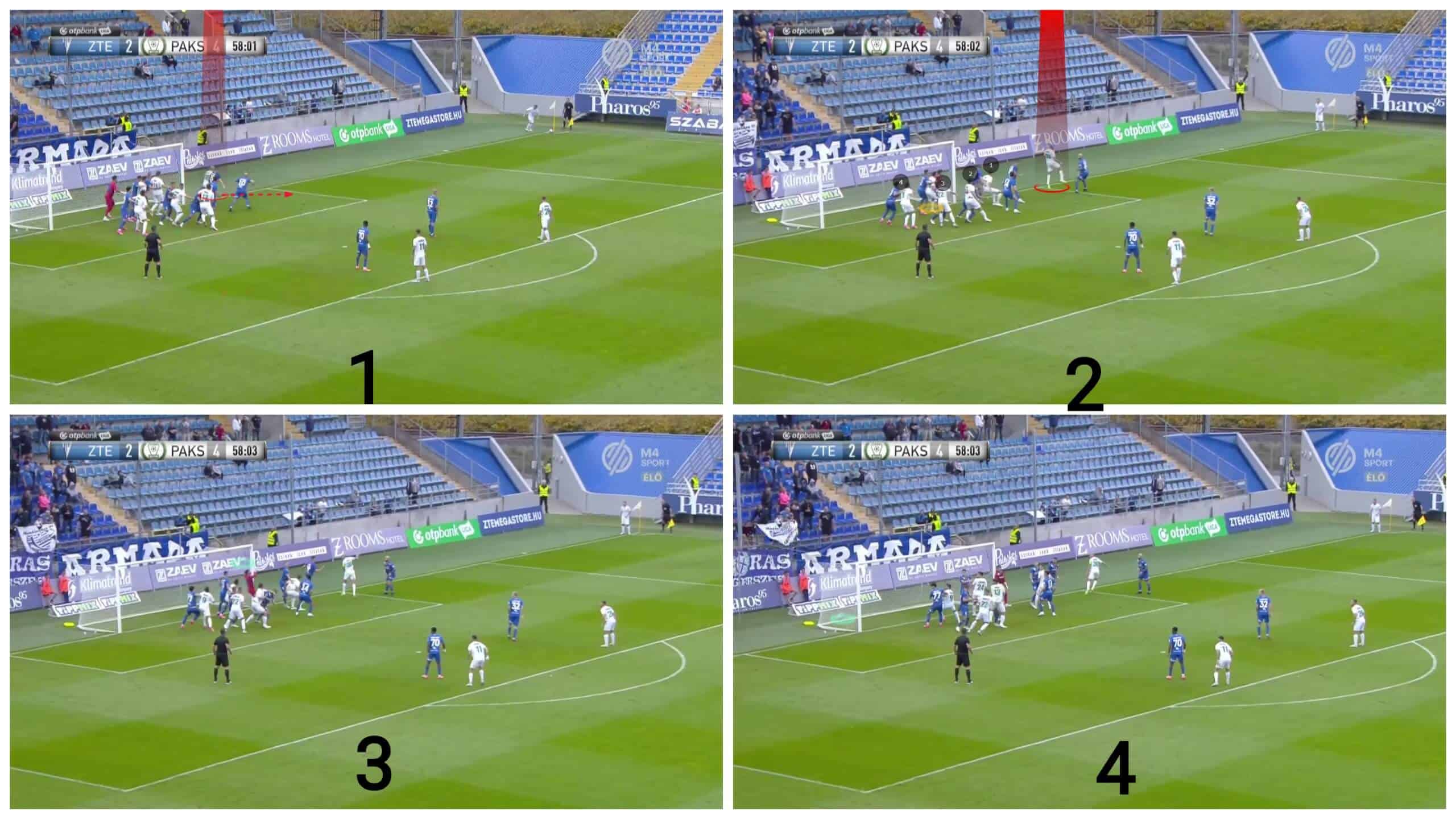 Going back to the same case after summarising their intentions, we want to get into the details deeply. At first, the defender responsible for defending flicks was dragged, worried about the short corner because Paksi FC overloaded this area, the short and rebound area, with four green players against two defenders achieving numerical superiority in case of the short option. When he got sure that the ball wouldn’t be passed shortly, he started to step back, but he was late.
