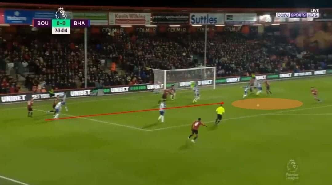This next scenario resembles the previous one quite closely. The first image below shows Solanke arriving from deep once more, like H.Wilson previously. As a result, two Brighton players have left their positions in the penalty box, in order to maintain numerical equality. Jefferson Lerma plays a vital role here for this specific routine, even if it looks minor. His wider positioning attracts the third – and widest – Brighton player. Consequently, an open passing lane emerges – we can see this develop below. A pass is played into an optimal area, and met on by a Bournemouth player on the move. They are also Bournemouth players making runs towards goal, taking their markers with them and thus enlarging the space needed for a cut-back. Having blockers to prevent pressure being applied would also be beneficial.