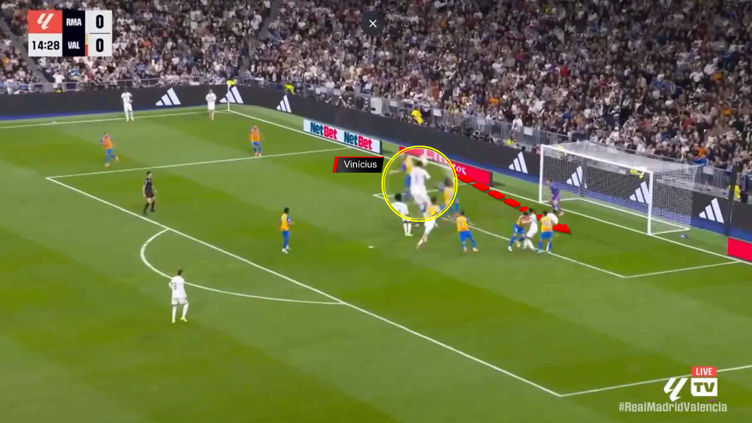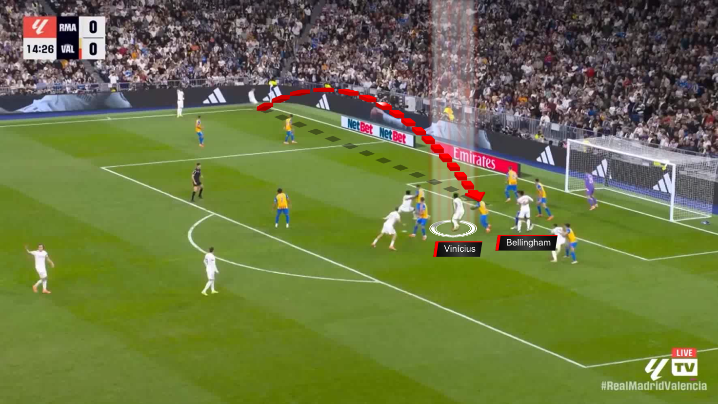 The Brazilian is at the near post after a feint, while Bellingham draws the defender to the far post.