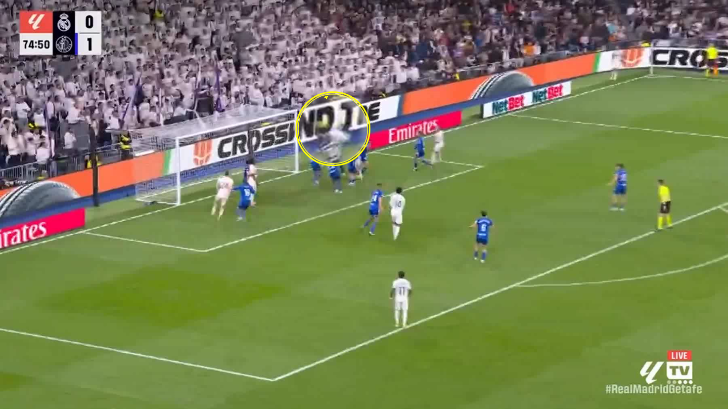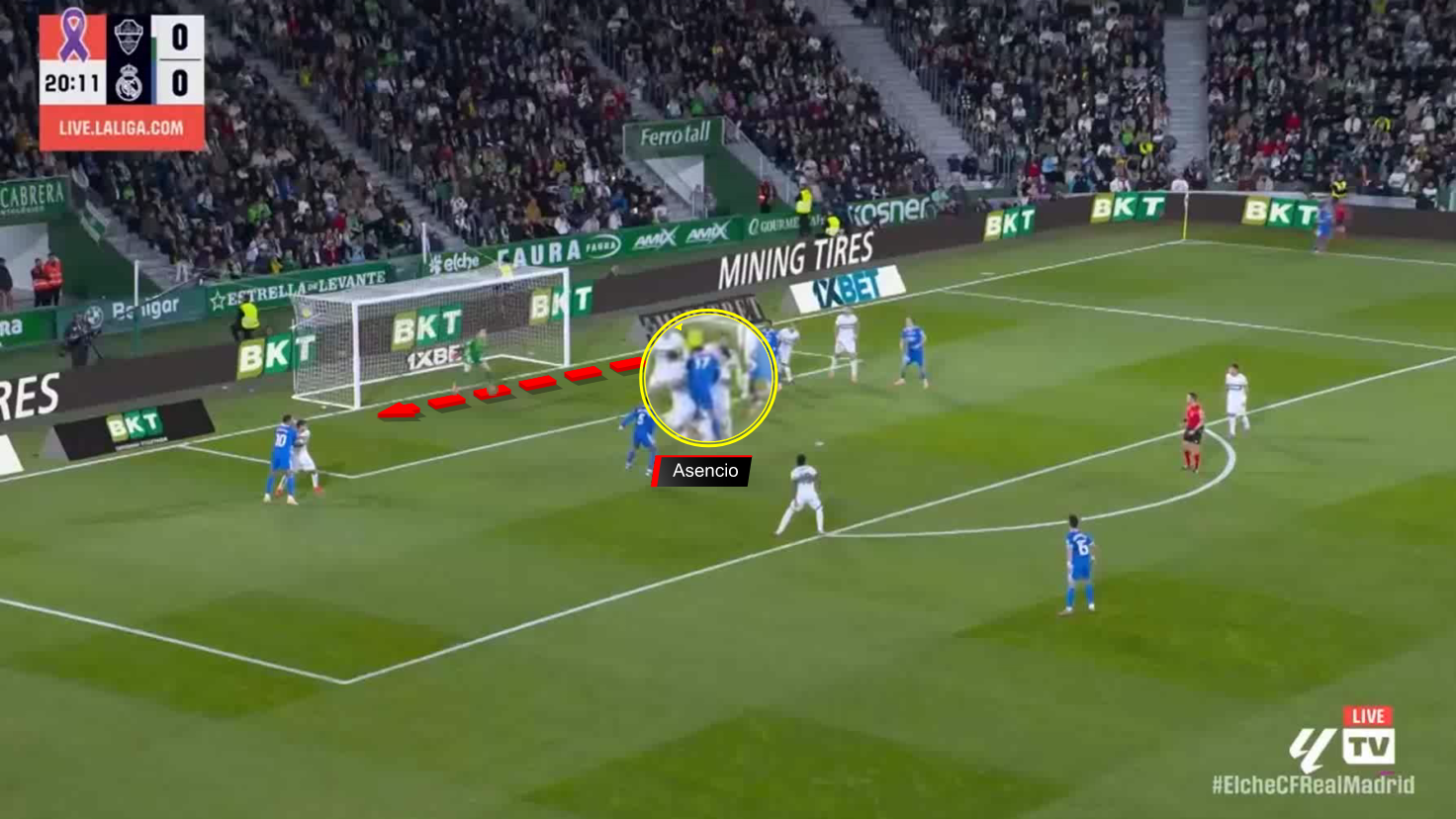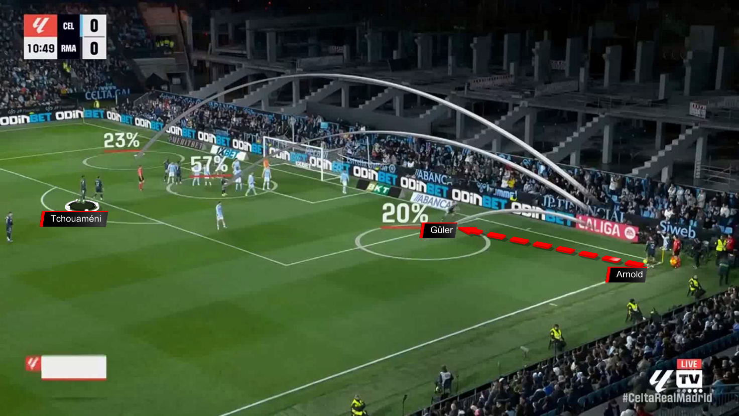 Dean Huijsen is positioned behind Jude Bellingham, with a cross from outswing, just in front of the penalty spot.