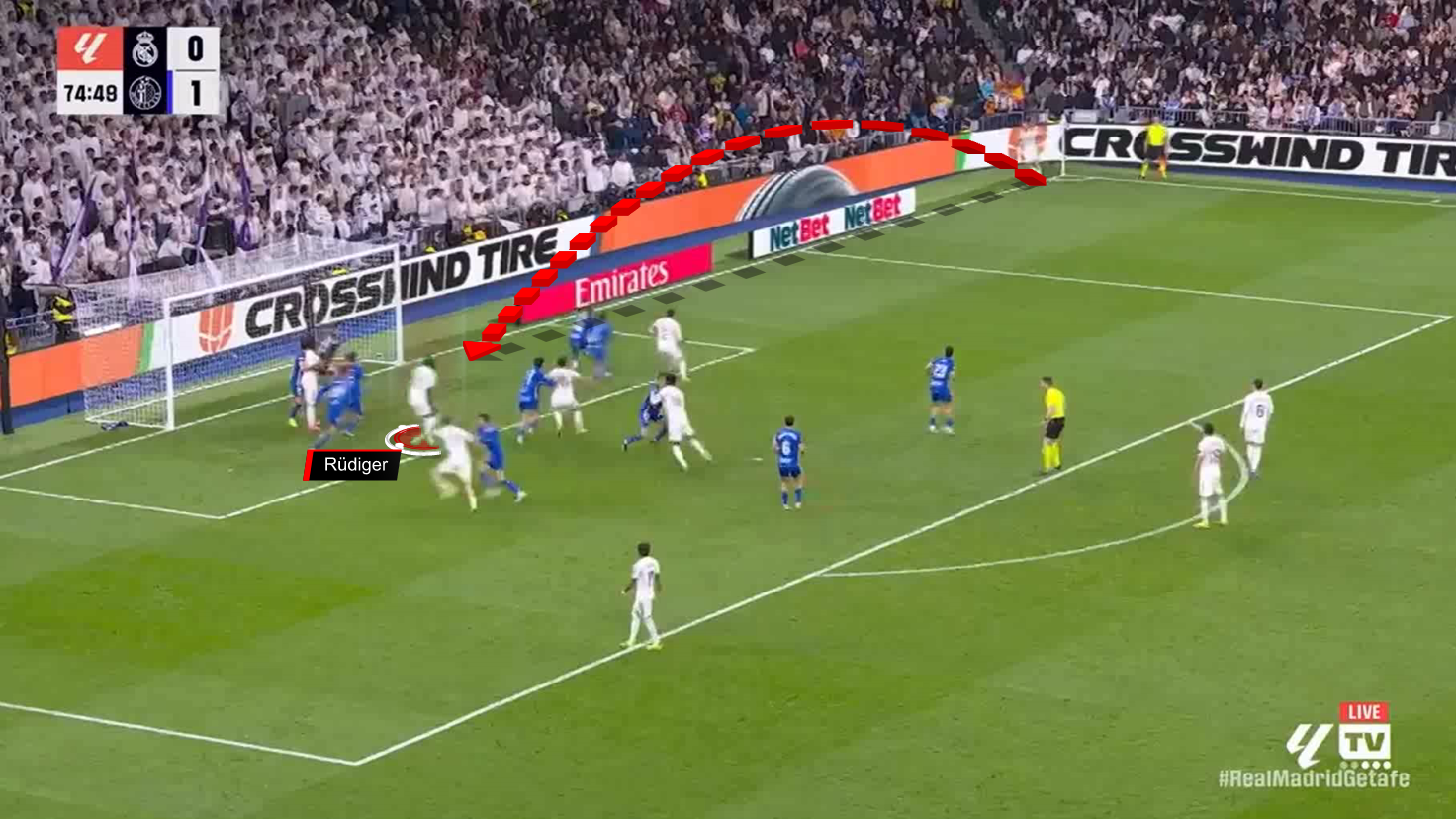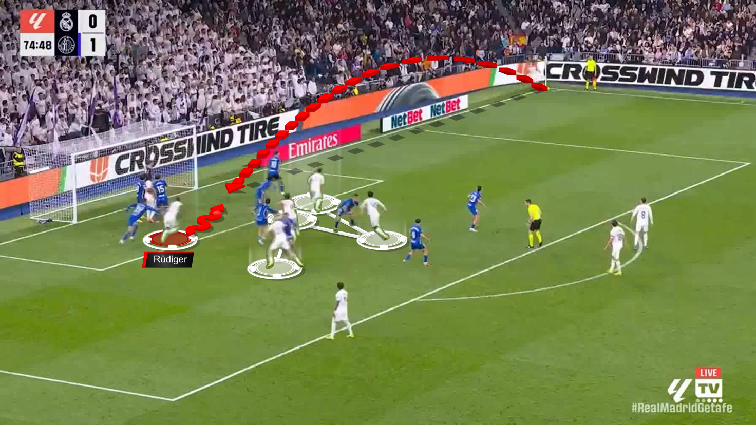 Here, Rüdiger moves diagonally to the near post, touches the ball towards the goal, with three players behind him.