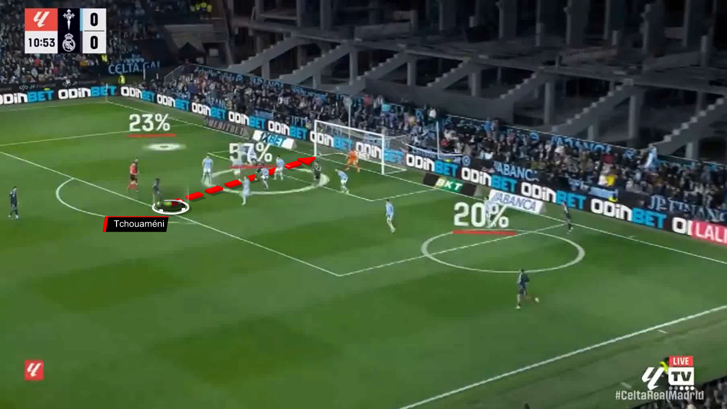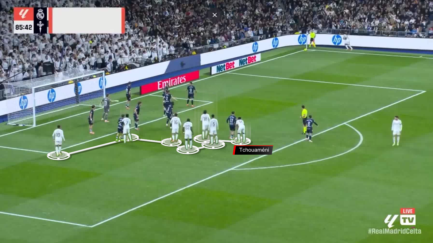 Here’s the short corner kick towards Arda Güler, who passed to Tchouaméni, who shot with the inside of his foot towards the far post and scored the opening goal.