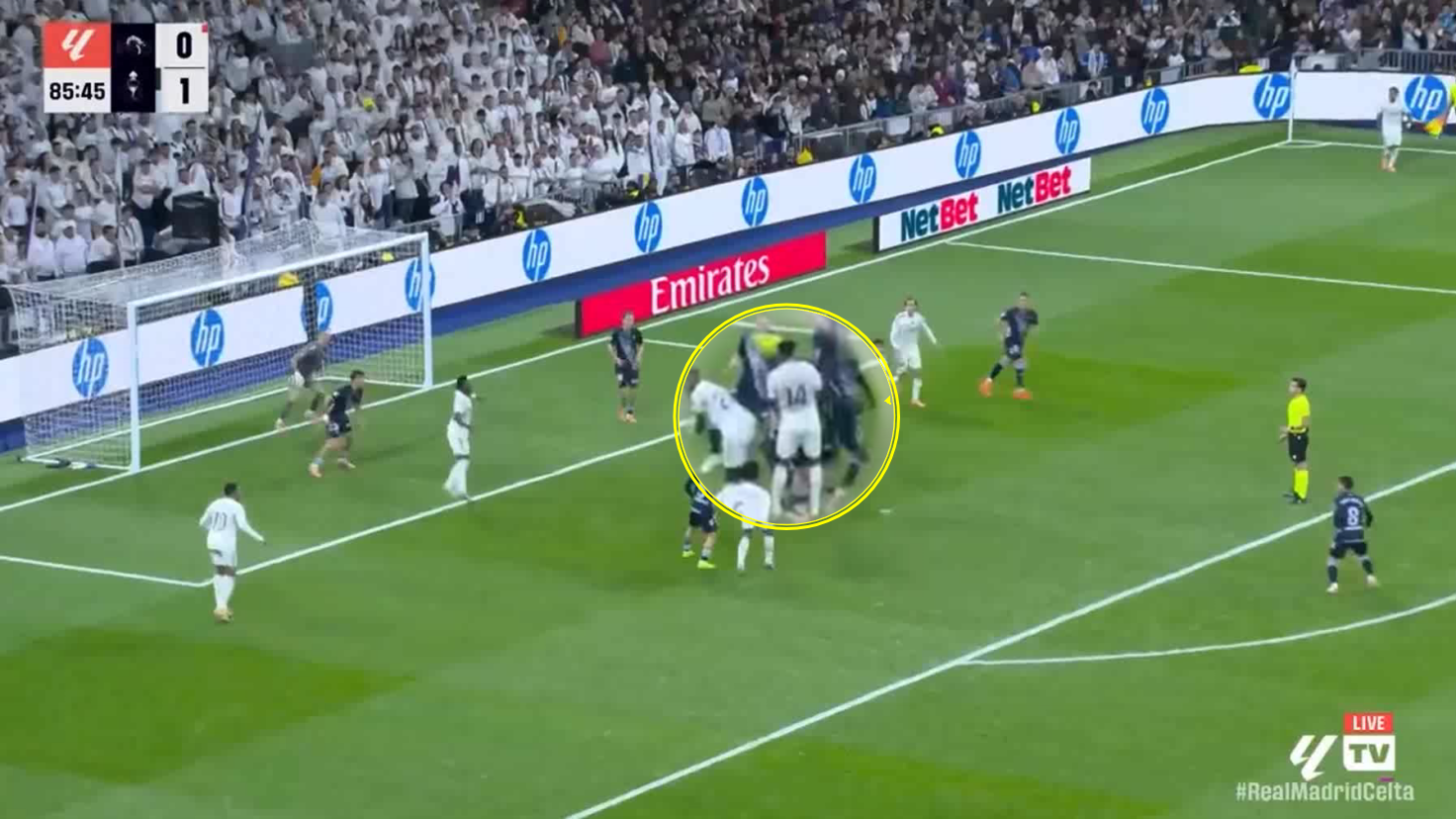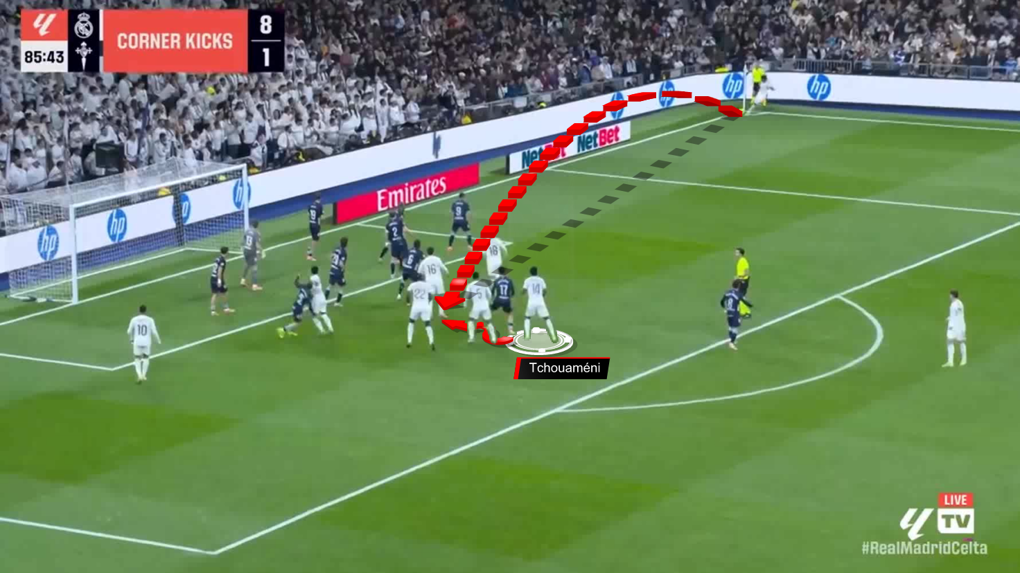 Here, in a match where Real Madrid were trailing, seven players were present during the corner kick, with Aurélien Tchouaméni positioned behind the penalty spot.