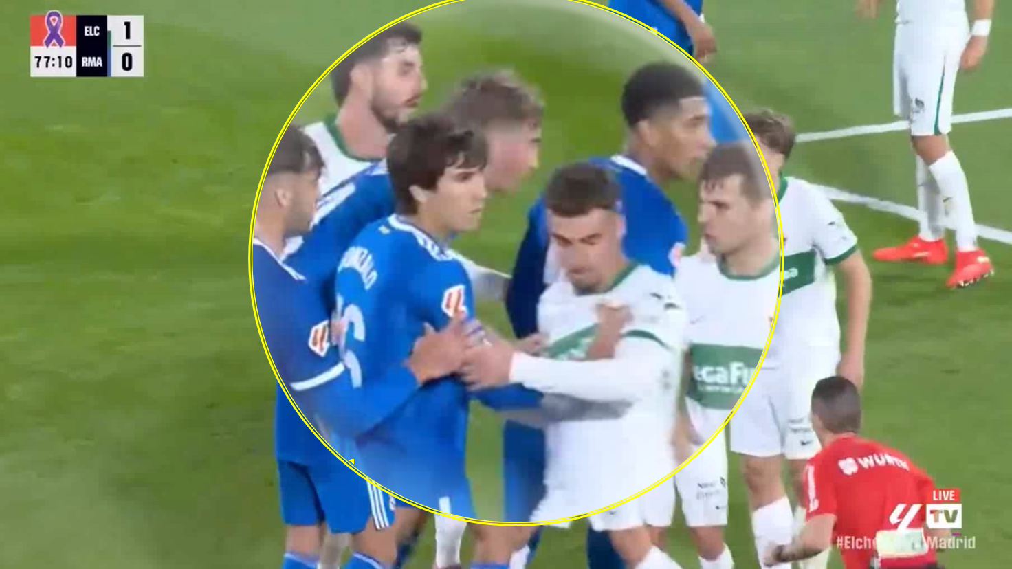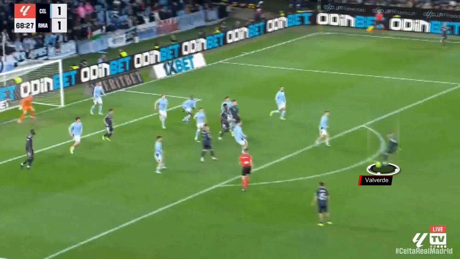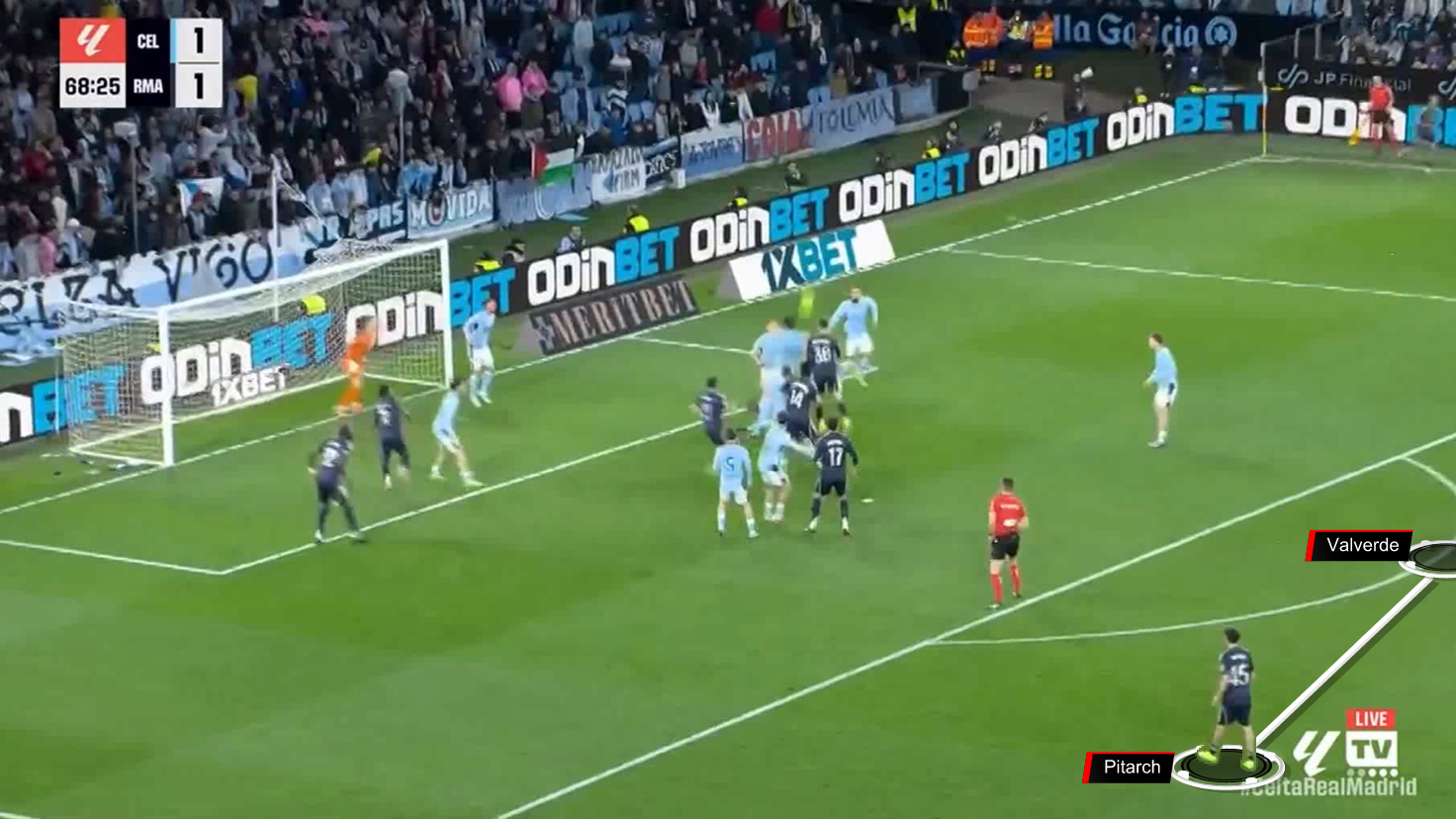 Here’s the corner kick in front of Celta Vigo, and Valverde and Thiago Pitarch are positioned on the edge of the penalty area.