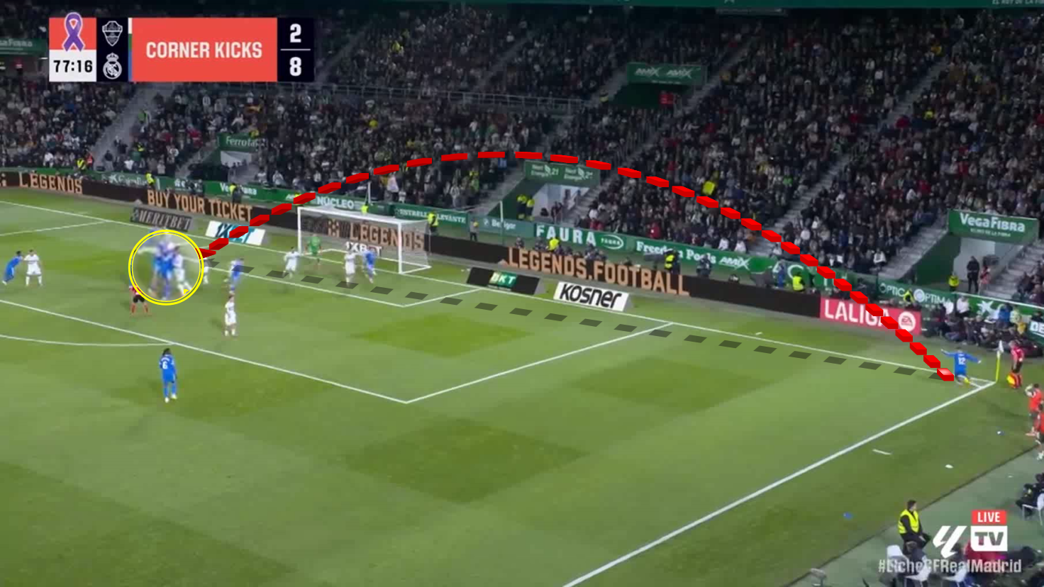 The variety between direct and short corner kicks makes it difficult for defences to predict how the corner kick will be executed, giving Real Madrid an additional tactical advantage in these situations.