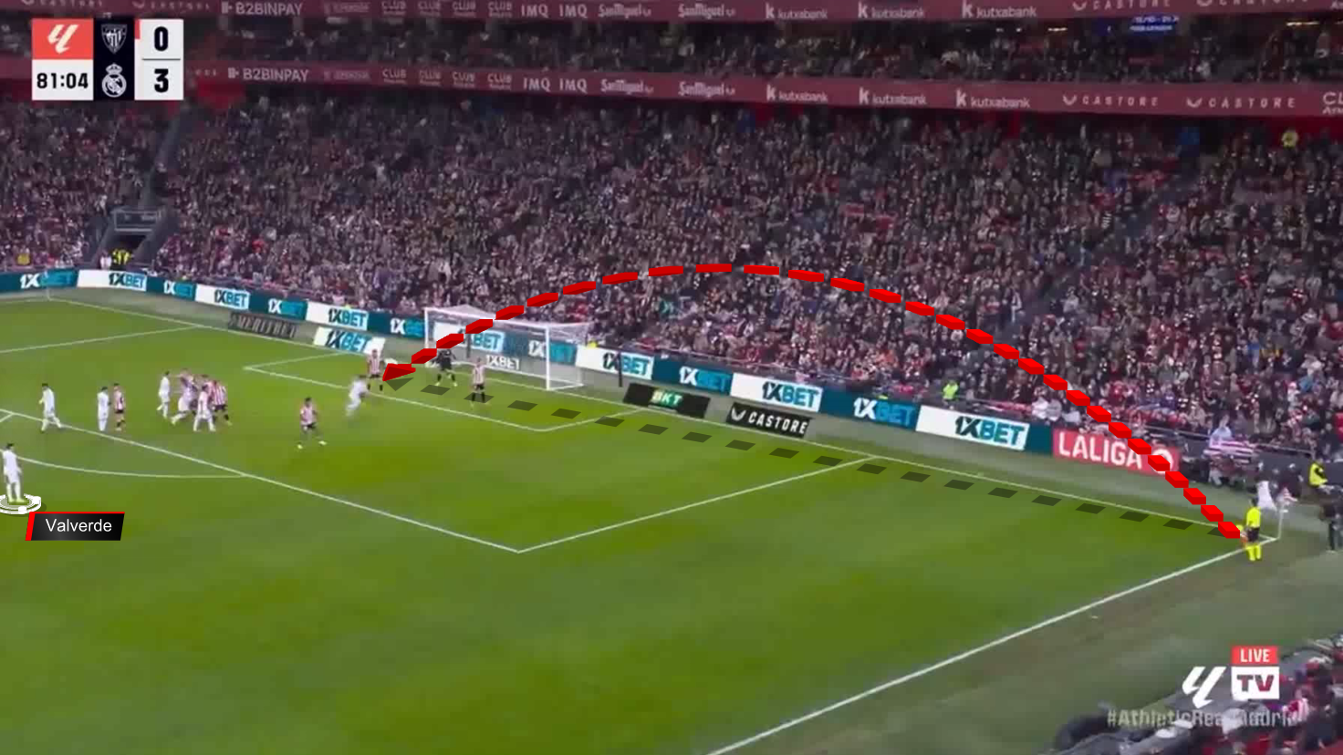 Here, Valverde receives the second ball and shoots it first time into the far corner, but the goalkeeper makes a brilliant save.