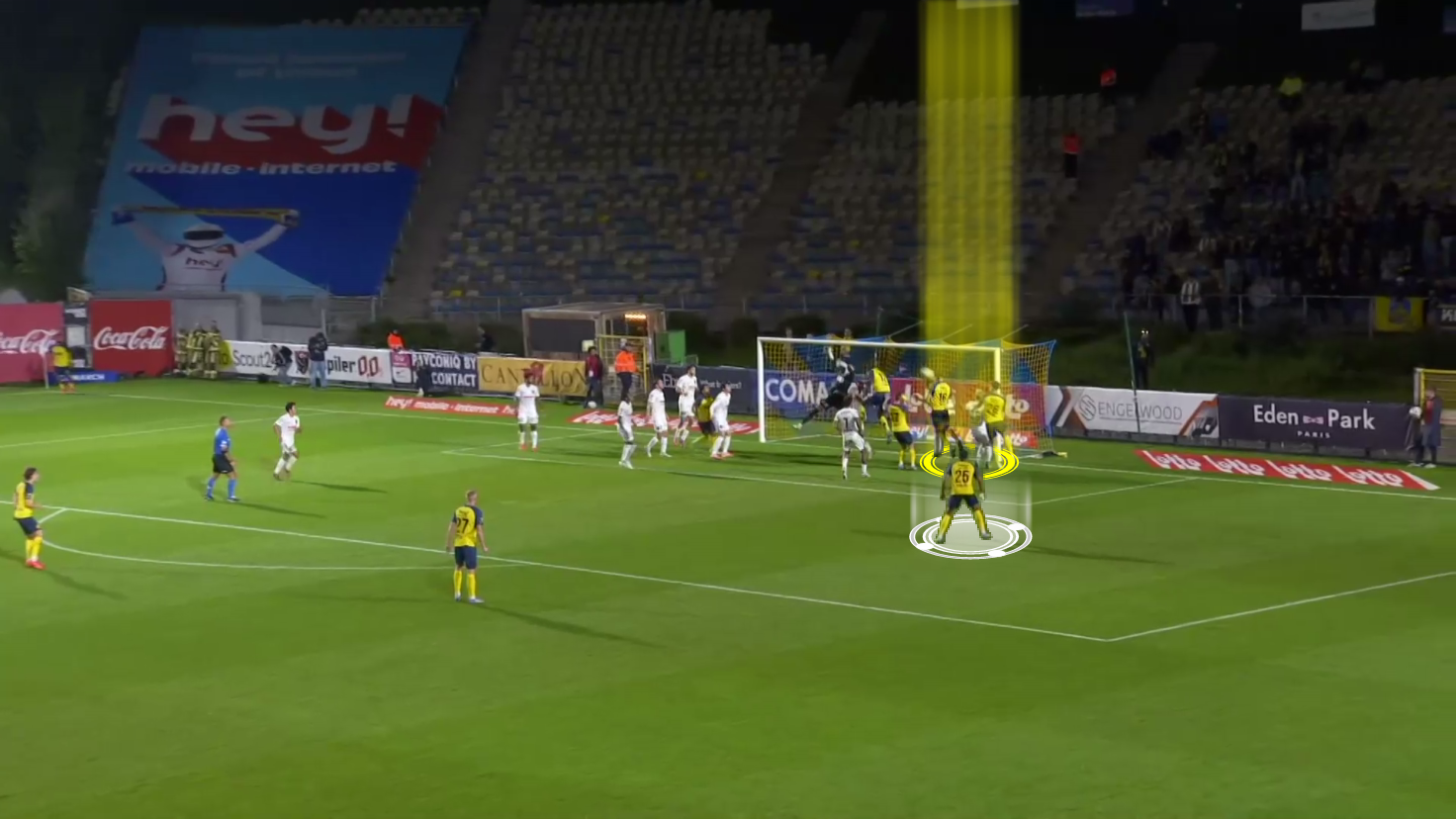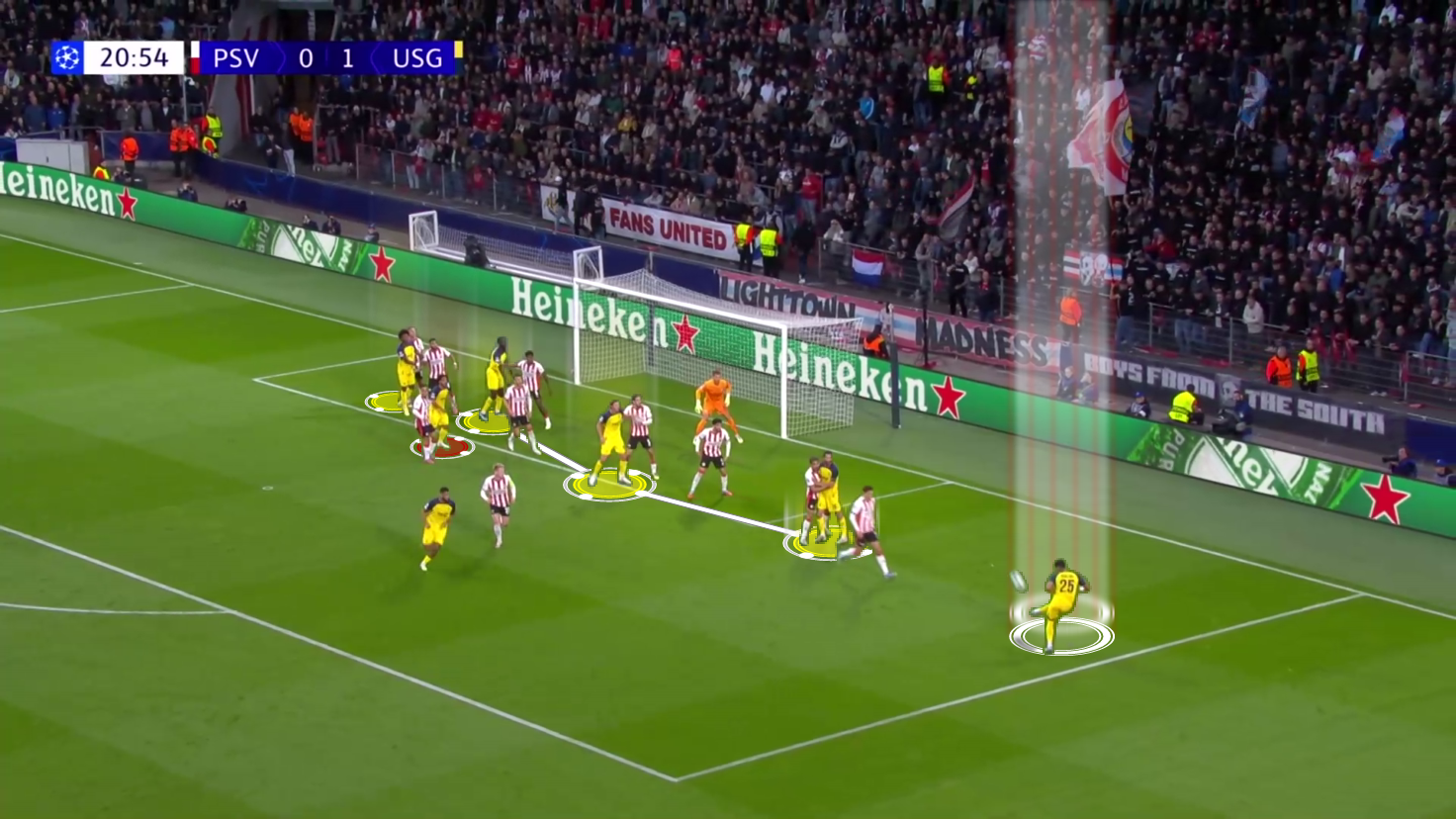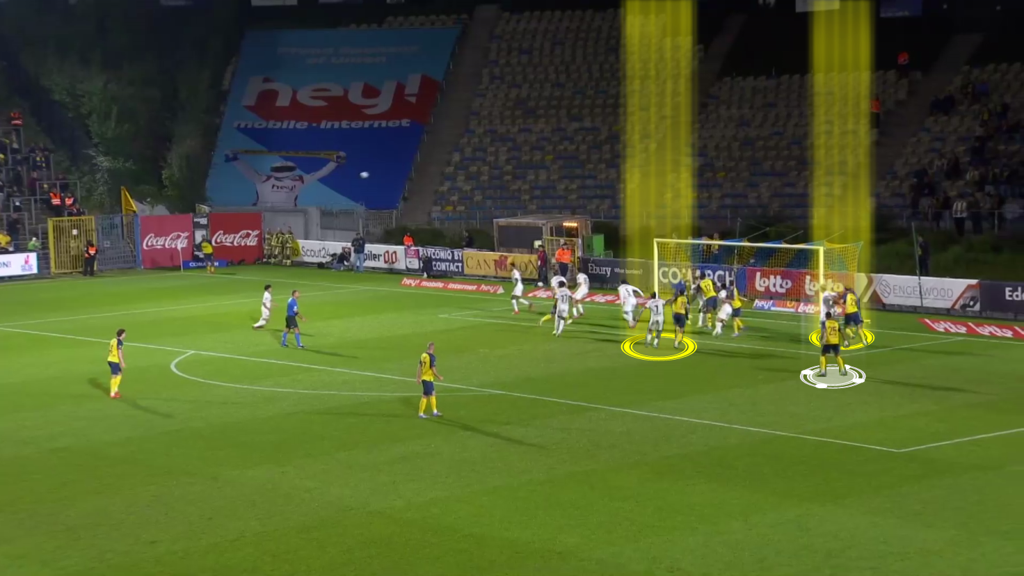 That’s why you can see four players (yellow) framing the goal, with a player behind them (red).