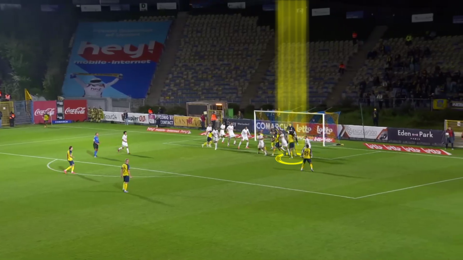 However, the cross is overhit, and here we can see the importance of this additional player (white) while the two targeted players block their two-man markers when they realise the ball won’t land in the targeted area, knowing they have an additional player to collect it.