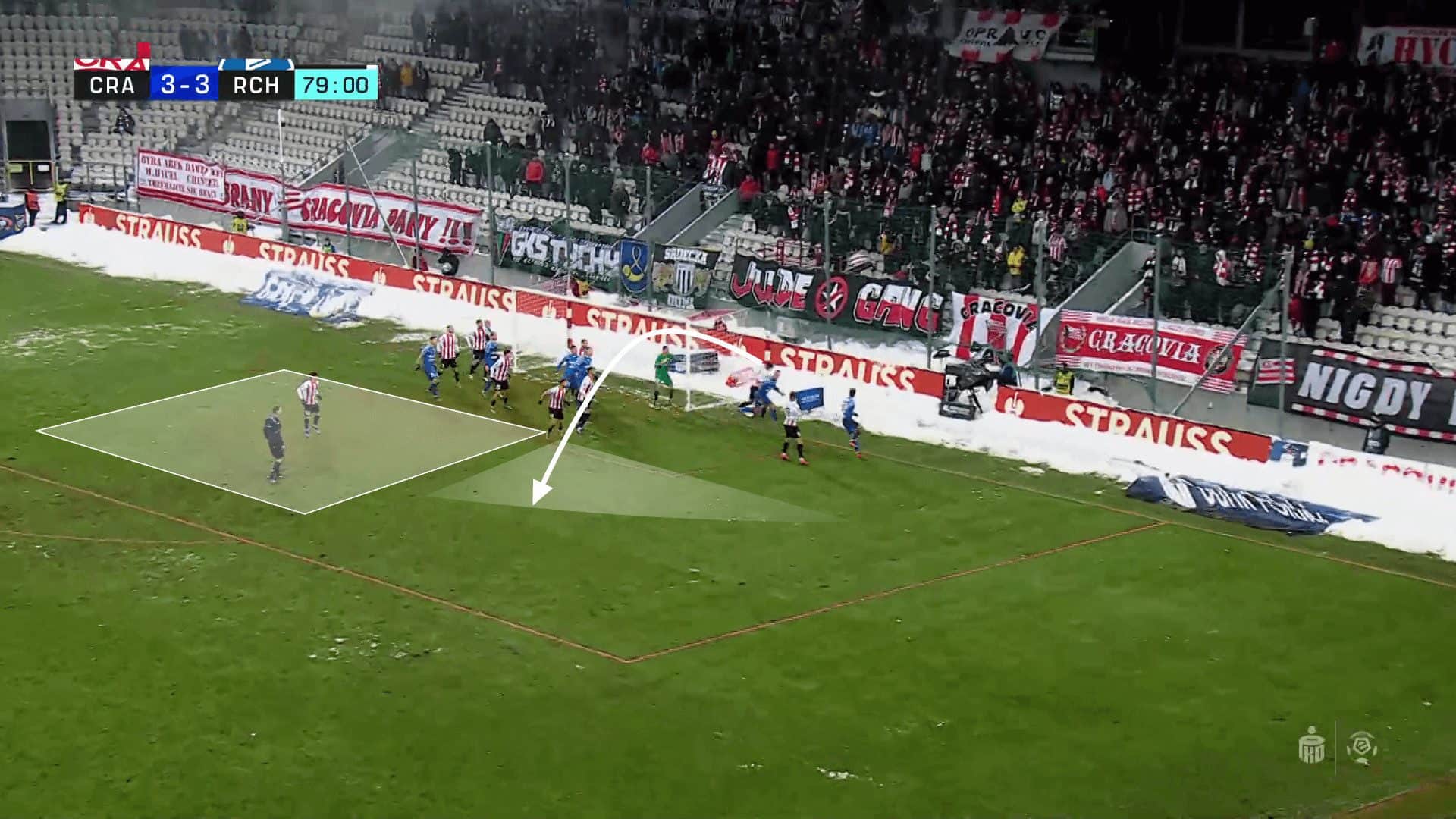 This set-piece analysis has detailed both the benefits and flaws of Ruch Chorzów’s corner kick design in their fight for top-flight survival. Packing the six-yard box has proven to be an effective chance-creation method, especially as it leads to so many chances created from loose balls in the second, but the failure to control the zones surrounding the penalty area should be addressed. Furthermore, some steps can be taken to both provide the near-side attackers with more space and time and increase the probability of making the first contact.