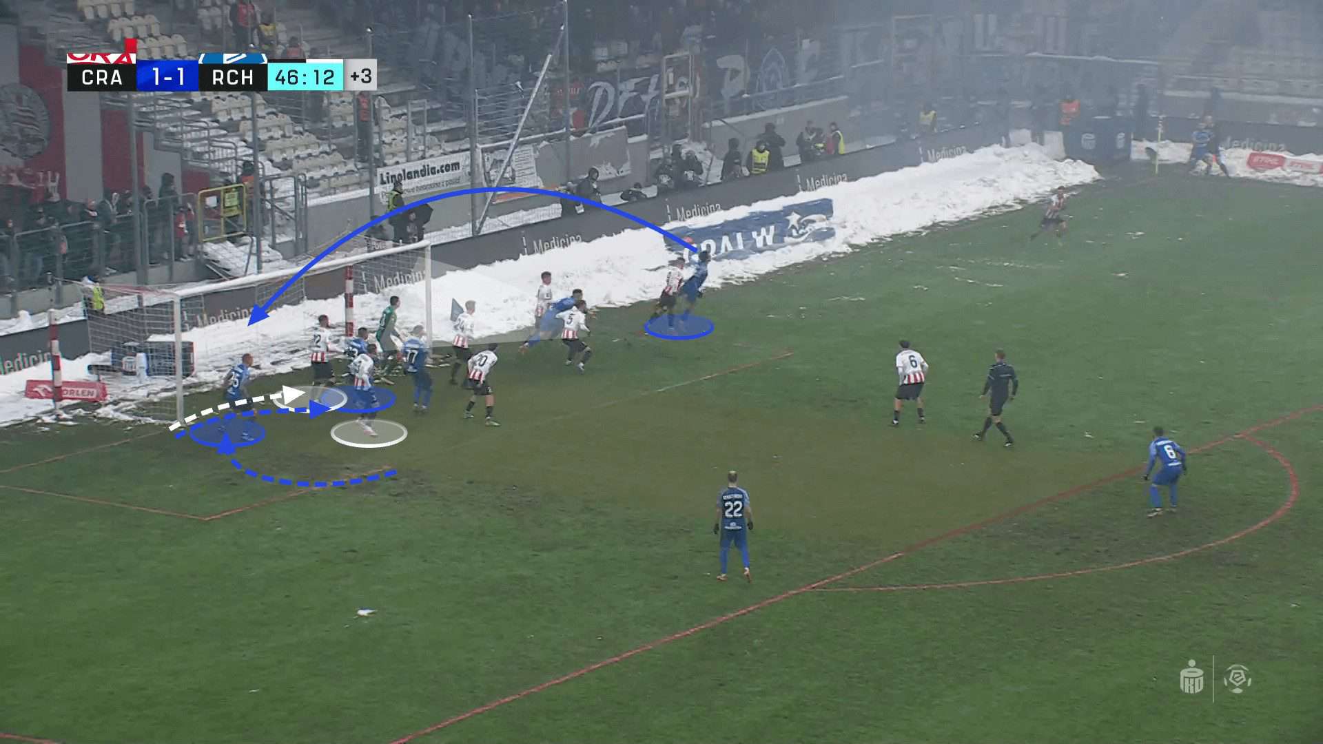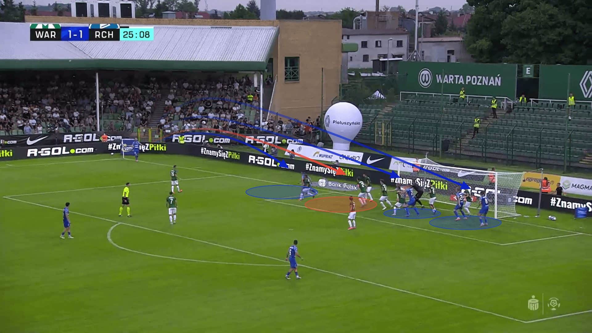 The intention of the near-side attacker should always be to header the ball into the part of the goal that is most open. Usually, goalkeepers come over to cover the goal’s near side, making the flick to the back post the most attractive option. While this has not been successful yet, Ruch Chorzów have the possibility to attack the near post more often. They utilise one player whose role is to block the goalkeeper and prevent them from moving from their spot. This is a flexible role, as the blocker can pivot around the goalkeeper to open up different parts of the goal. If Ruch Chorzów can make their routine even clearer for each attacker, they have a lot of untapped potential to make the most of.