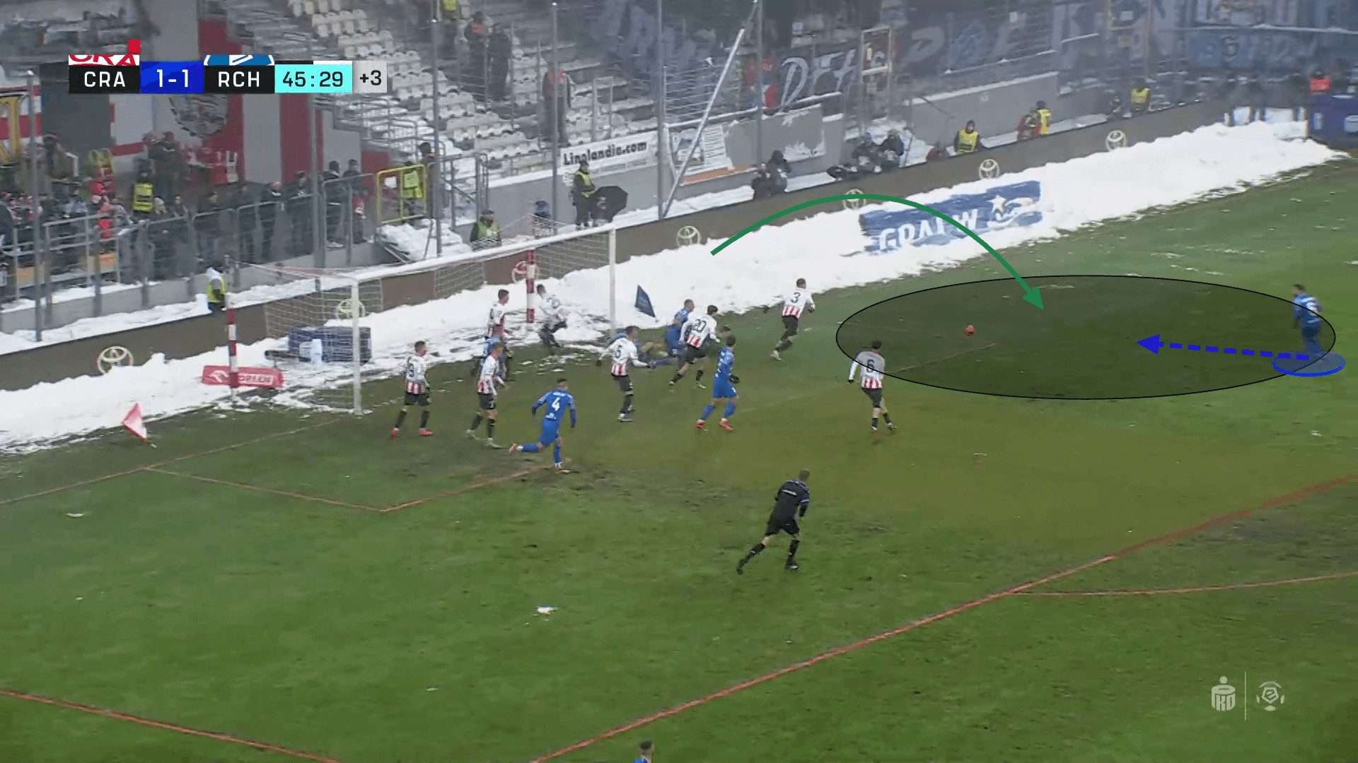 The headed flick on toward the far side of the goal must then be weighted perfectly, not too low to be cleared by a defender, and not too high, so it misses everyone at the back post. The quality of the flick-on is crucial and depends on the ability of the player performing it; however, increasing the amount of space the attacker has can aid the quality of the flick-on. If an attacker is having to rush towards the space whilst battling a defender and flicking the ball, it may result in inconsistent results. If Ruch Chorzów can alter the landscape and create situations where the attacker can arrive in space, slow down, and attempt the flick-on with no opposition challenge, the accuracy and consistency of these flick-ons would increase, creating more clear-cut chances.