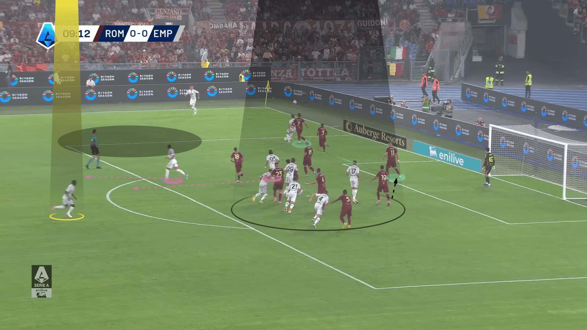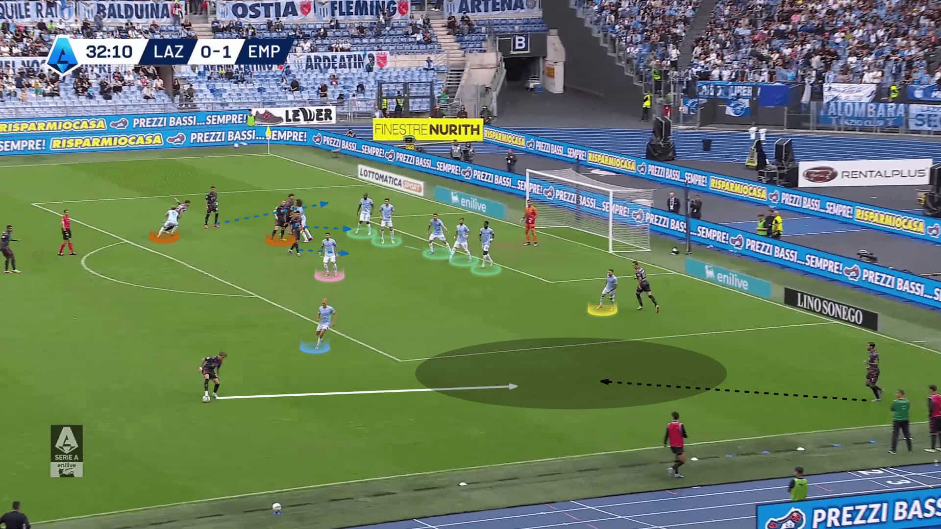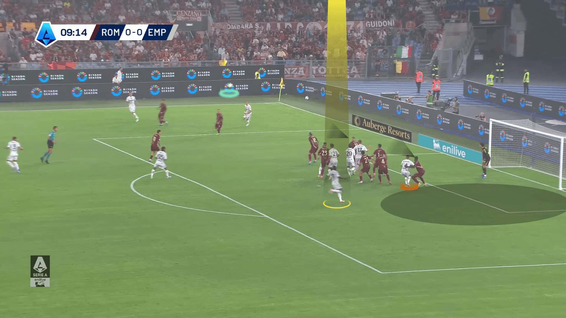 Empoli aim for the yellow player, who moves behind the second line to reach the same targeted area.