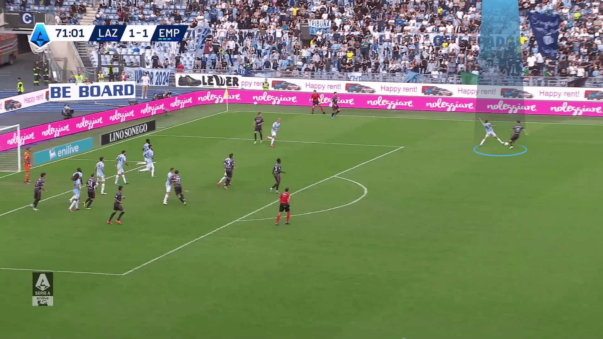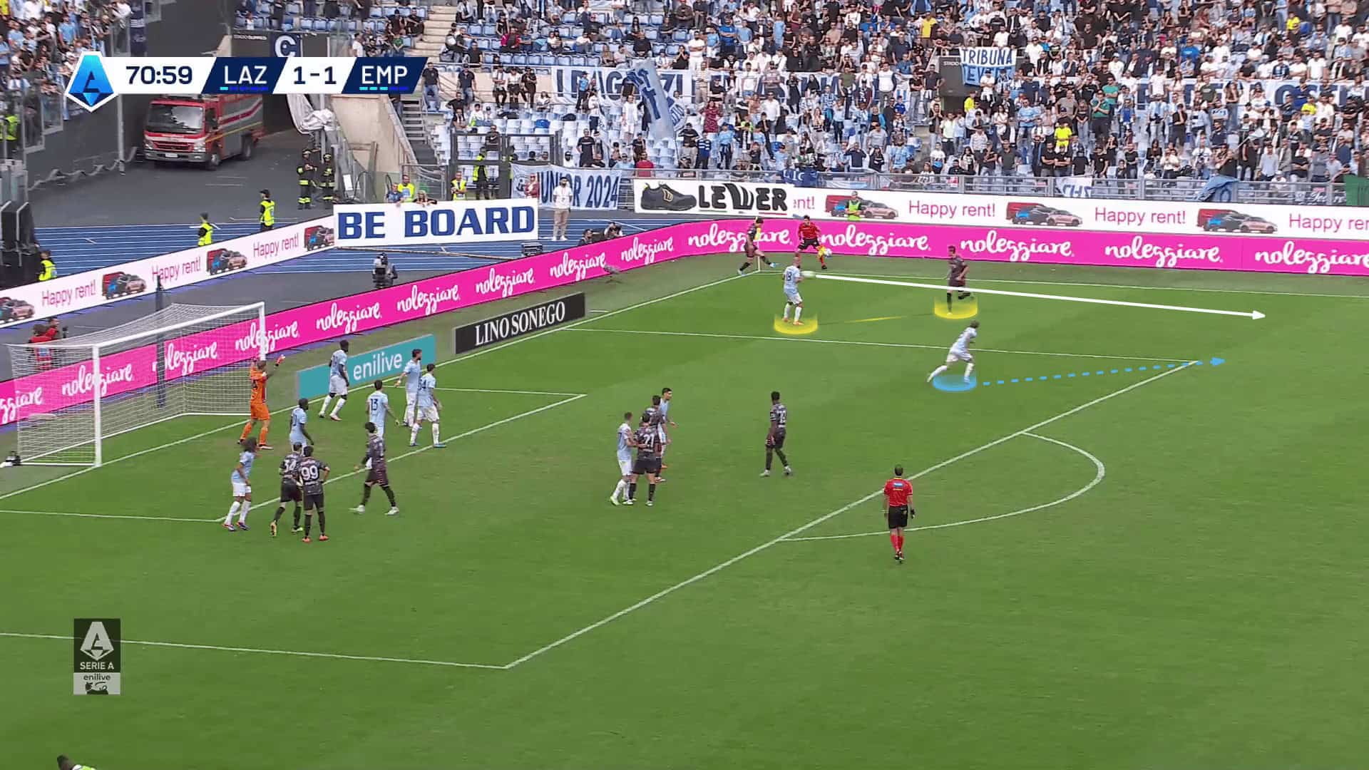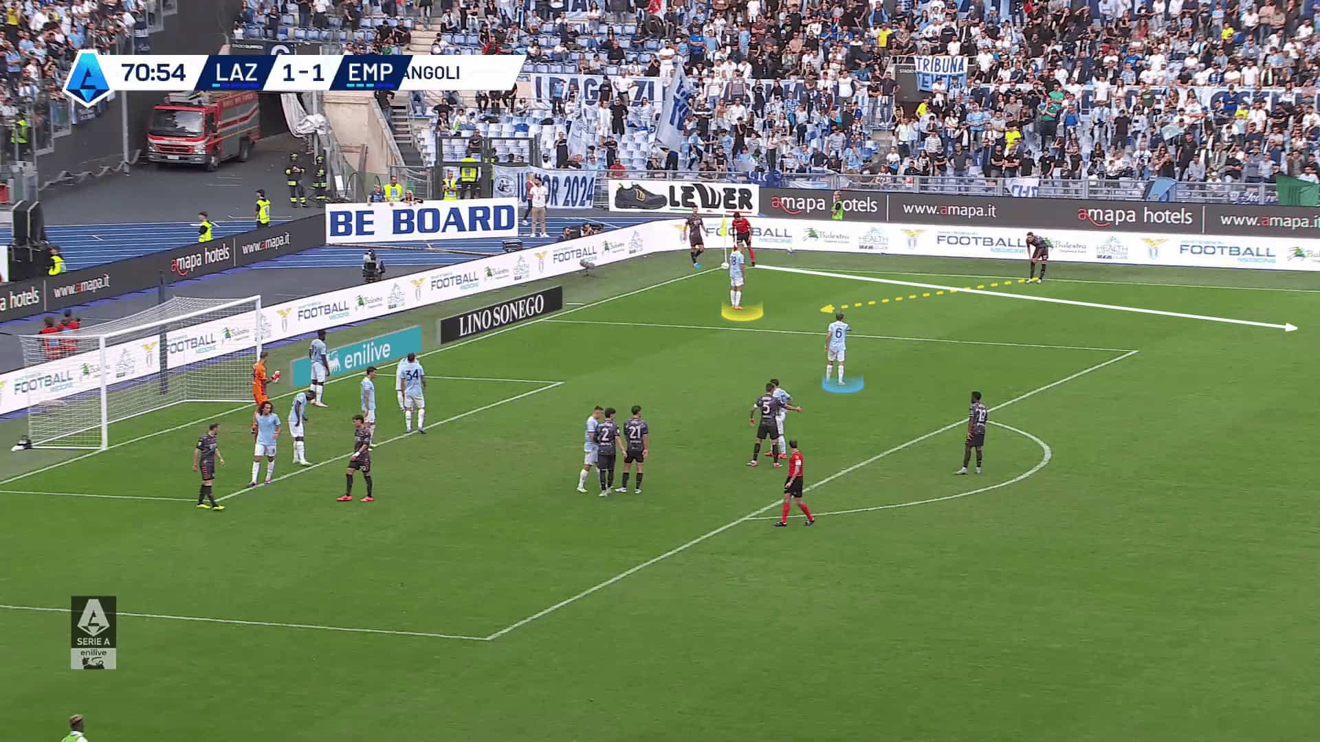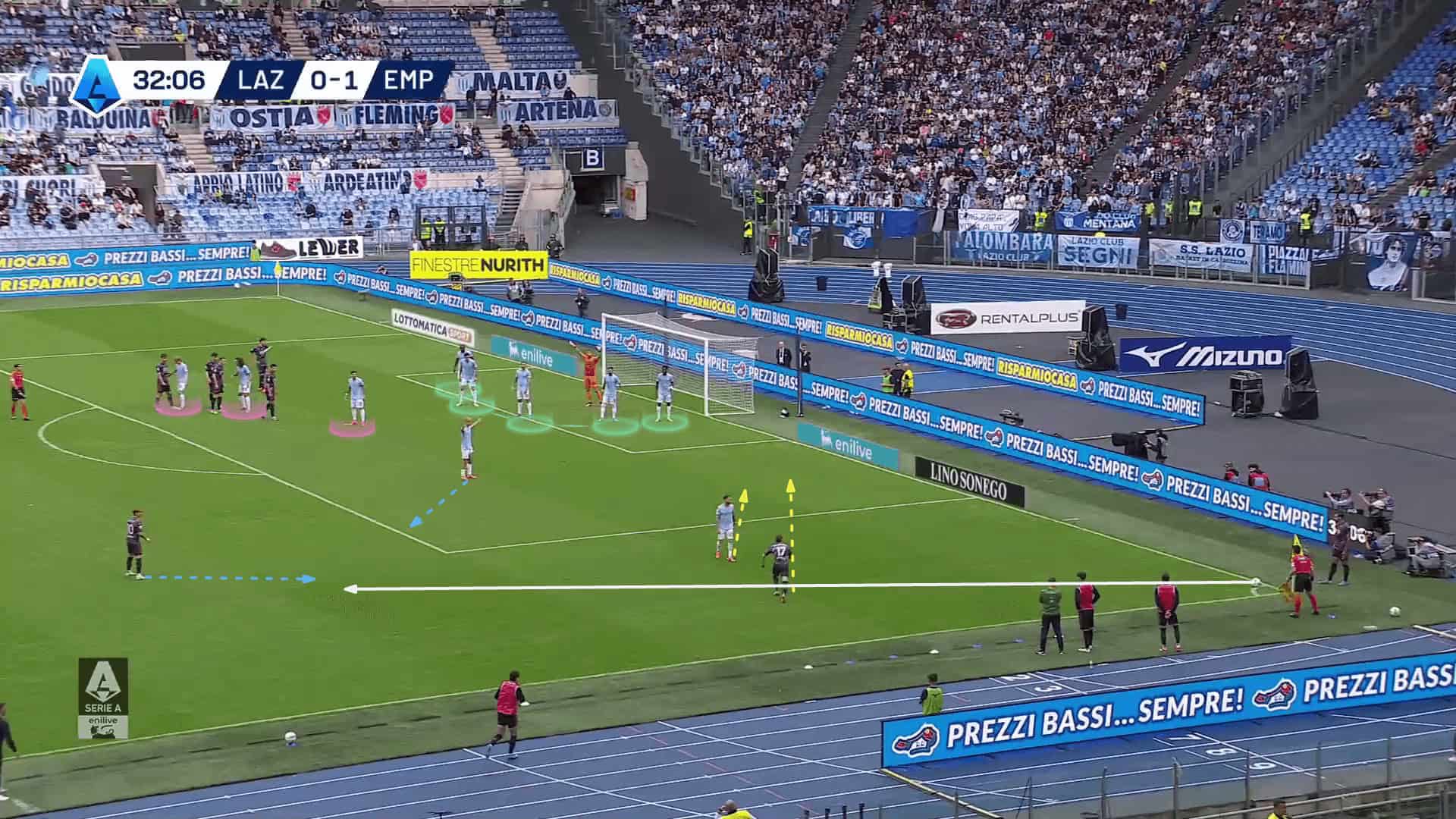 Empoli aim for the yellow player, who moves behind the second line to reach the same targeted area.