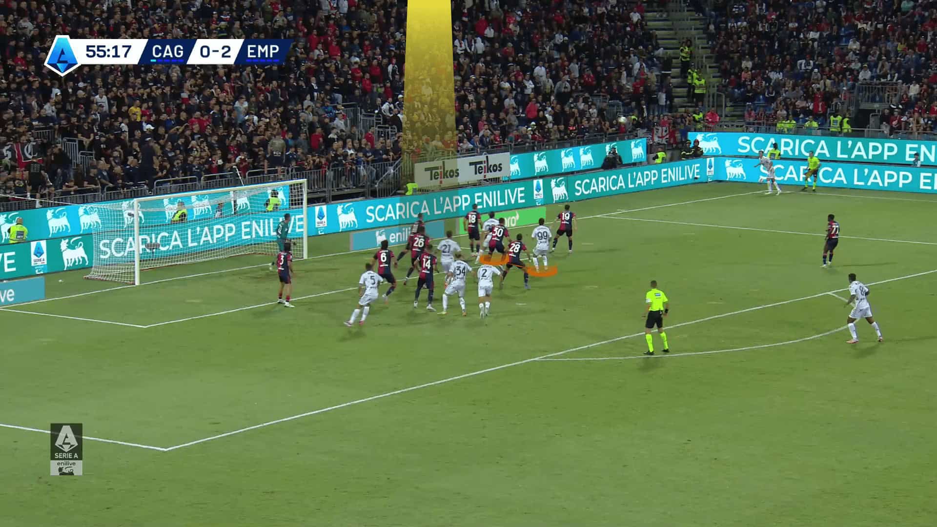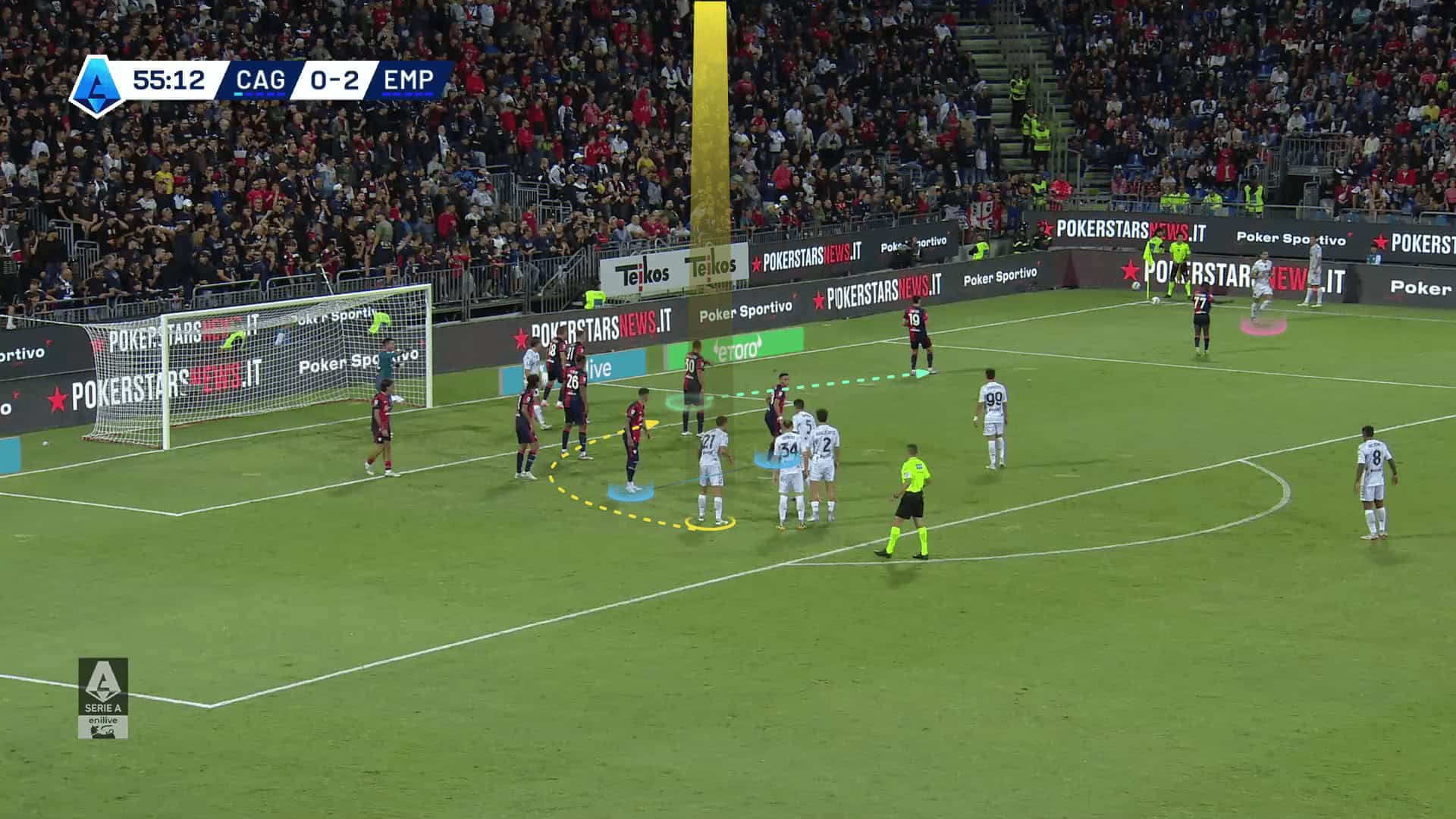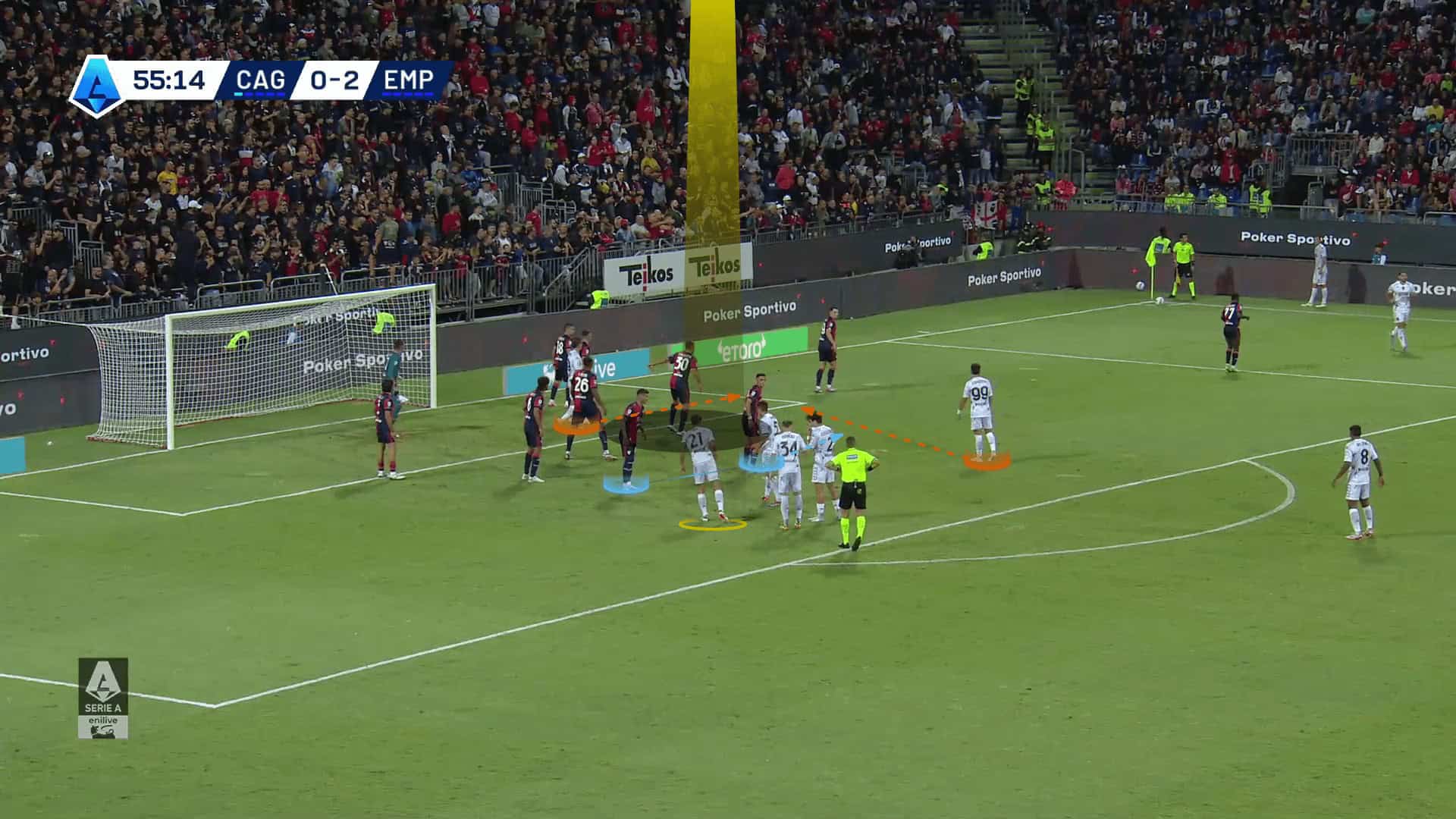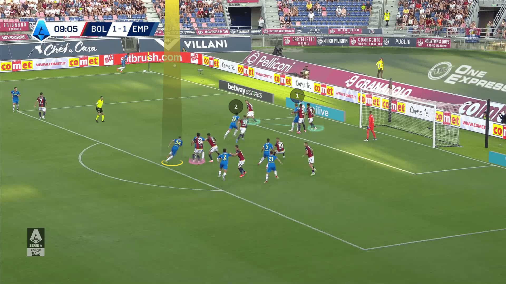 Empoli FC attacked the box with eight players, meaning there is only one player left in the back (yellow) who will be the targeted player, but why did they do that, and where are the rebound defenders?