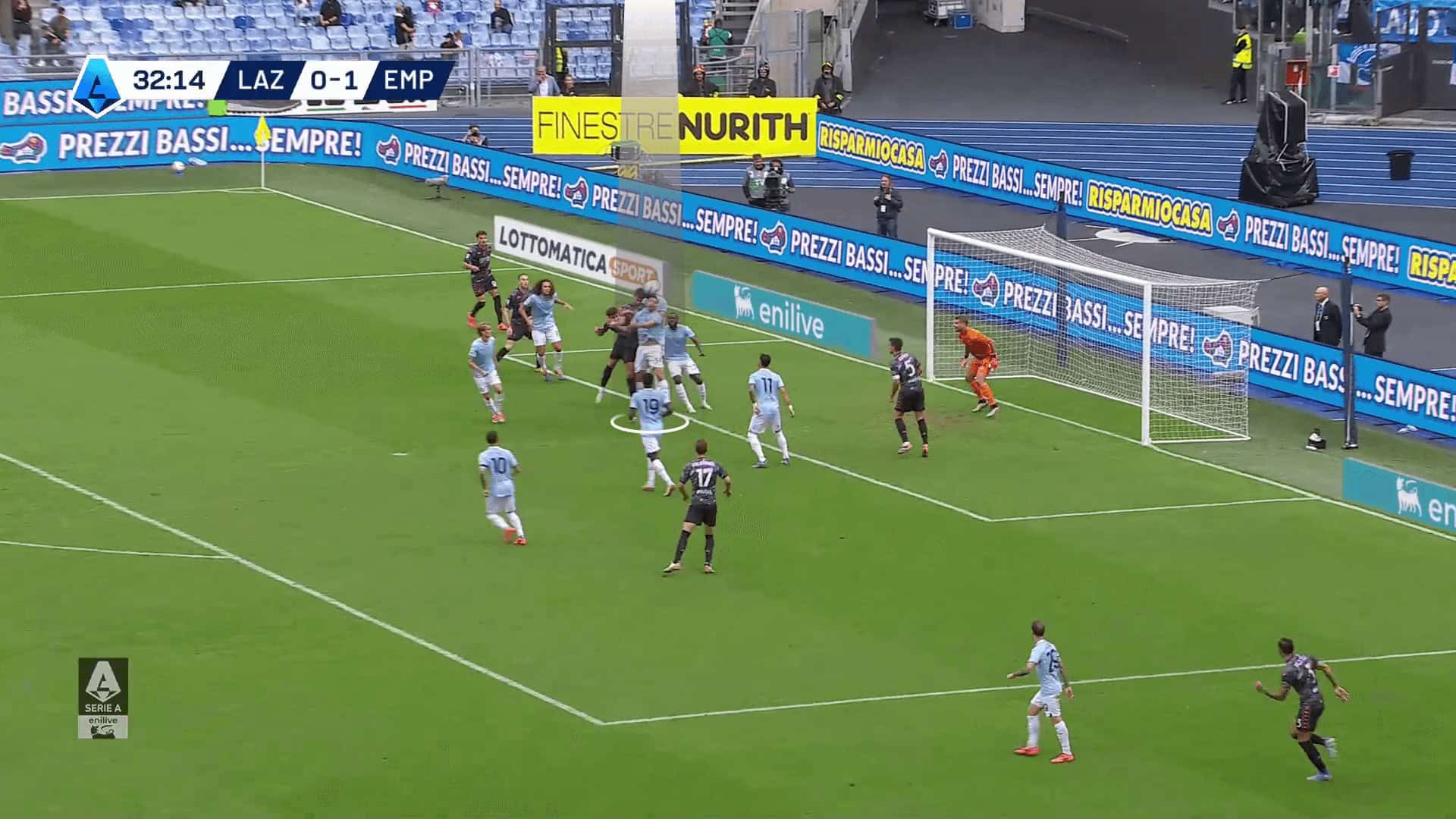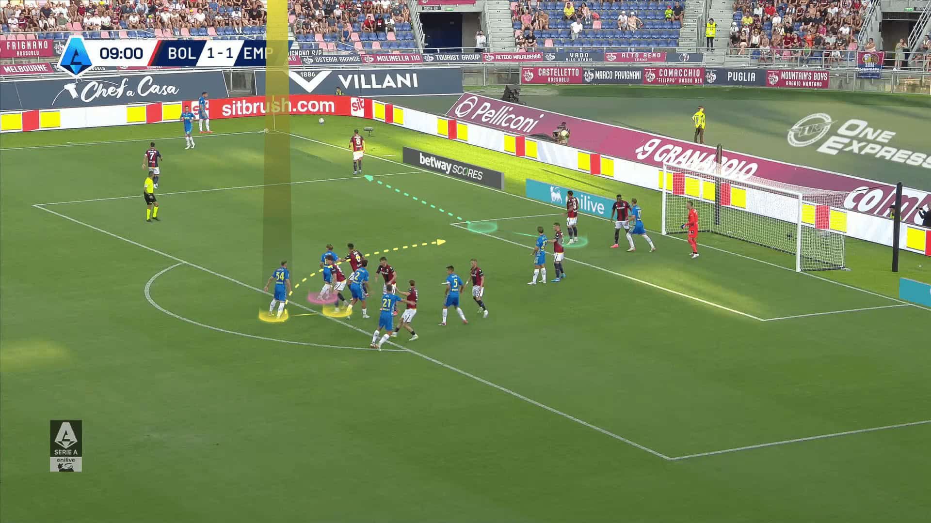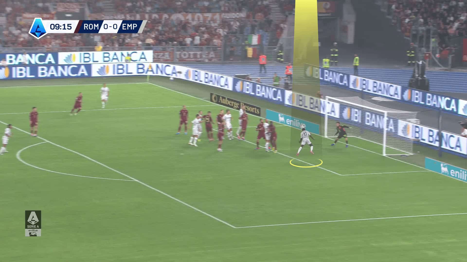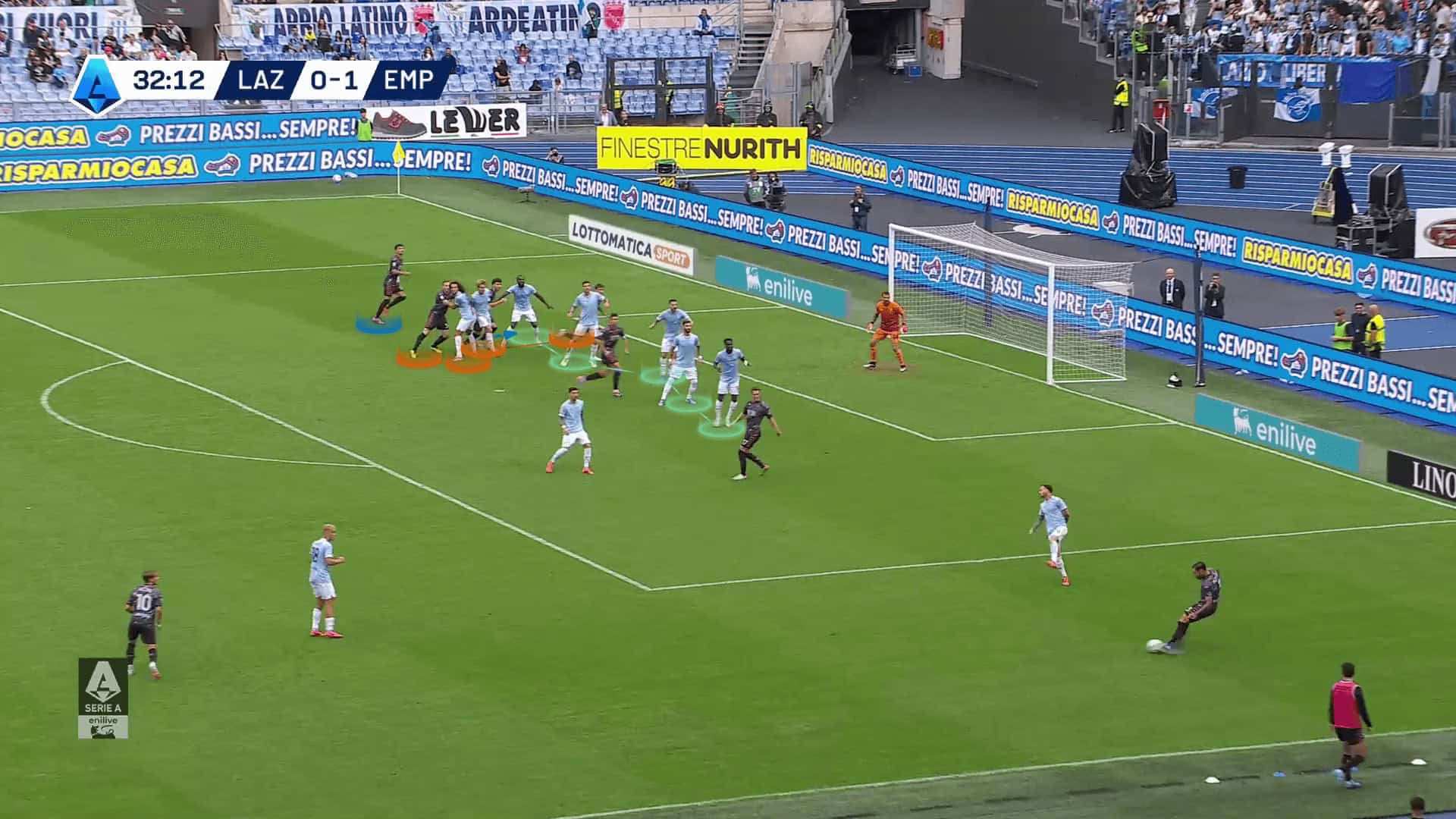 Empoli FC attacked the box with eight players, meaning there is only one player left in the back (yellow) who will be the targeted player, but why did they do that, and where are the rebound defenders?