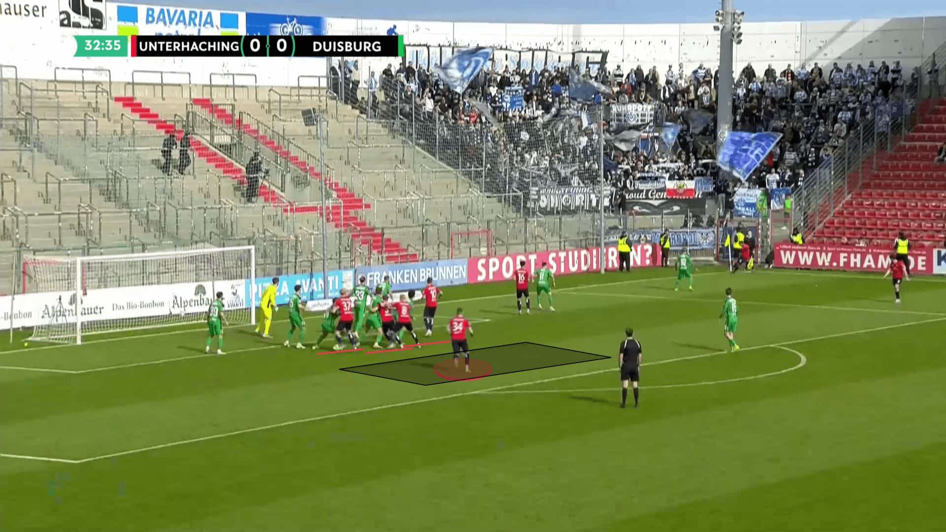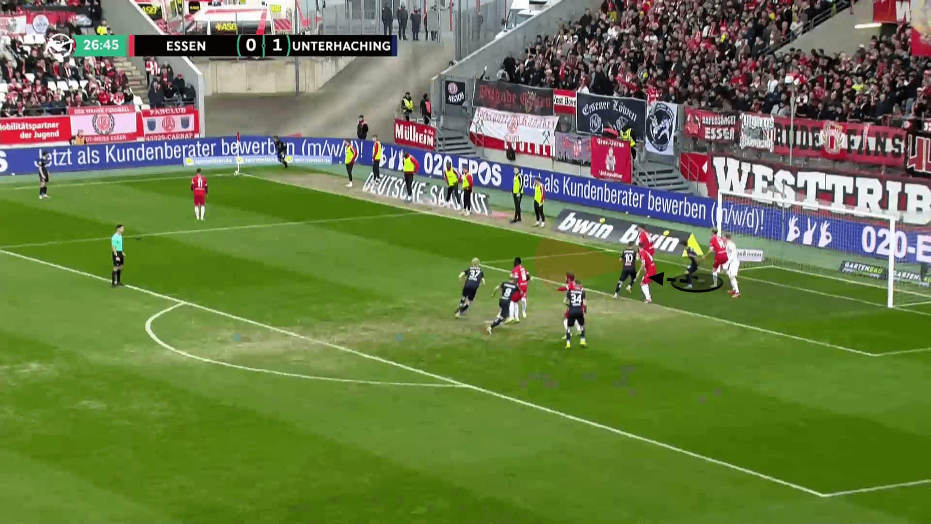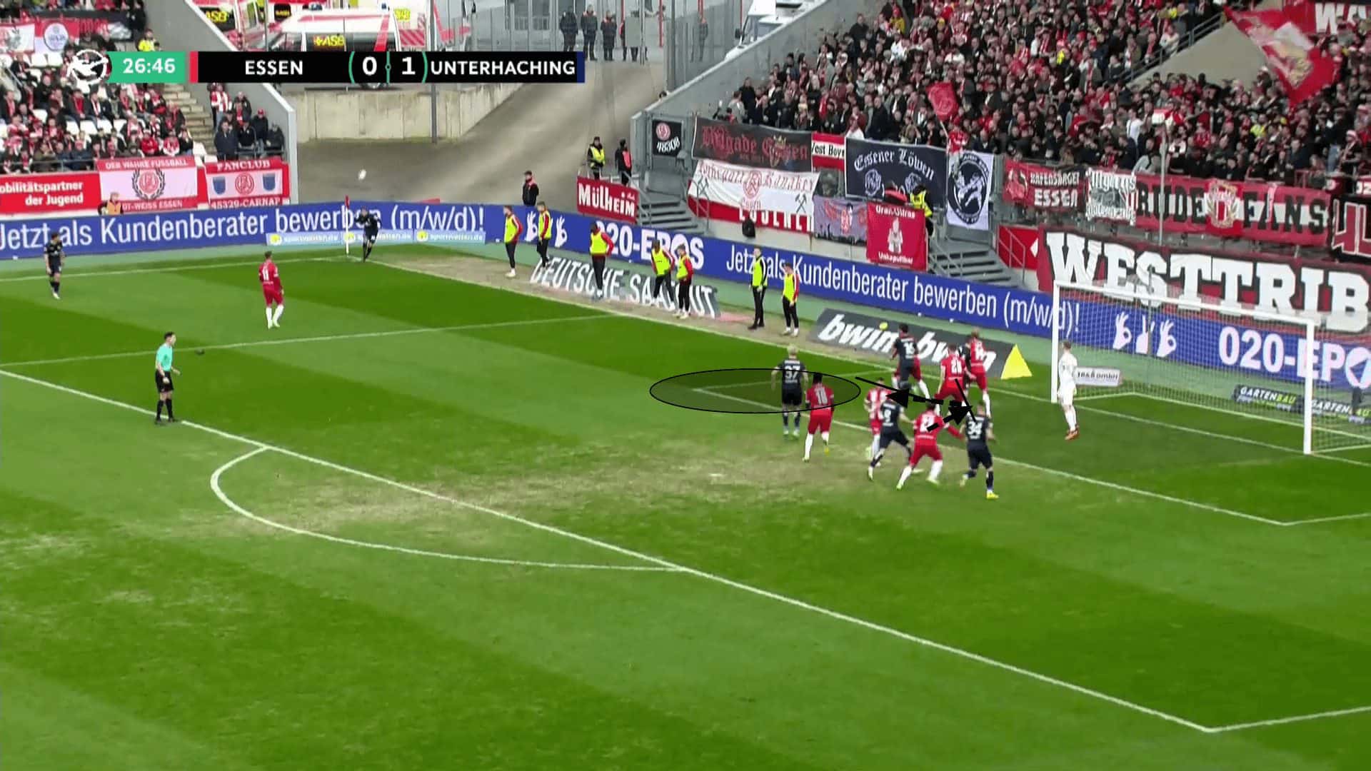 As a result, based on the different zones available to target in the image below, Unterhaching attempt to make the task as easy as possible for their players, with the intent to attack the nearest horizontal spaces available, at the near side of the six-yard box. In doing so, the risk of crosses being underhit is almost eliminated, as even passes on the floor into the near areas will reach the target. Even in situations like the one below, where a defender is in front of the corner taker, the corner taker has a lot of space to hit to ensure the ball reaches the area in front of the six-yard box.