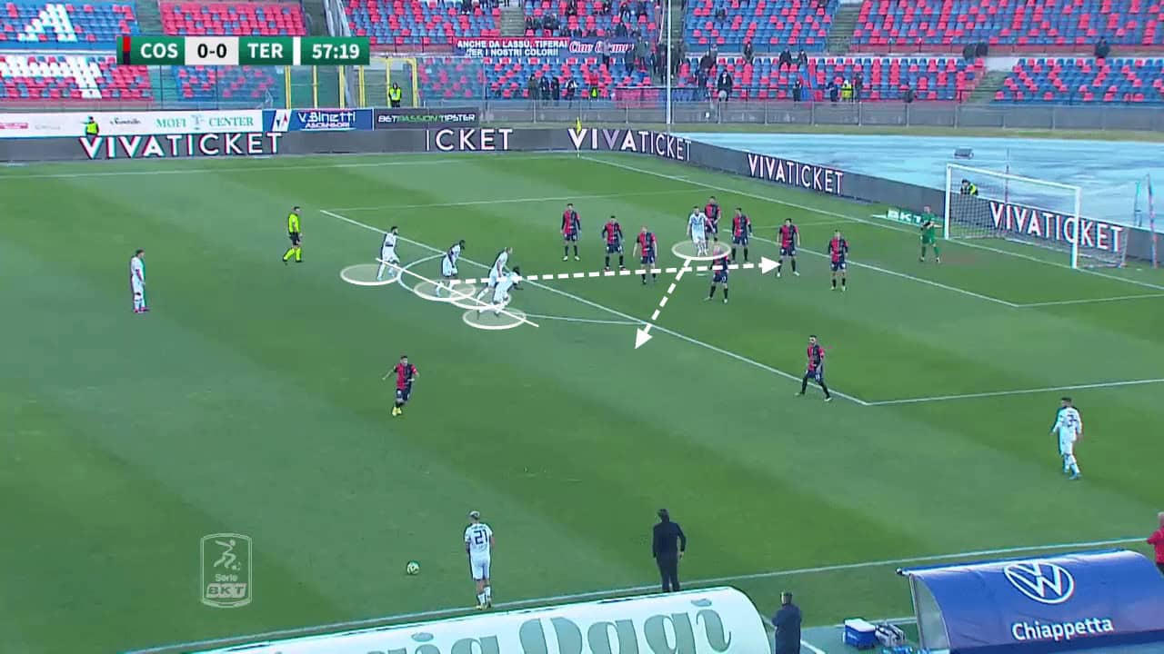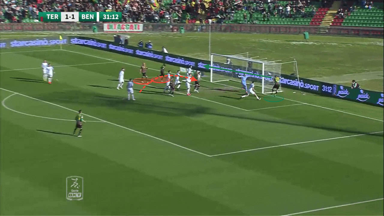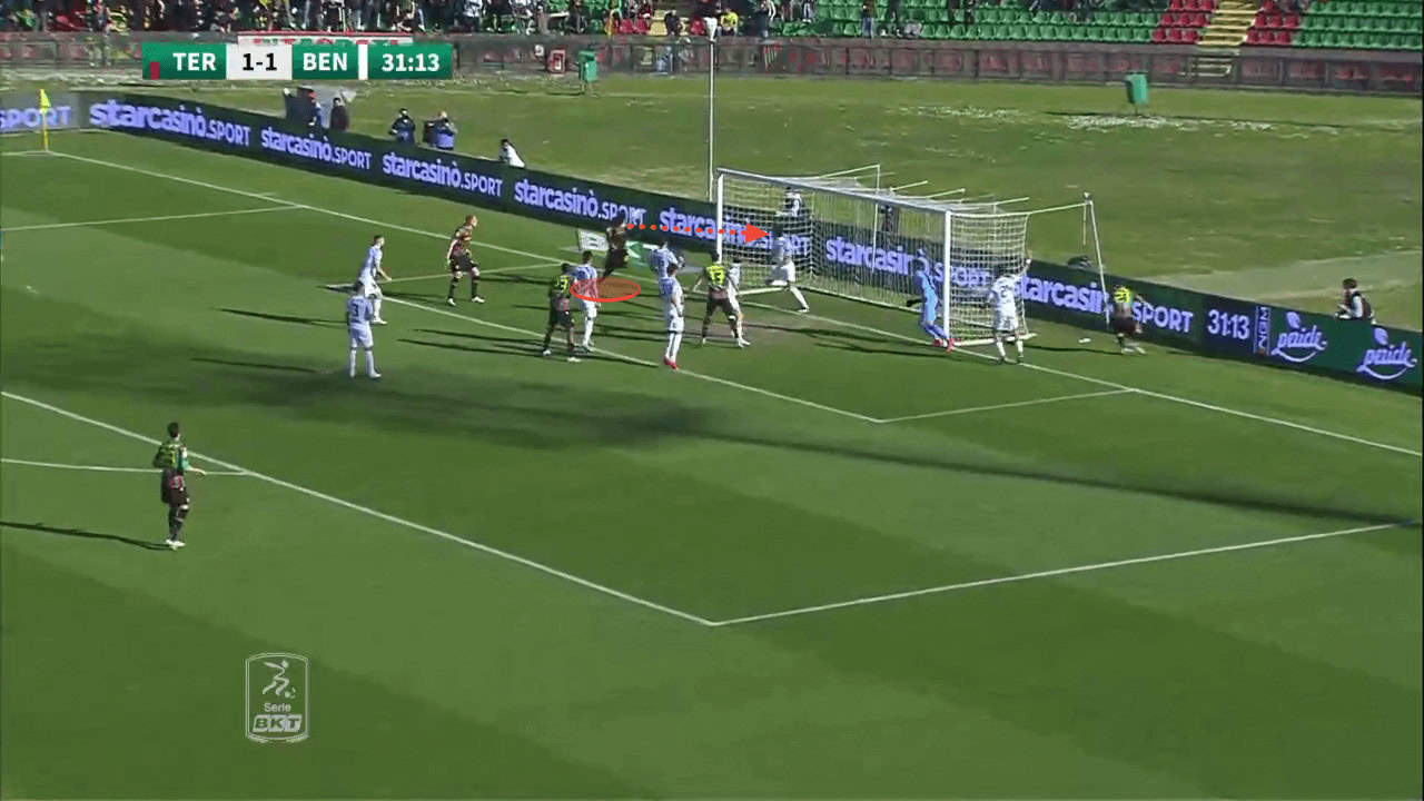 We can see here, the ball is then headed in from a few yards out after the routine has allowed Ternana to create a clear-cut chance. The players at the far post are scattered around to make sure one of them can reach the ball, no matter where the ball may bounce to.