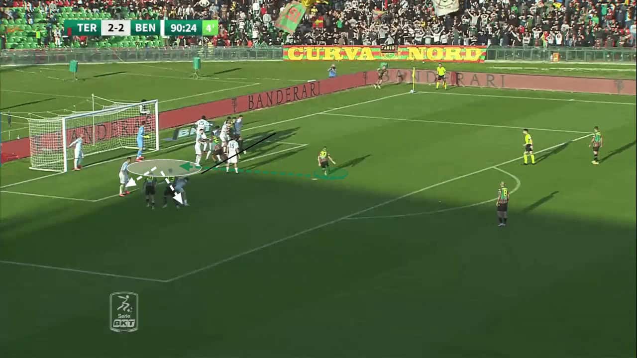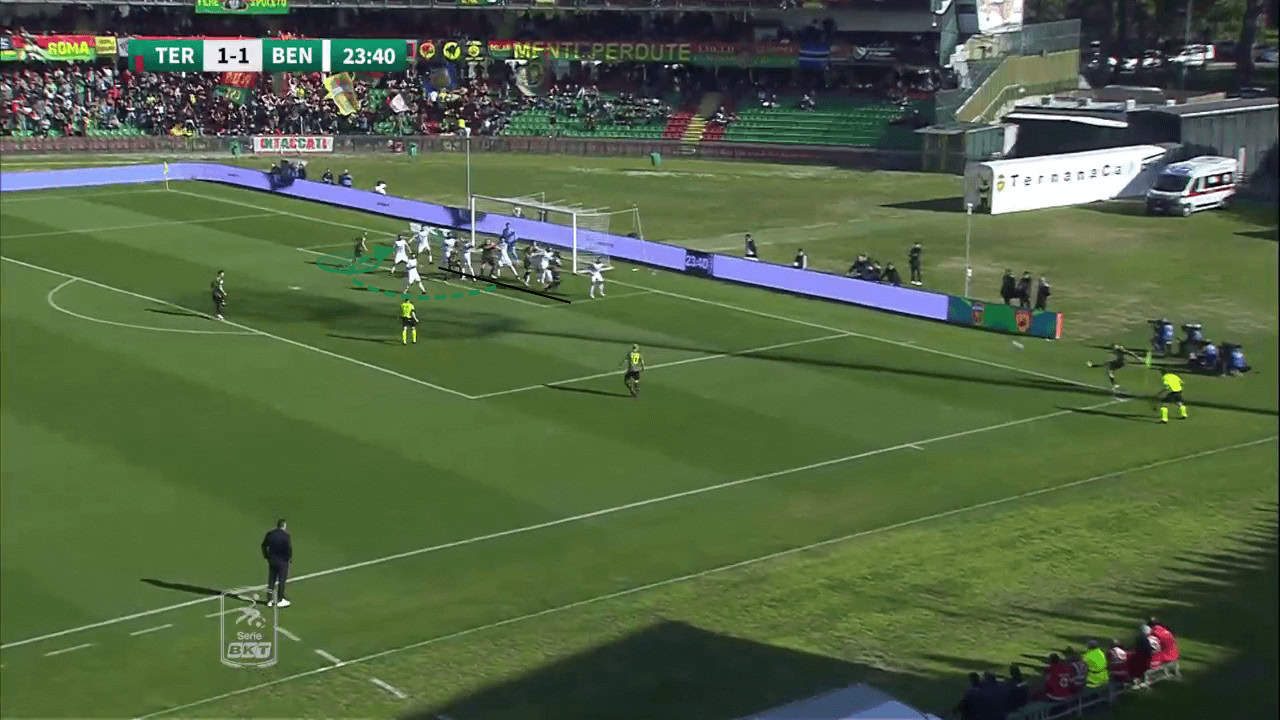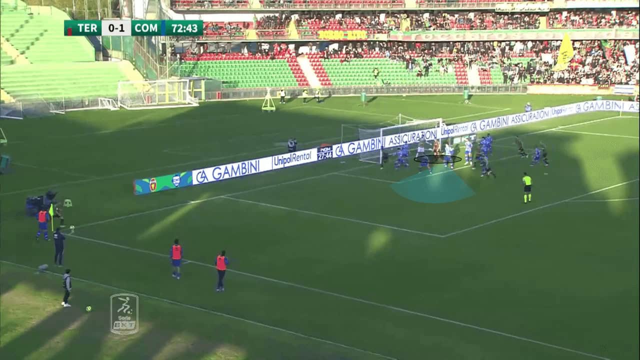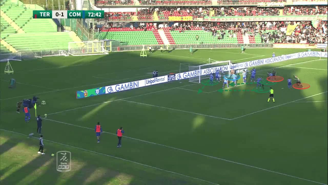 We can see here, the ball is then headed in from a few yards out after the routine has allowed Ternana to create a clear-cut chance. The players at the far post are scattered around to make sure one of them can reach the ball, no matter where the ball may bounce to.