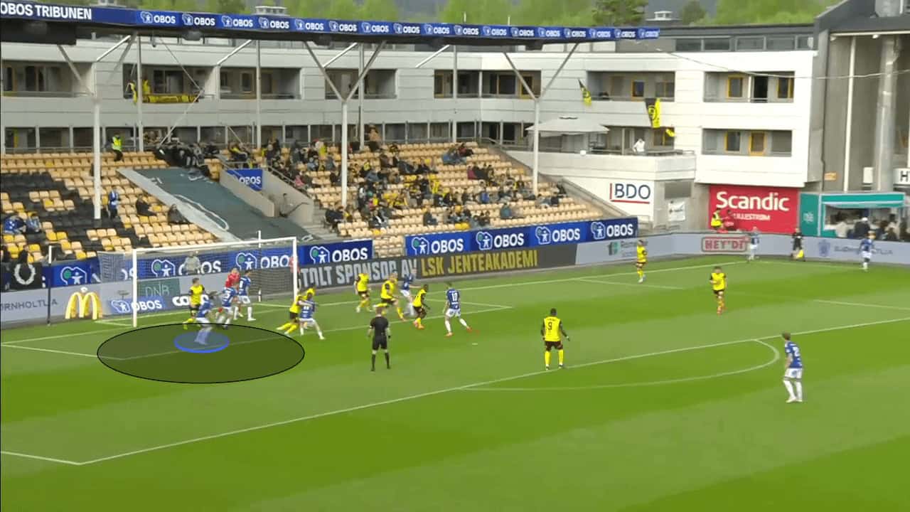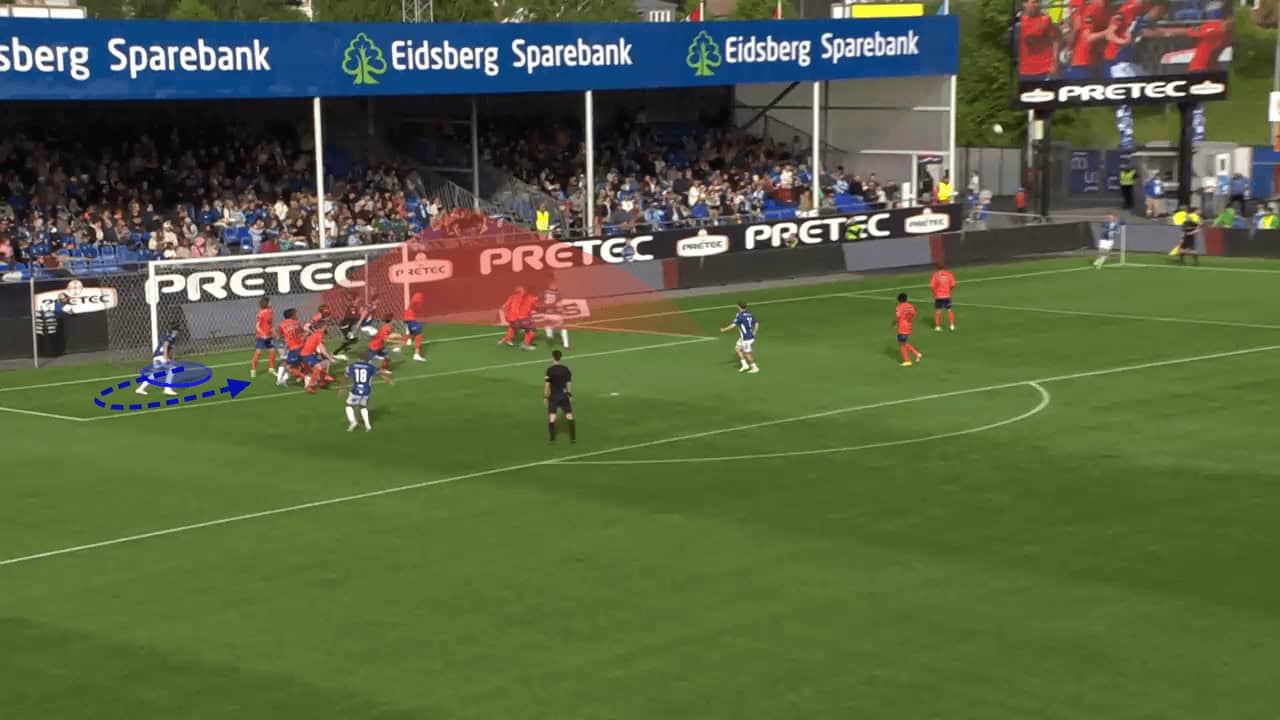 Furthermore, crowding the six-yard box enabled Sarpsborg to regularly create overloads in dangerous positions. In the early stages of this routine, opposition teams werent able to prepare well, and so there were occasions where a player at the back post could lurk unmarked. This provided the perfect opportunity for a player to have a free shot on goal from within six yards, which Sarpsborg capitalised on in this example below.