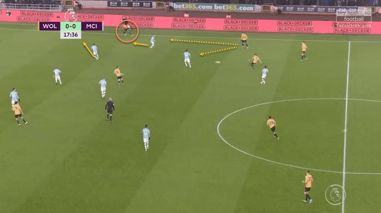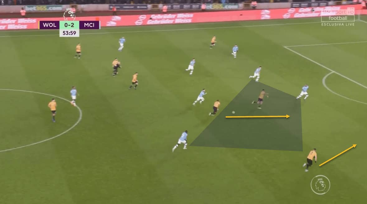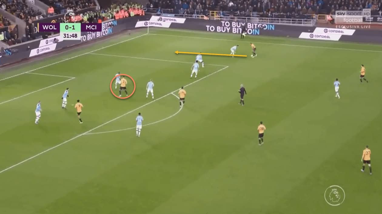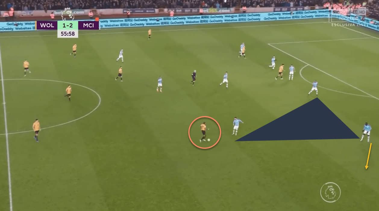 This partnership worked wonders for Wolves, as City were constantly putting out fires in this zone of the pitch. Once again, this tactic’s effectiveness is borne out from the fact that all three of Wolves’ goals came from that side of the pitch. Traoré’s positioning in central areas played a big part in this –