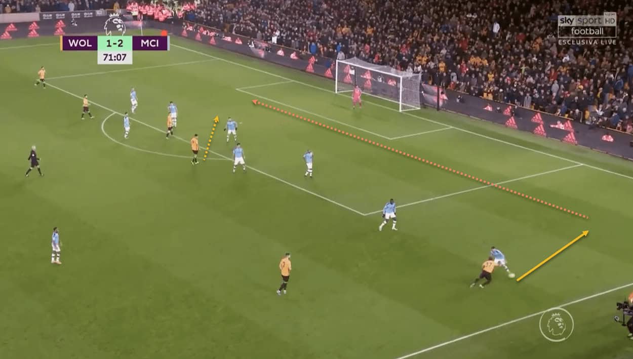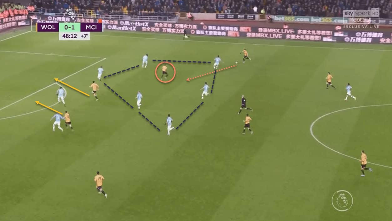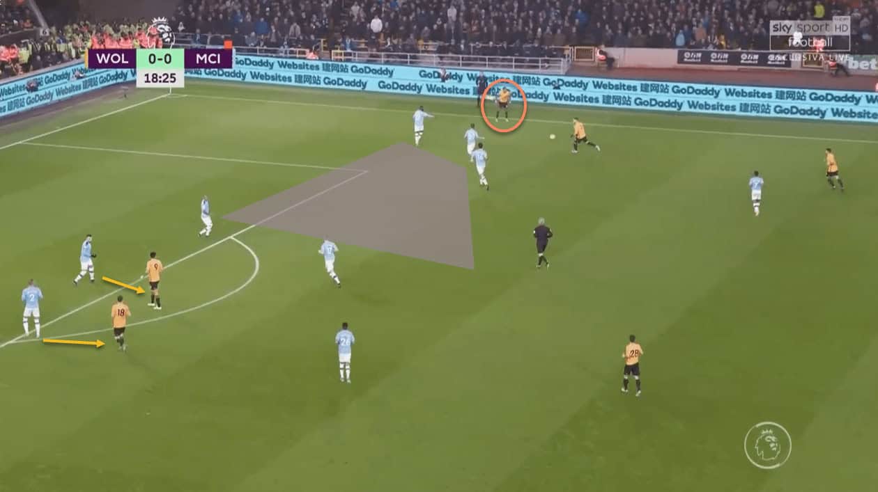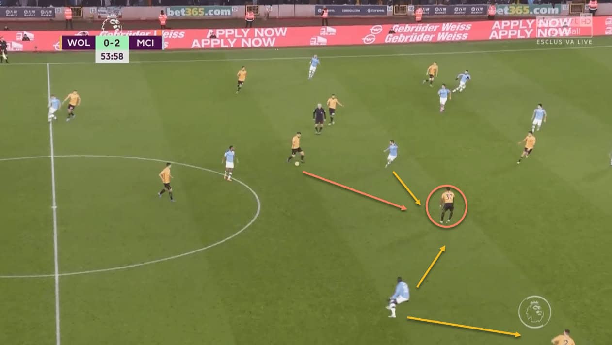 This partnership worked wonders for Wolves, as City were constantly putting out fires in this zone of the pitch. Once again, this tactic’s effectiveness is borne out from the fact that all three of Wolves’ goals came from that side of the pitch. Traoré’s positioning in central areas played a big part in this –