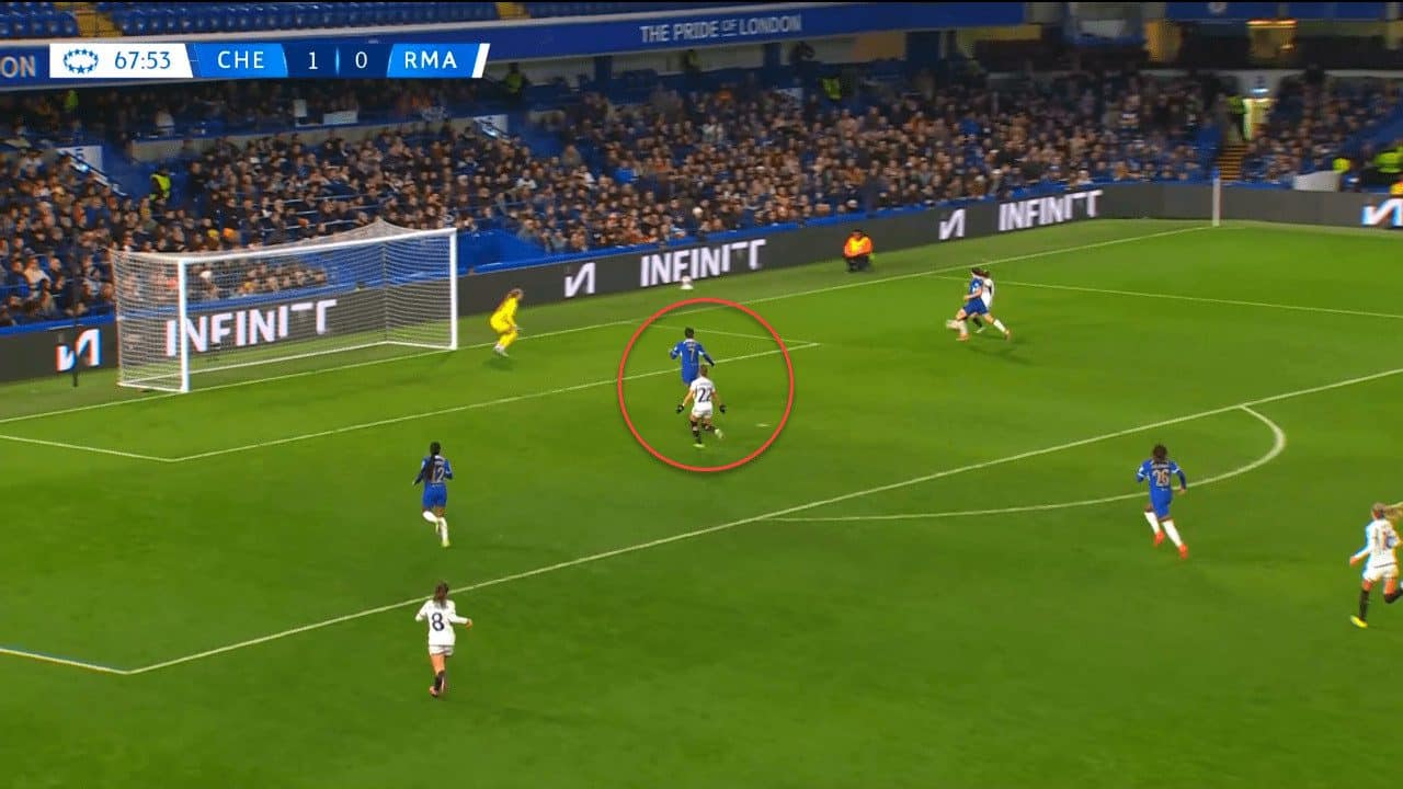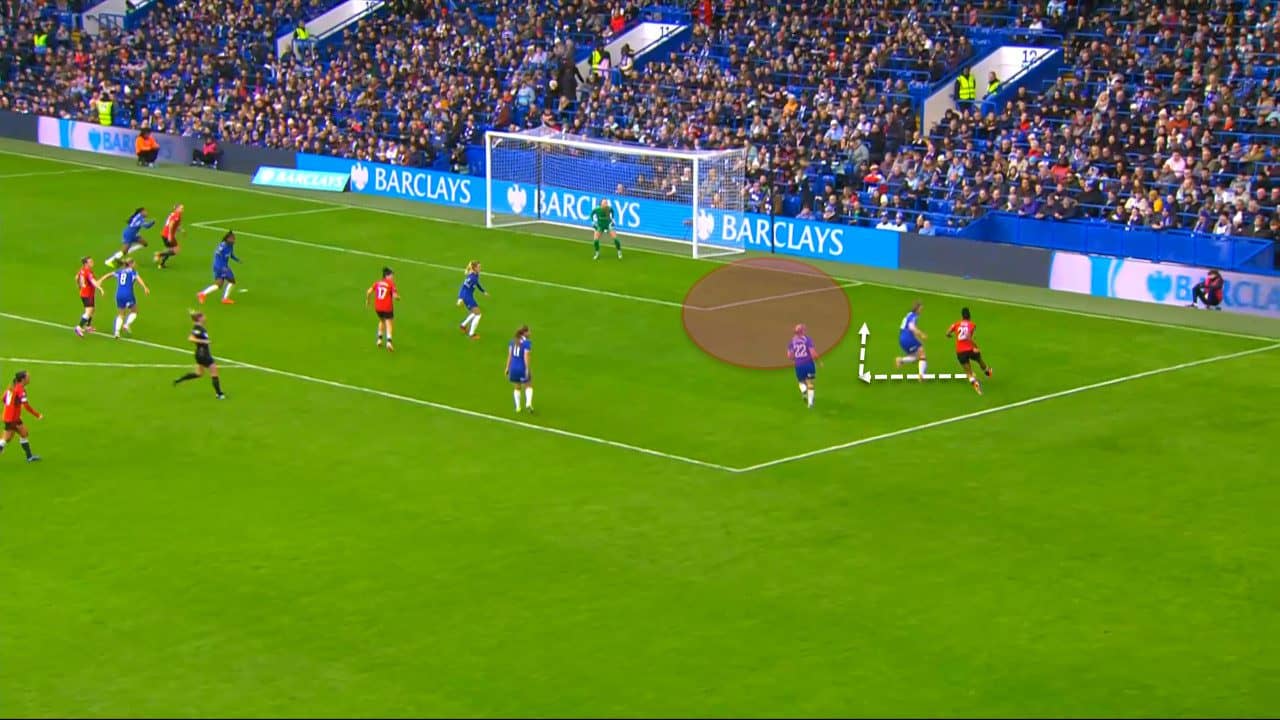 In this action from Manchester United, for instance, the winger was able to get past Charles and be unmarked inside the box before making an assist to her teammate without disturbance.