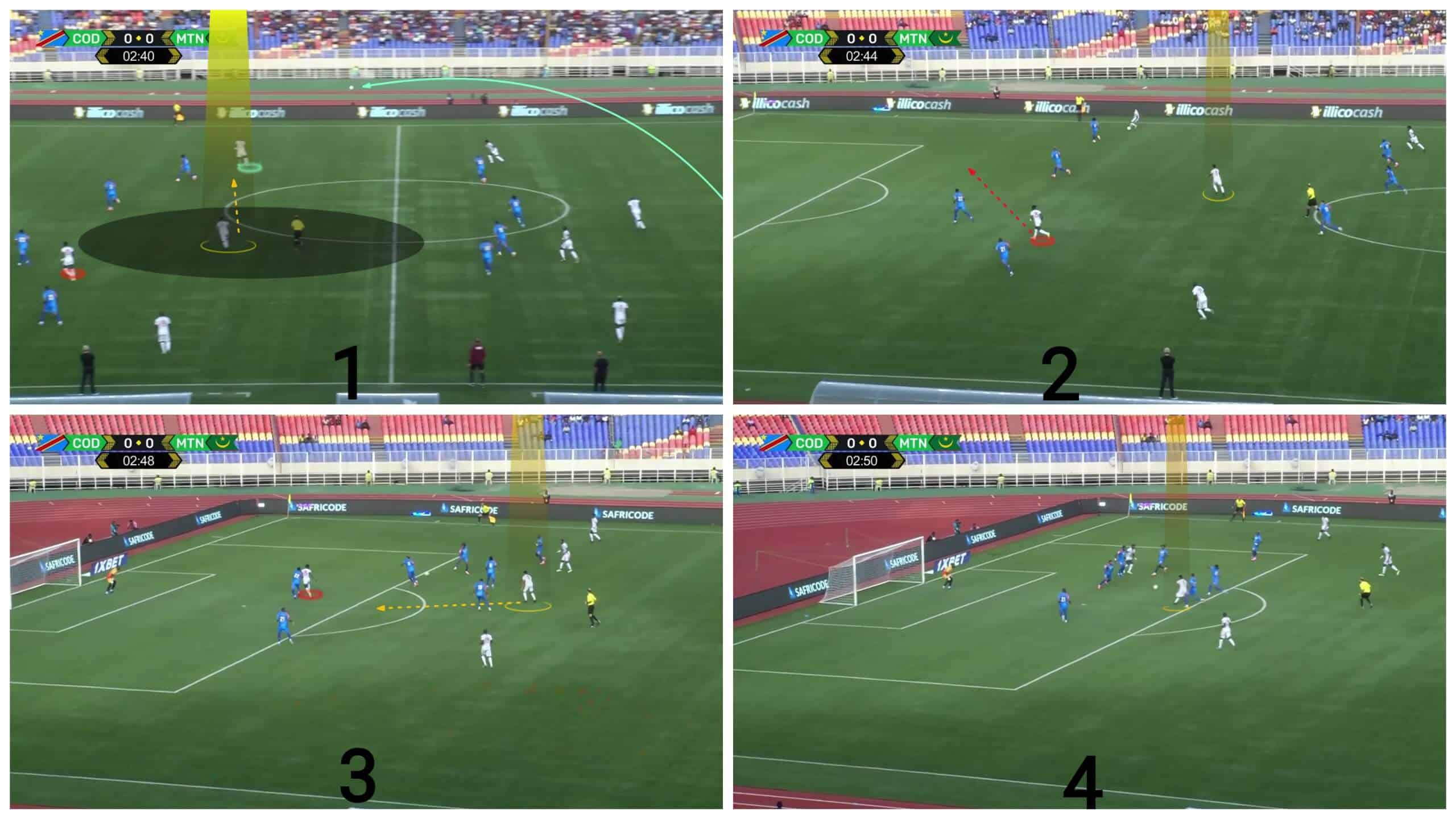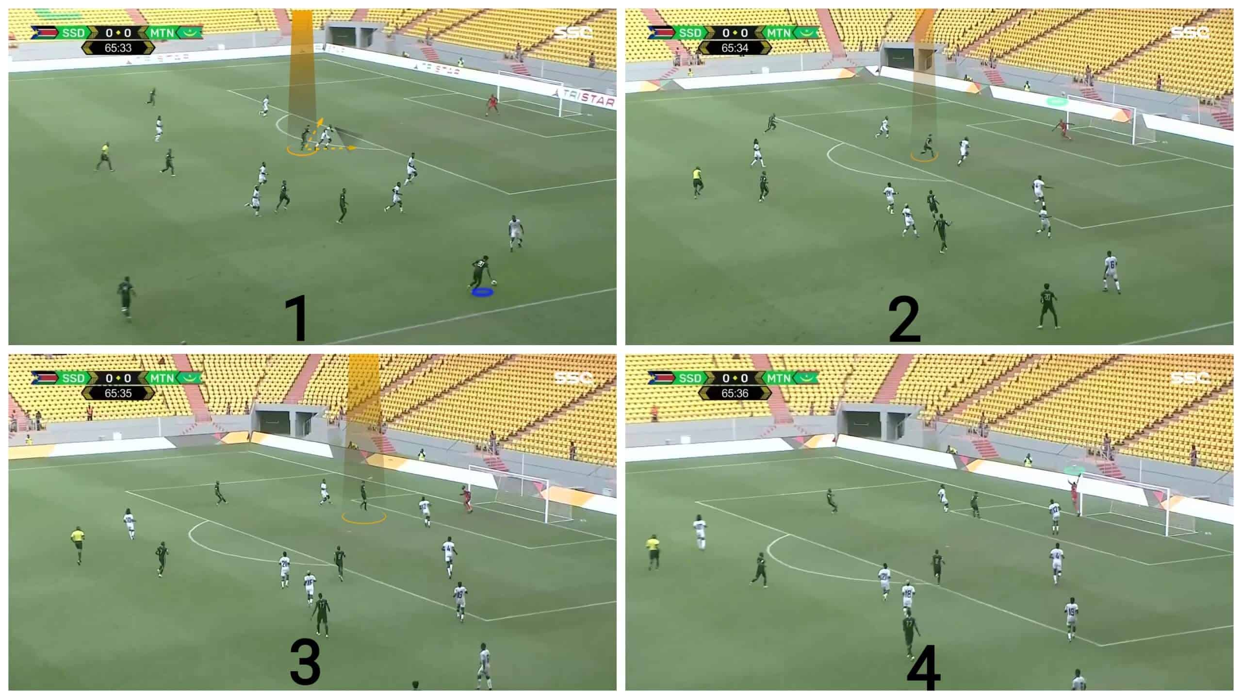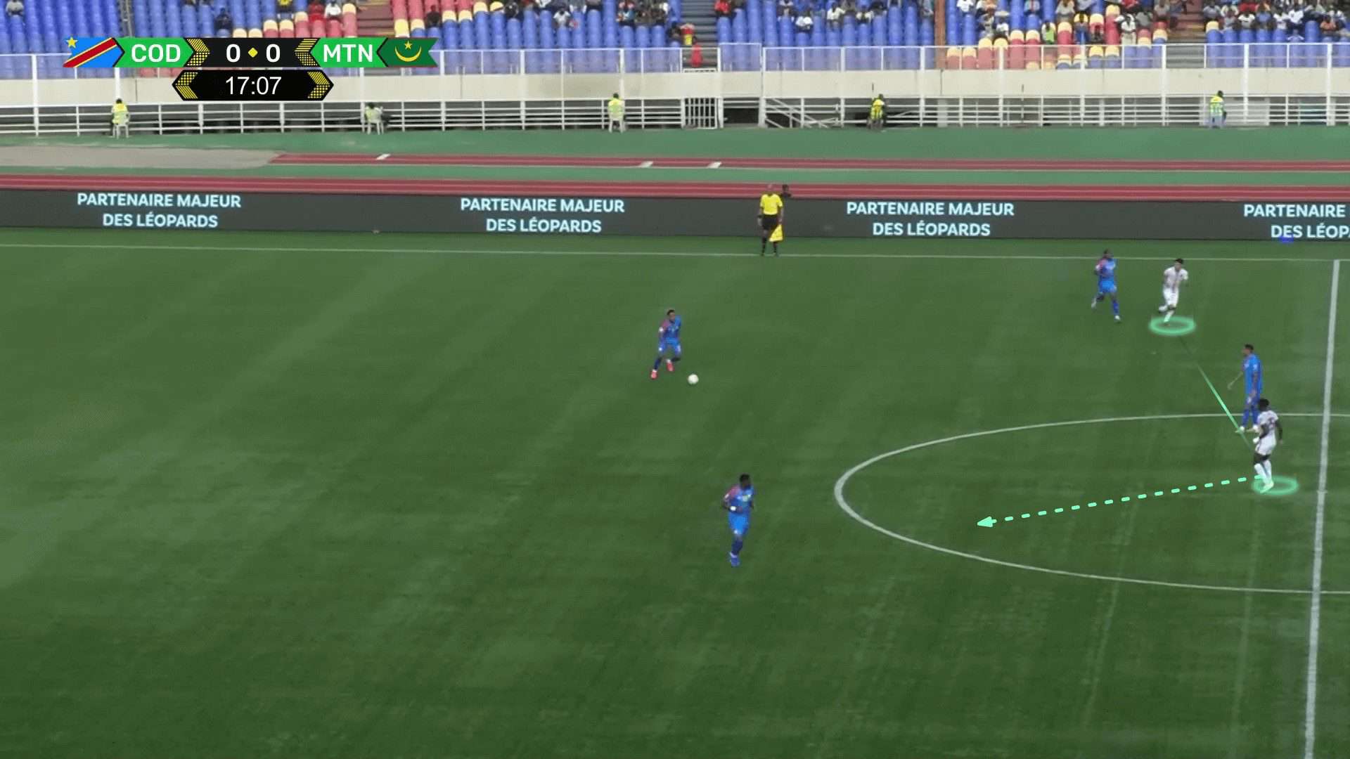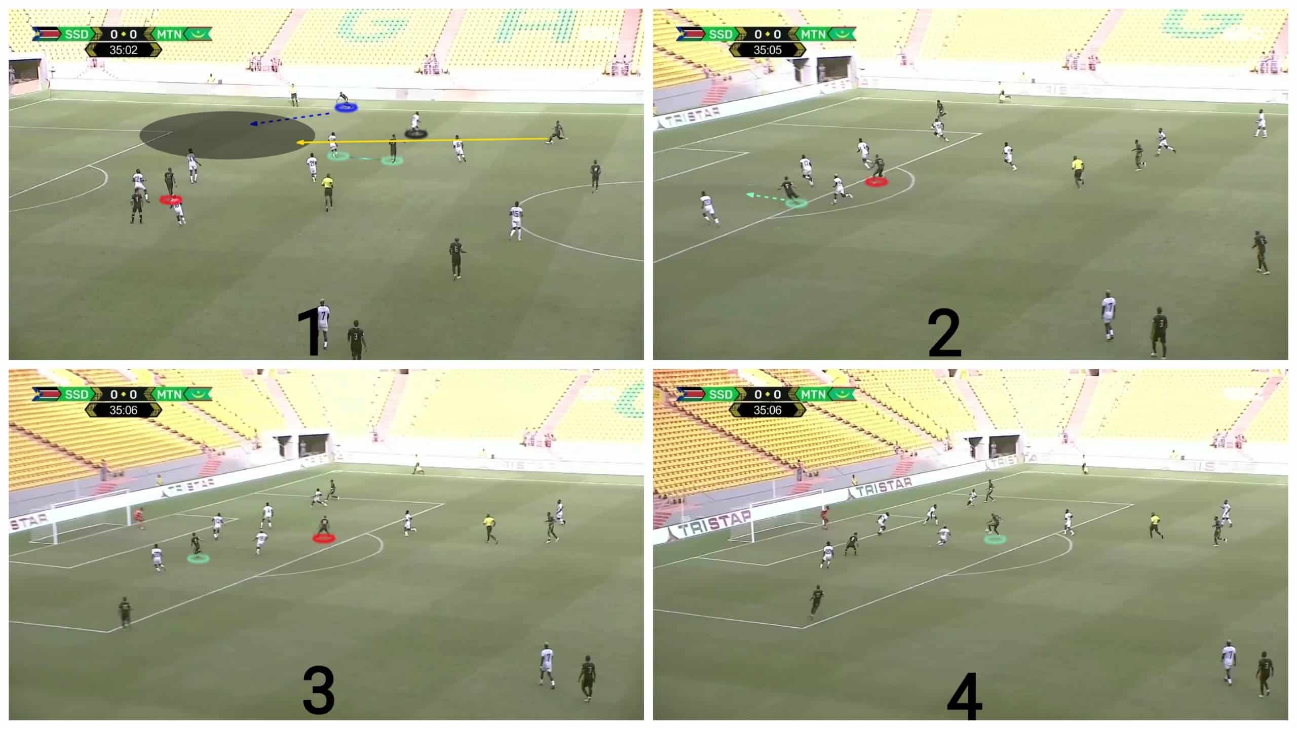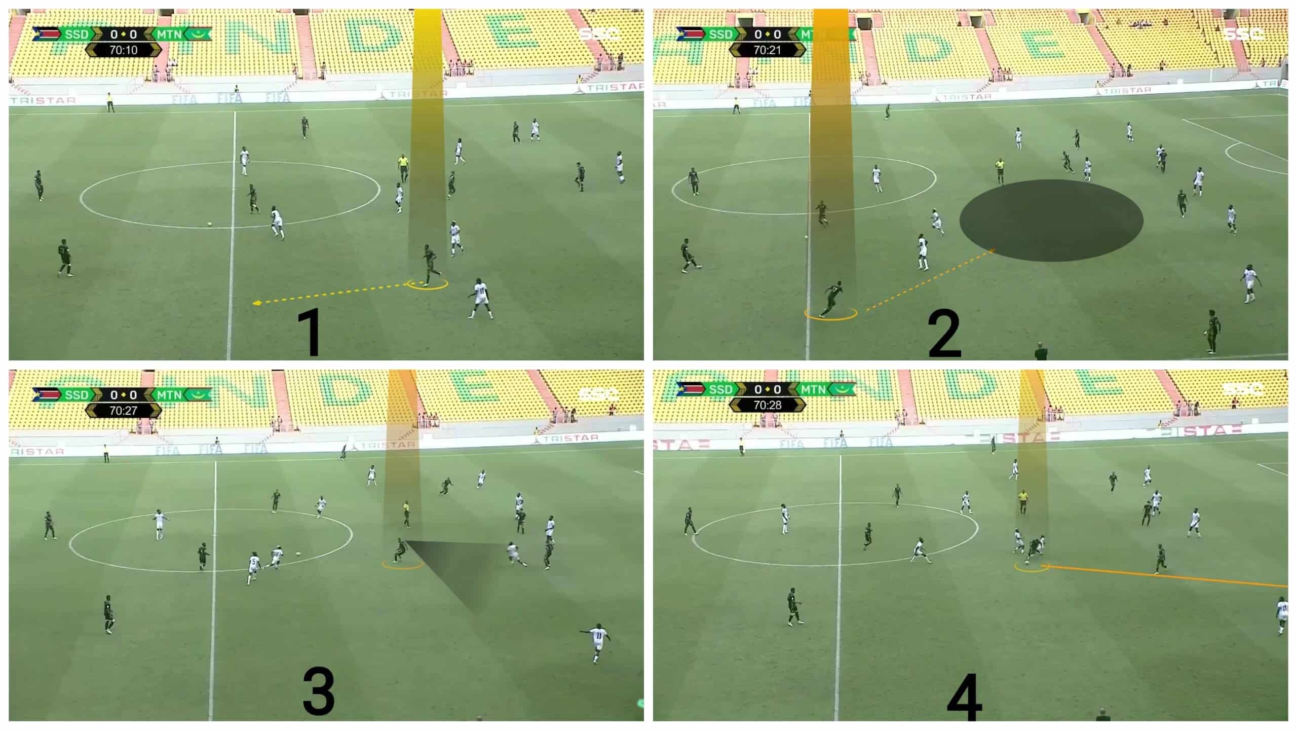 The opponent’s winger is indecisive because he faces two choices: to press the advanced midfielder with the ball or to retreat all this distance with the full-back. What exacerbates the difficulty of the situation is the movement of the Mauritanian winger inside next to the striker to pull the opponent’s full-back as far as possible. Hence, the full-back is perplexed because they create a numerical superiority over him in a 2-v-1 situation.