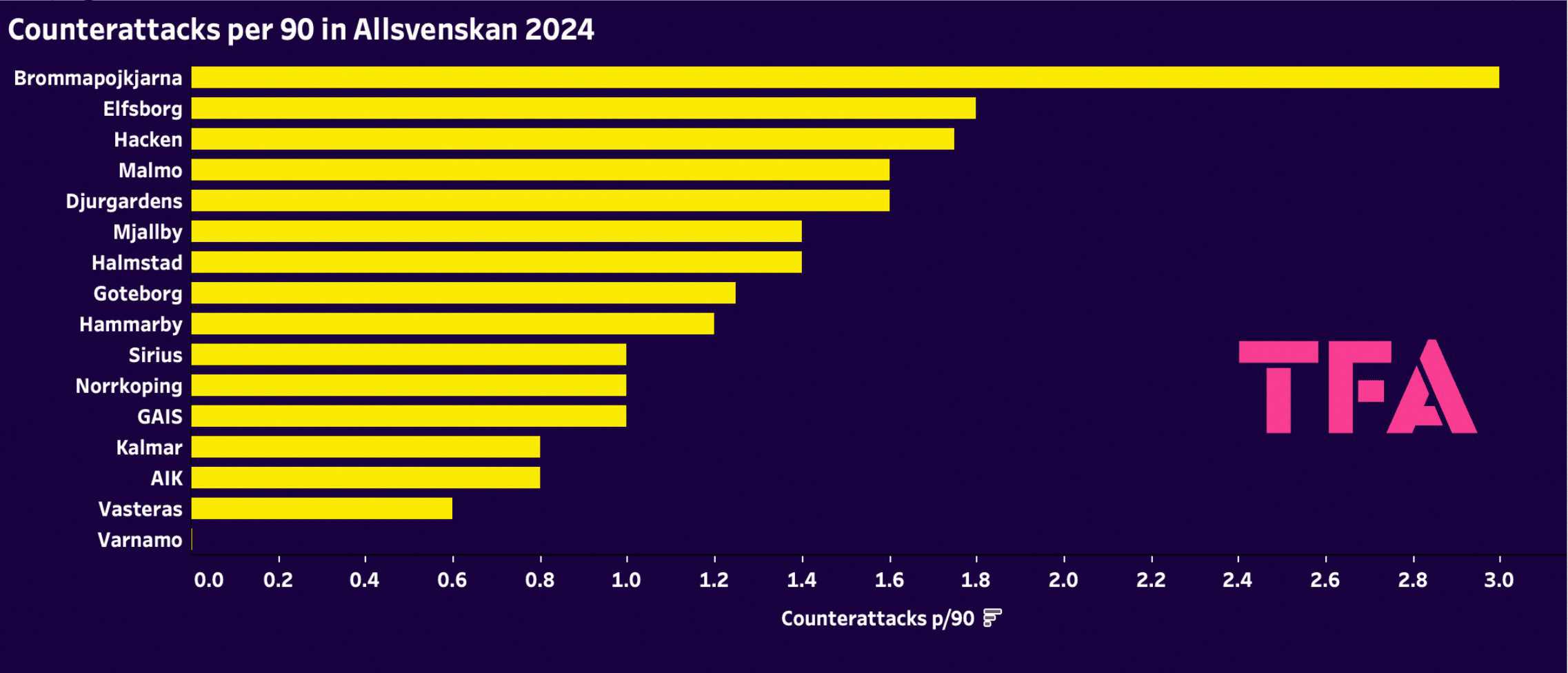 Meanwhile, AIK sit joint-third bottom of the counterattack table, level with Kalmar this time, bettering only third-from-bottom of the league Värnamo — who are yet to generate a single counterattacking chance so far this term — and second-from-bottom of the league Västerås.