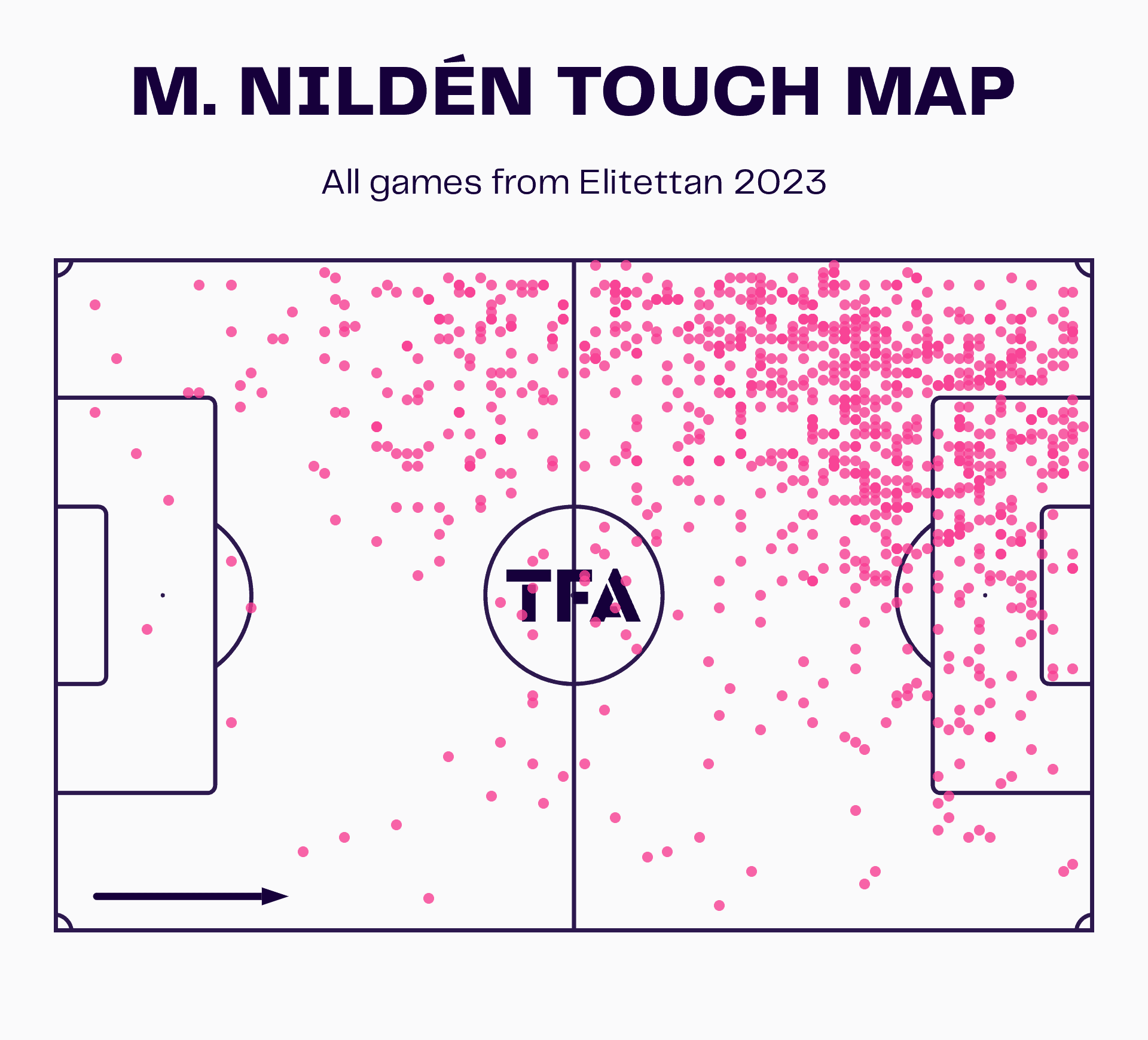 Nildén, in particular, has really thrived in this aspect of the AIK game plan, with her touch map indicating how many areas of the field she has had possession in, and what is immediately apparent is that she has been active in all three main channels of the field and has epitomised Björk’s desire to have a team that has a structure but that also plays with freedom and flexibility.