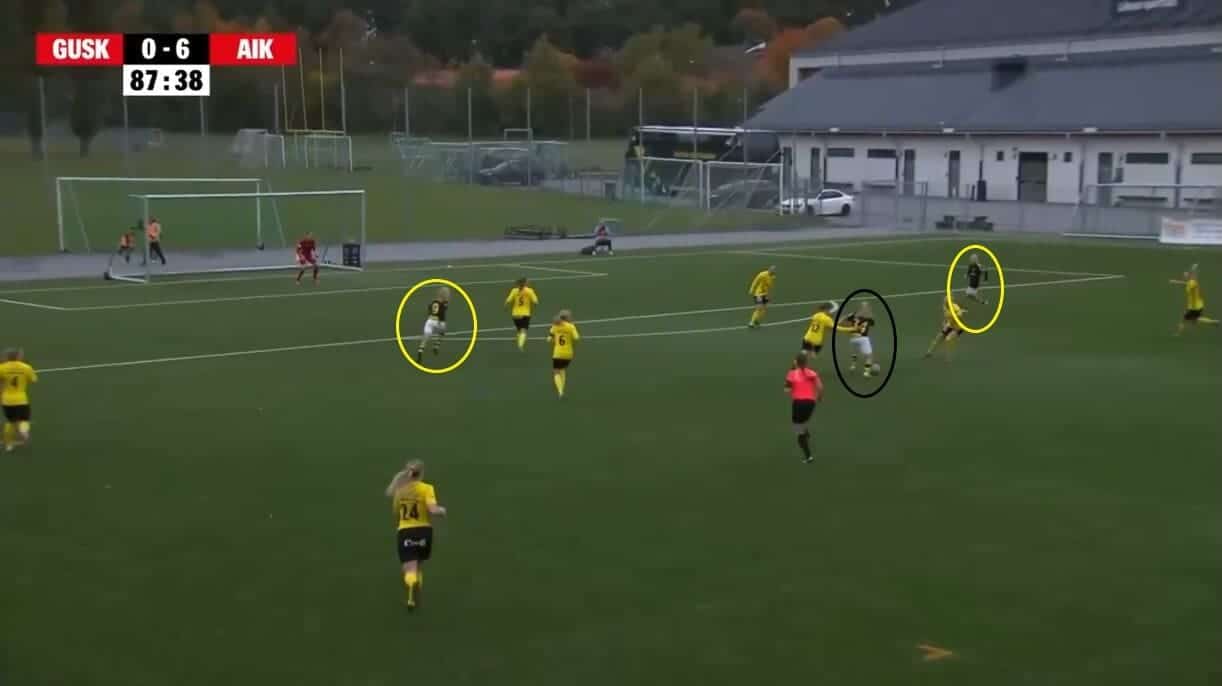 In this case, it again has the desired effect as both Ingrid Wixner and Wilma Stenman are caught on the back foot and are unable to decide in time whether to follow Grabus or to hold their positions, with the result being that AIK play through them with ease and Jansson (currently out of shot) again tests the Upsala goal.