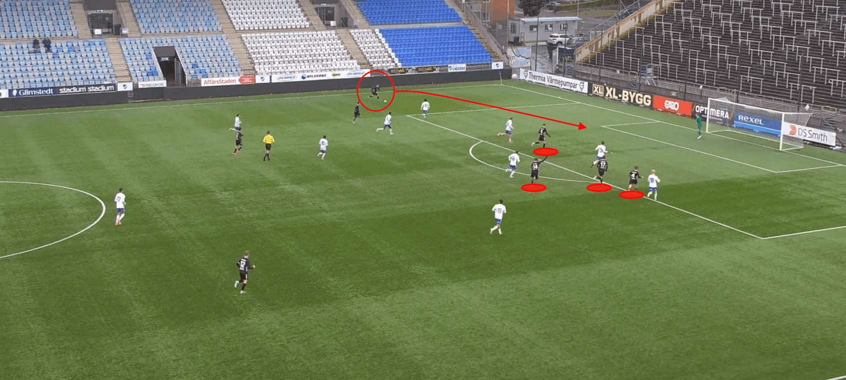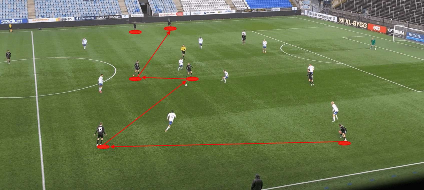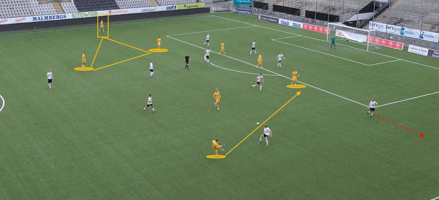 Additionally, if we cast our eye over to the far side of the pitch, we can see that a similar shape is emerging in terms of the Göteborg player’s positioning. This indicates that a similar sequence of events would take place should the play be switched across to the left flank. The manipulation of the opposition’s defensive positions allows Göteborg to capitalise on their disorganisation and vulnerabilities.