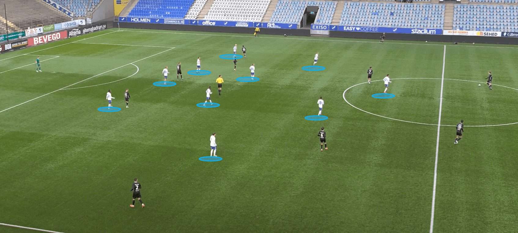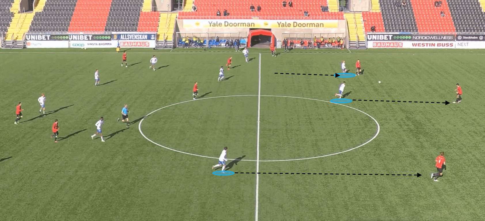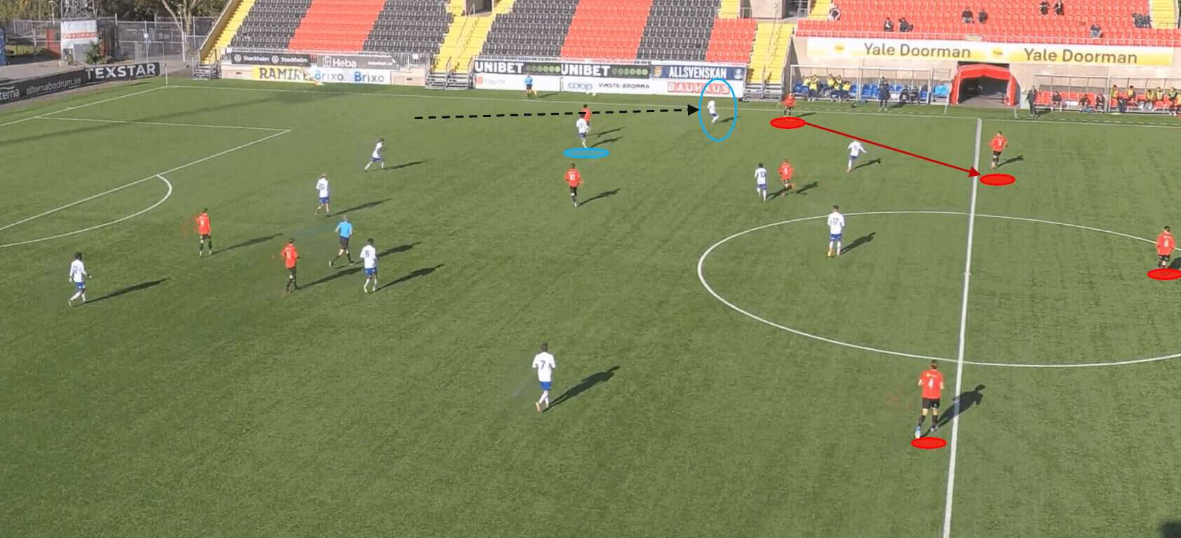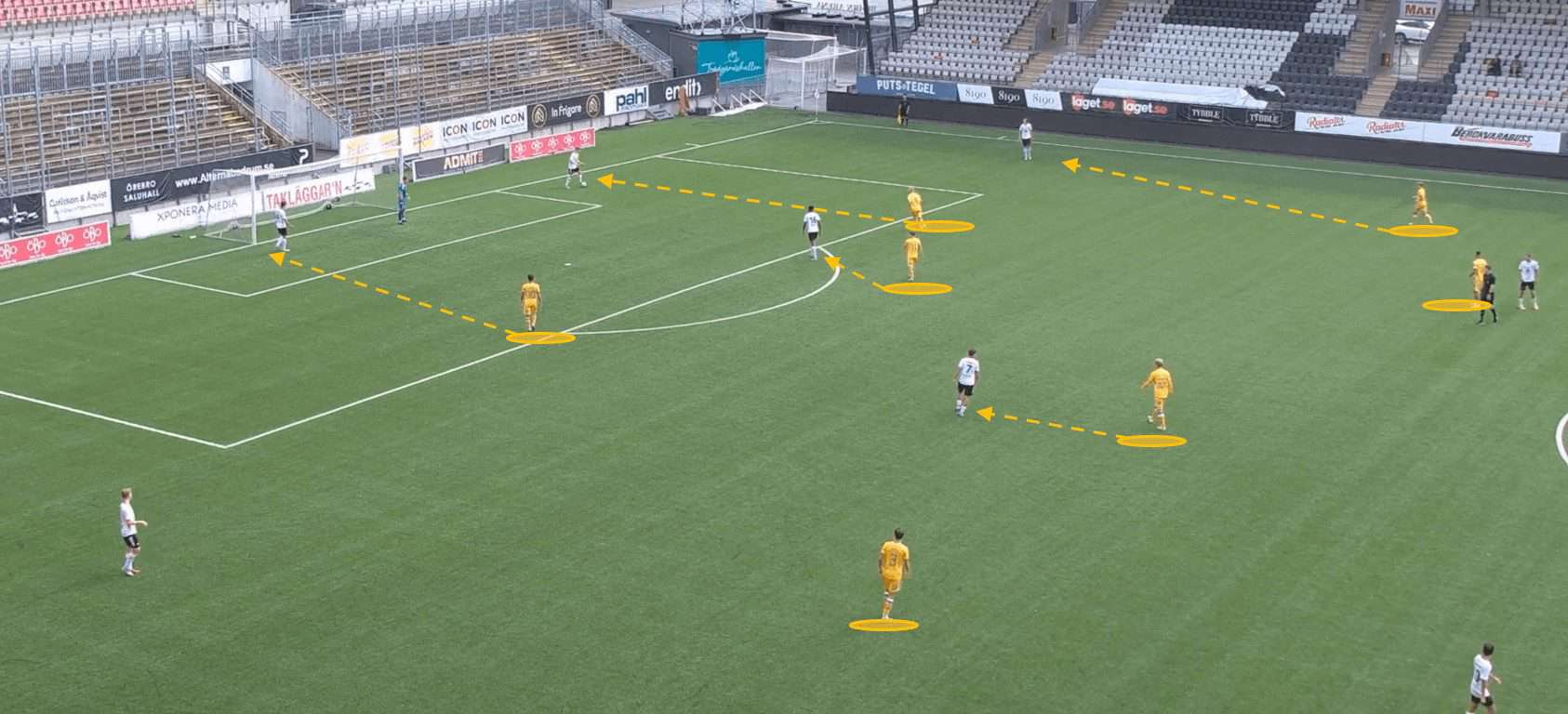 Additionally, if we cast our eye over to the far side of the pitch, we can see that a similar shape is emerging in terms of the Göteborg player’s positioning. This indicates that a similar sequence of events would take place should the play be switched across to the left flank. The manipulation of the opposition’s defensive positions allows Göteborg to capitalise on their disorganisation and vulnerabilities.