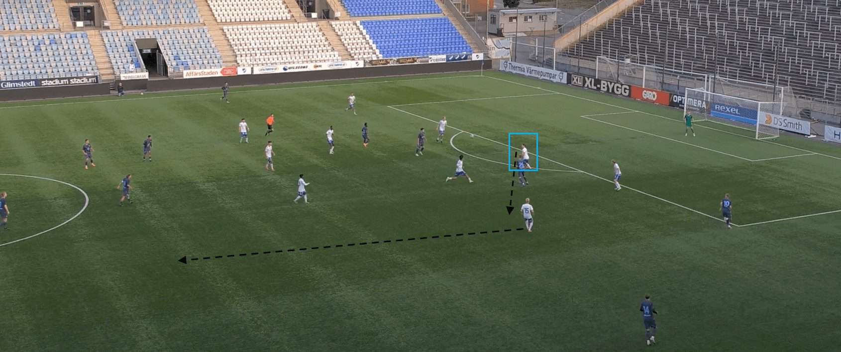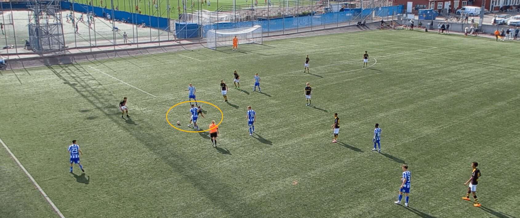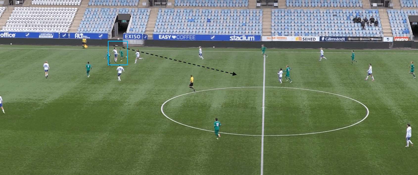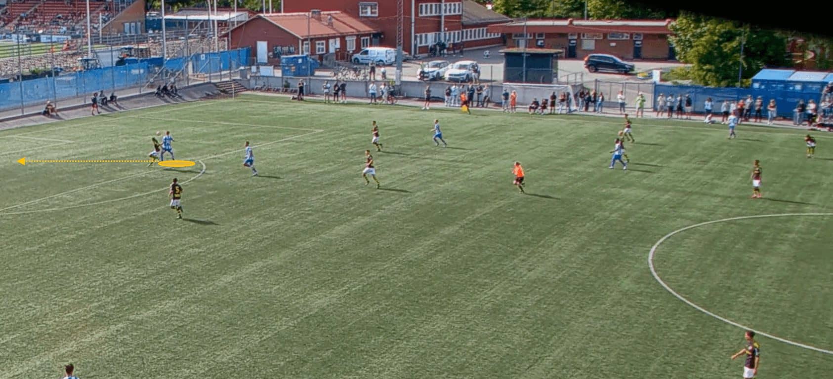 This proves to be incredibly fruitful as, with no open passing lanes, the opposition full-back hits a rather hopeful pass into space which is promptly picked up by a Göteborg player.