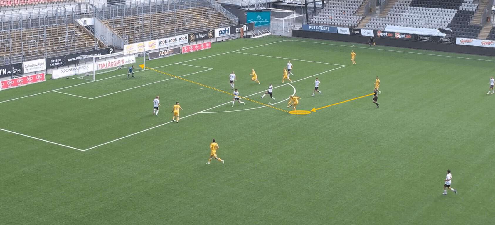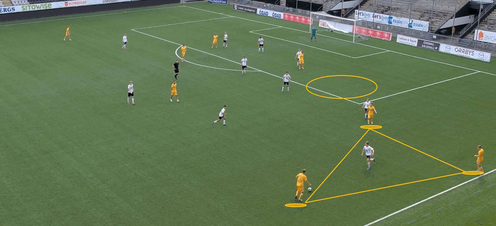 As we can see here, the Örebro front three positions themselves very narrowly in the attacking phase. The left winger occupies both the Norrköping right back and right centre back, meaning there is a vast amount of space available in the wide area. This is an issue with utilising a narrow and compact defensive shape, gaps occur down the flanks, and it can be difficult for the full-backs to deal with 1v1 situations.