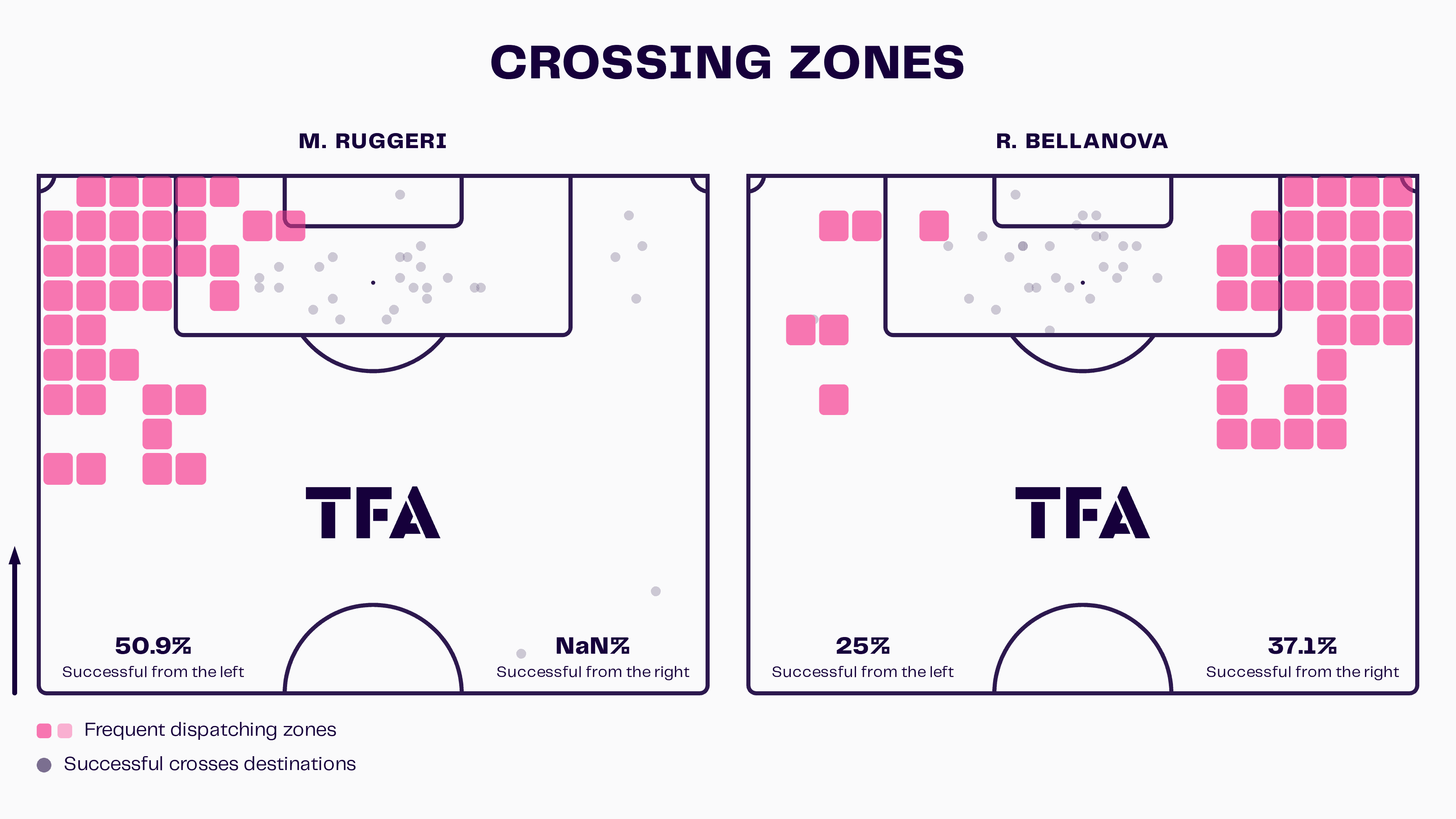 Their primary crossers are their wing-backs; in Figure 3, we see the zones from and to which they typically deliver their crosses.