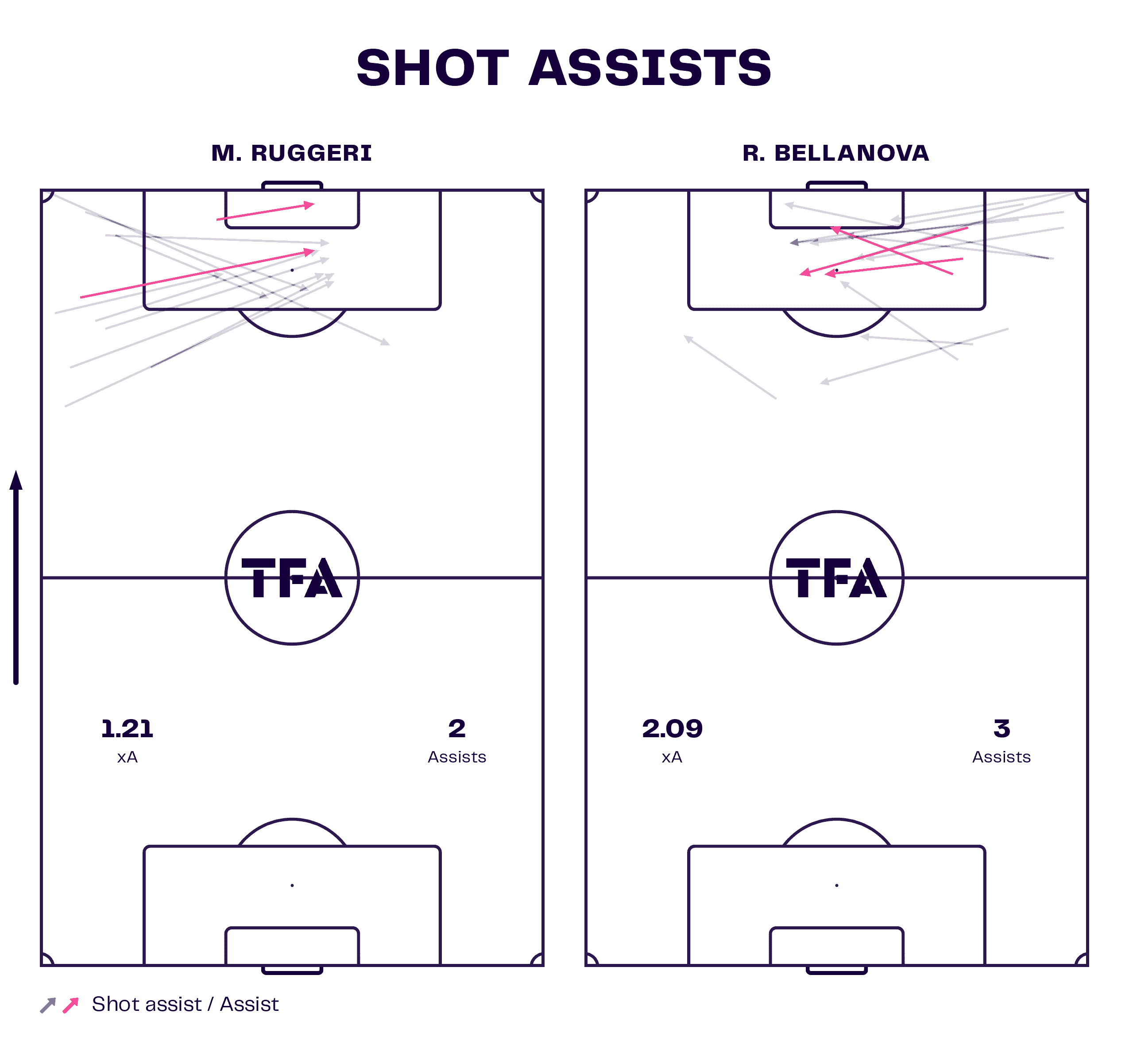 So far this season, Ruggeri has generated 1.21 xA and made two actual assists, while Bellanova has created 2.09 xA and made three assists.