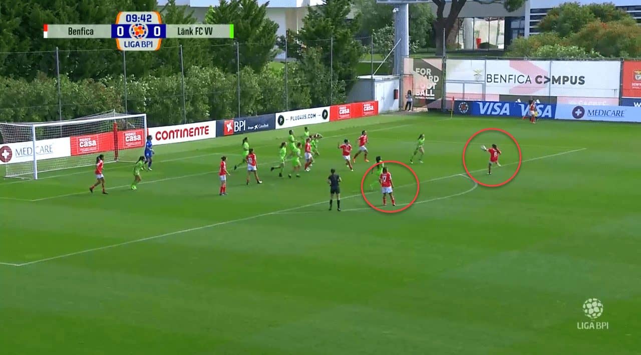 Also, the midfielders’ role has been pivotal to Benfica’s attacks this season. Patão usually demands that they provide key passes whenever possible, especially when the opposing defensive line is high, like in this example against Olympique Lyonnais.