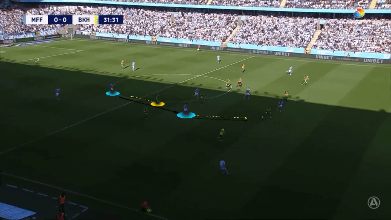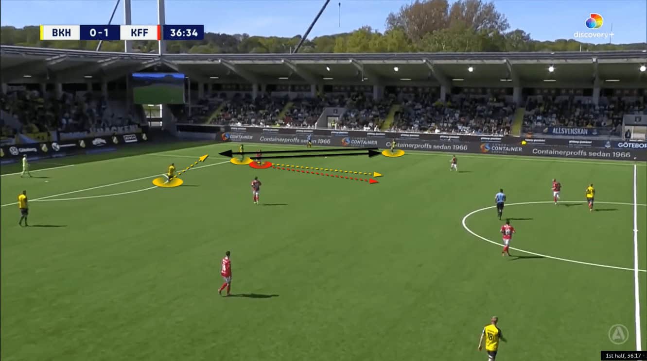 The above image shows Häcken exploiting that space to progress the ball up the pitch. Häcken’s right centre-back has just received the ball from his left centre-back and has played a pass into his central midfielder. As the ball was travelling to the centre-back, the central midfielder, positioned high and in the half-space, made a run into the space he had created to receive the ball.