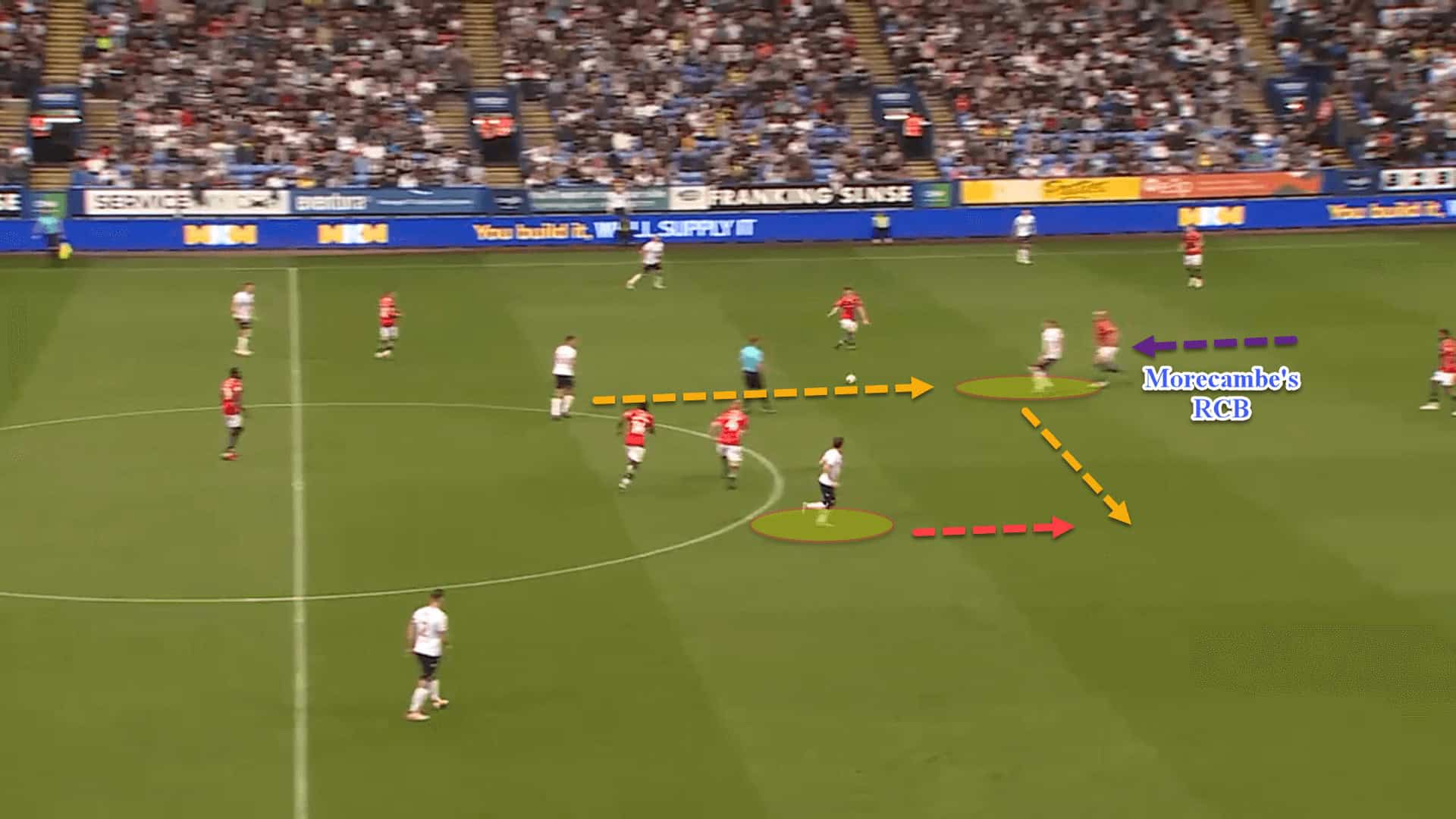 This can be seen from the above example. Bolton’s middle centre-back leaves the backline to challenge Morecambe’s striker in the air. The other four defenders have all backed off to cover the space in behind, pushing closer together and forming a temporary back four.