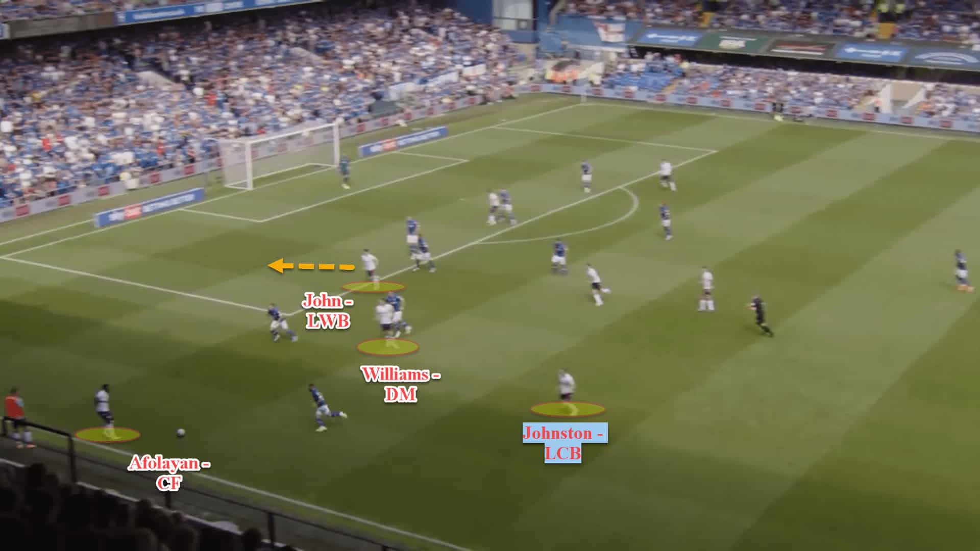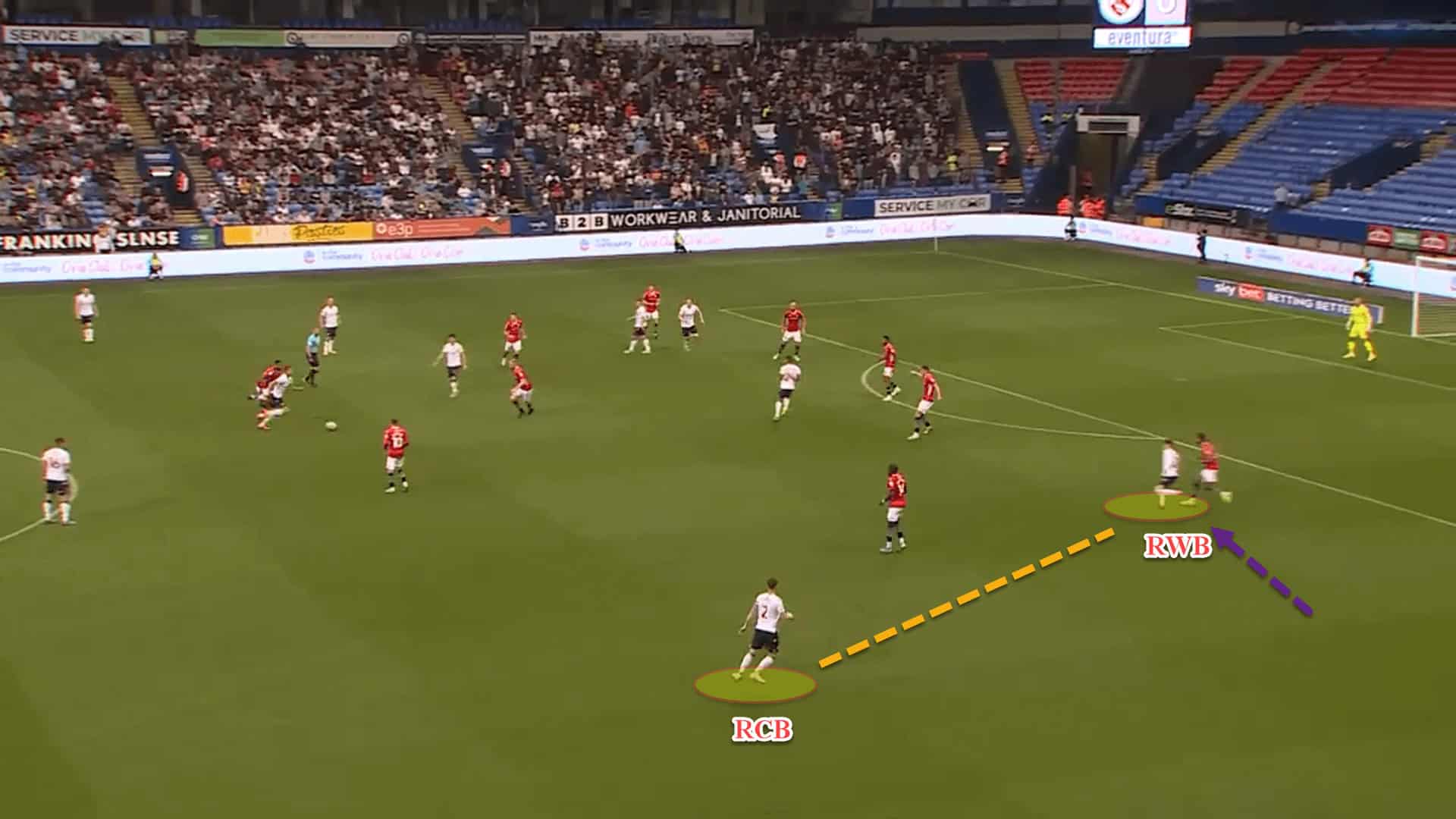 This type of wide rotation-cum-overload has taken place in the previous image. Centre-forward Oladapo Afolayan is the widest player for Bolton, while left wingback Declan John has inverted into the halfspace.