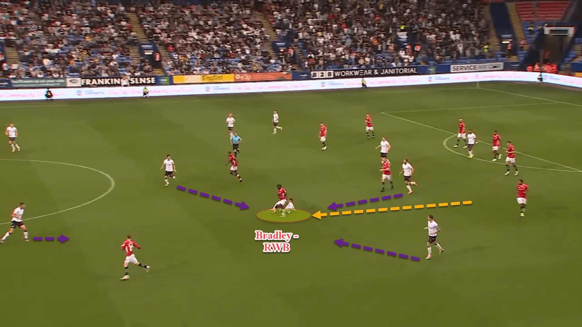 As we spoke about earlier, when the ball is on the left side, the right wingback, Bradley, tucks infield. For the most part, Bolton are not holding width on the opposite side of the pitch.
