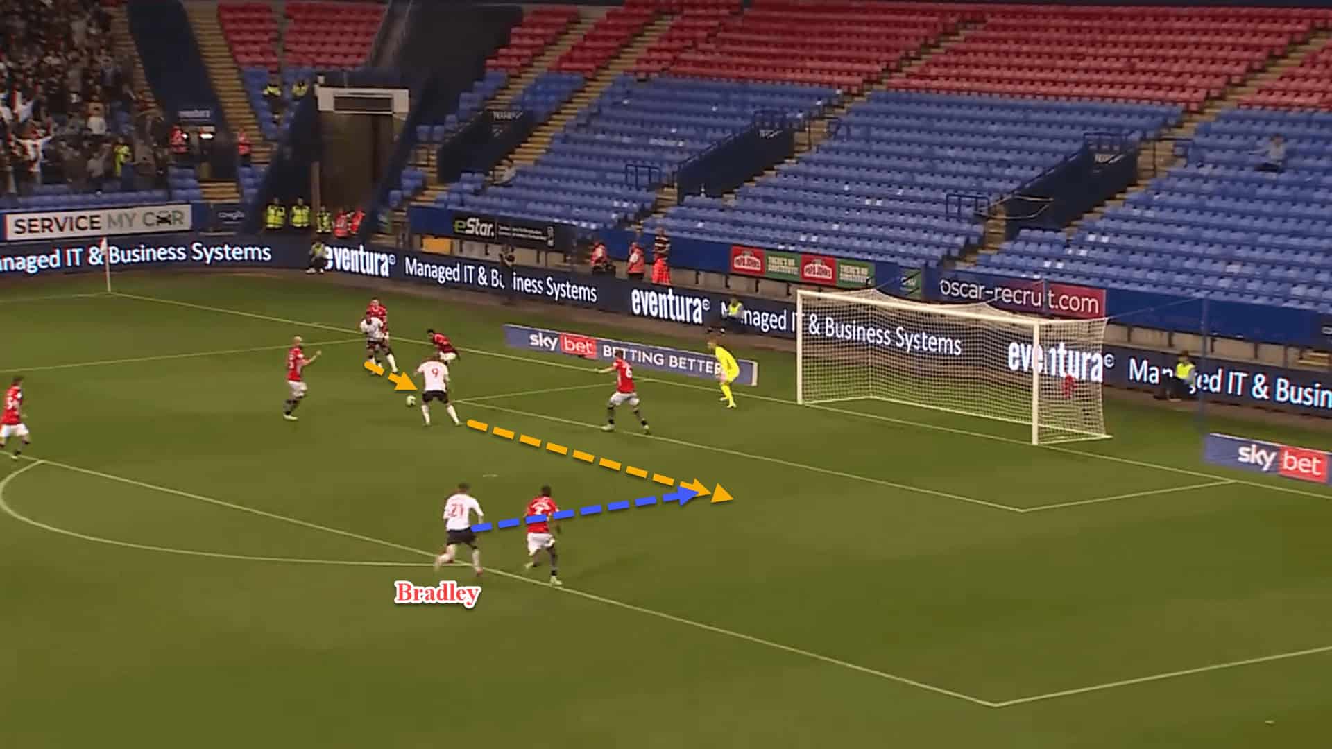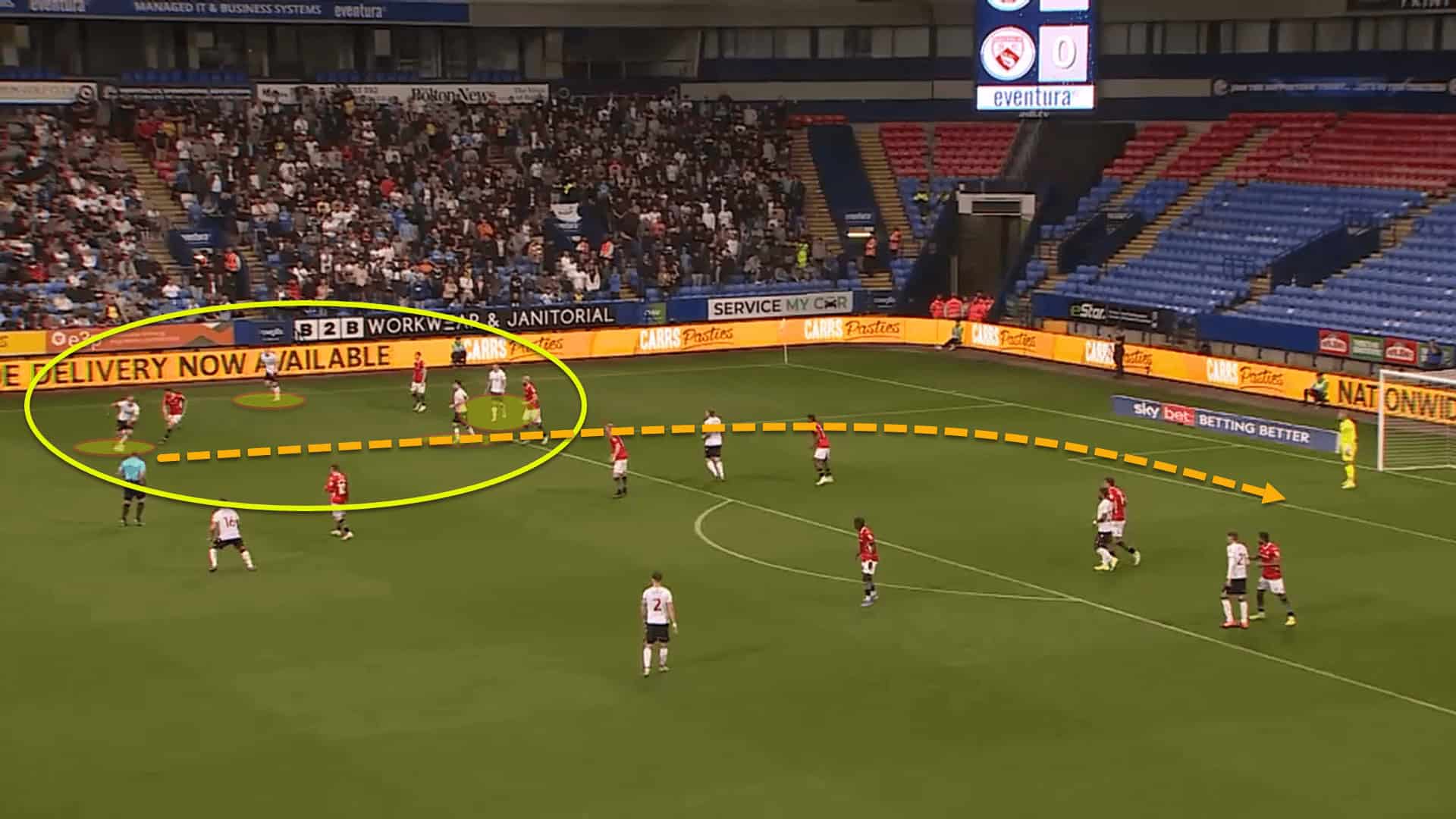 The end goal for Bolton is to use their numerical superiority from these overloads to find the free man and put crosses into the box.