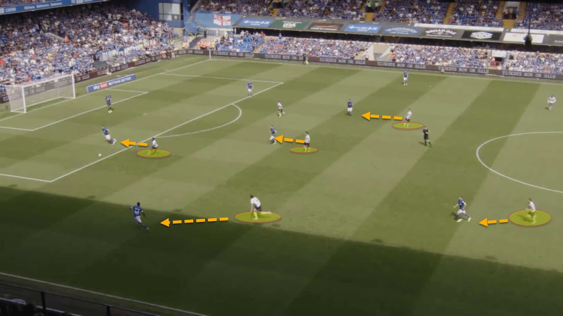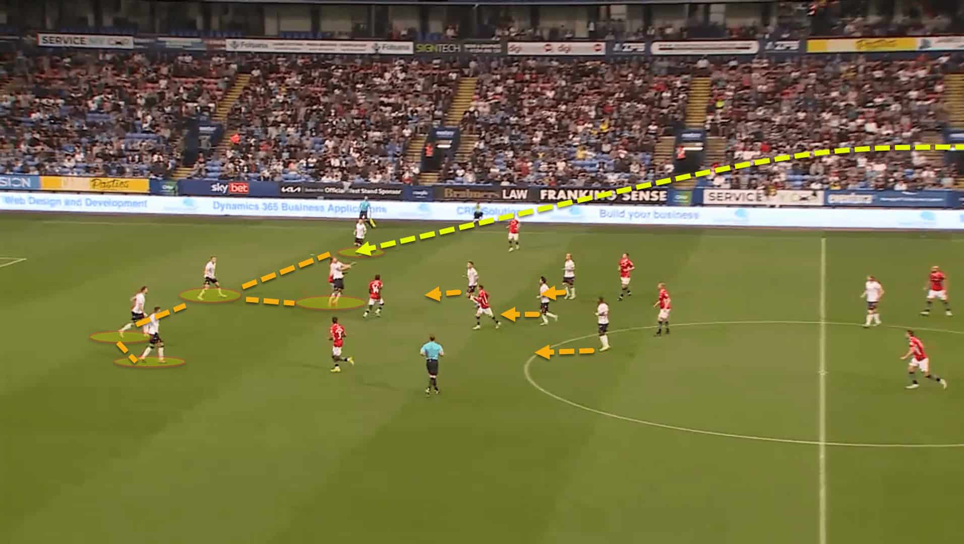 When facing a possession-oriented team like Ipswich, Evatt employs a zonal press where the players force the opponent to one side of the pitch before switching to a man-oriented system and pressurising their nearest passing options aggressively. This was portrayed in the example above.