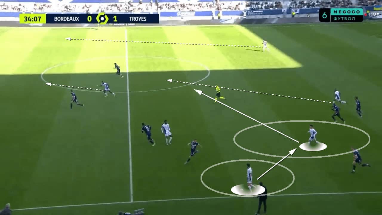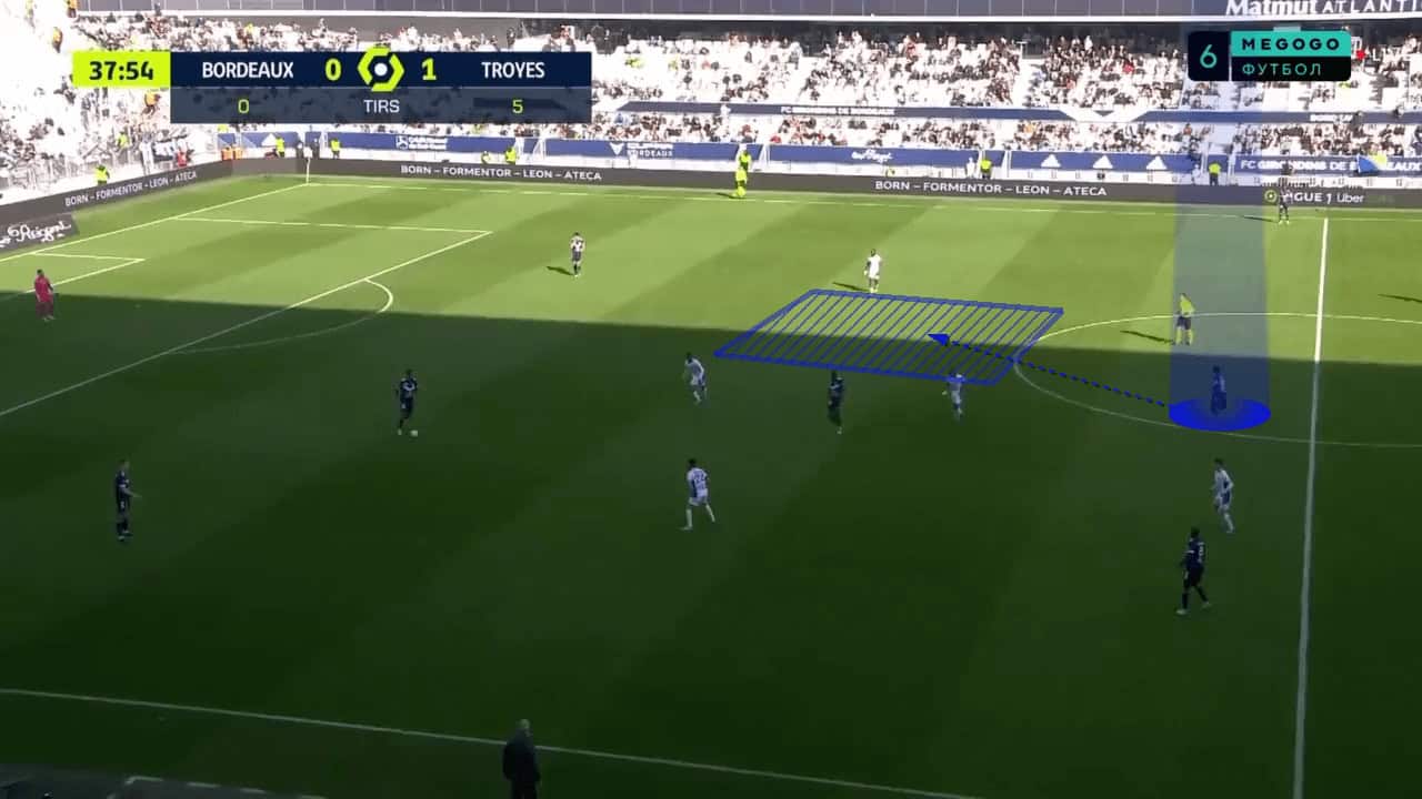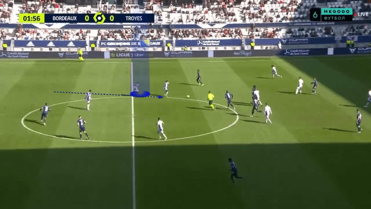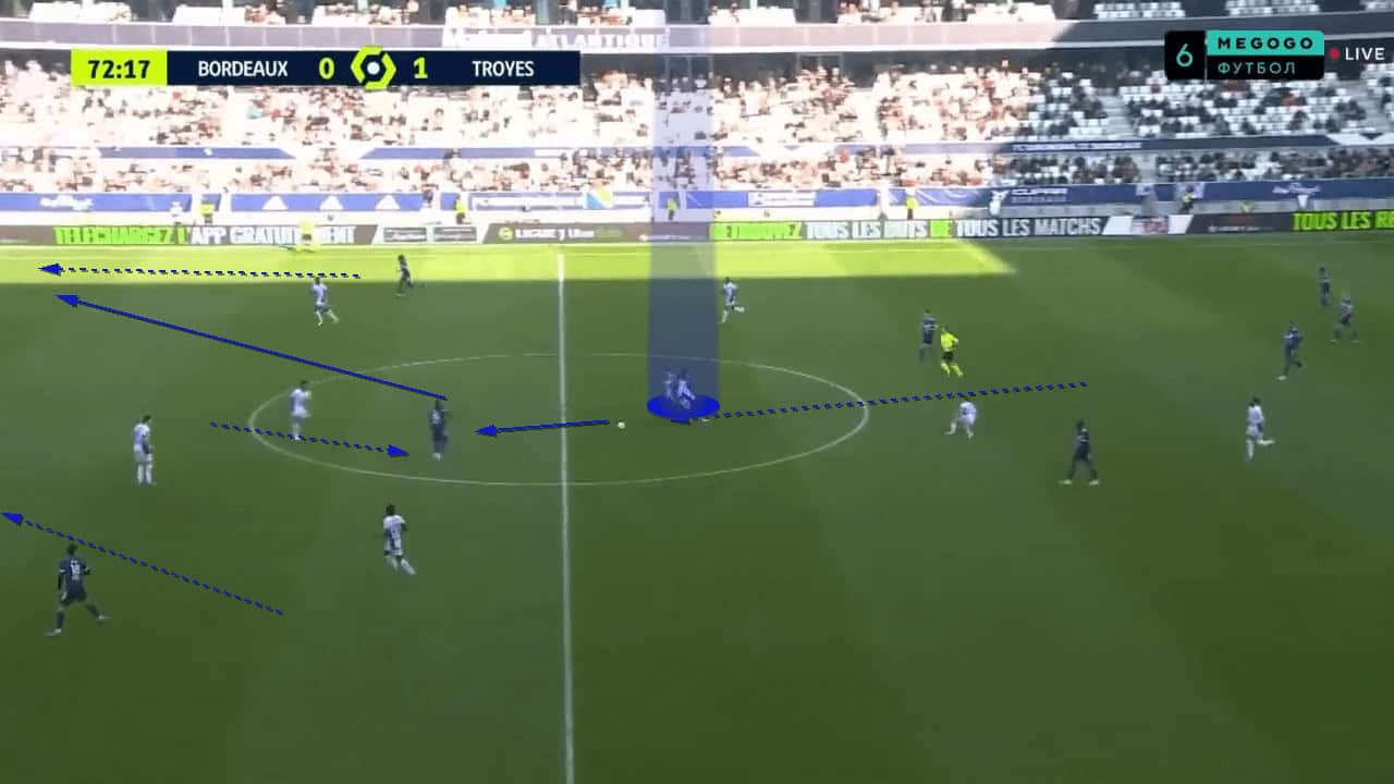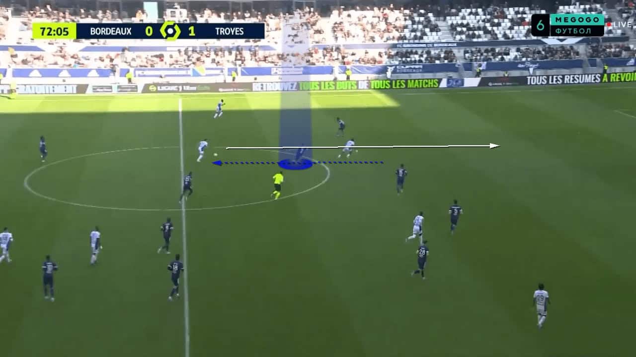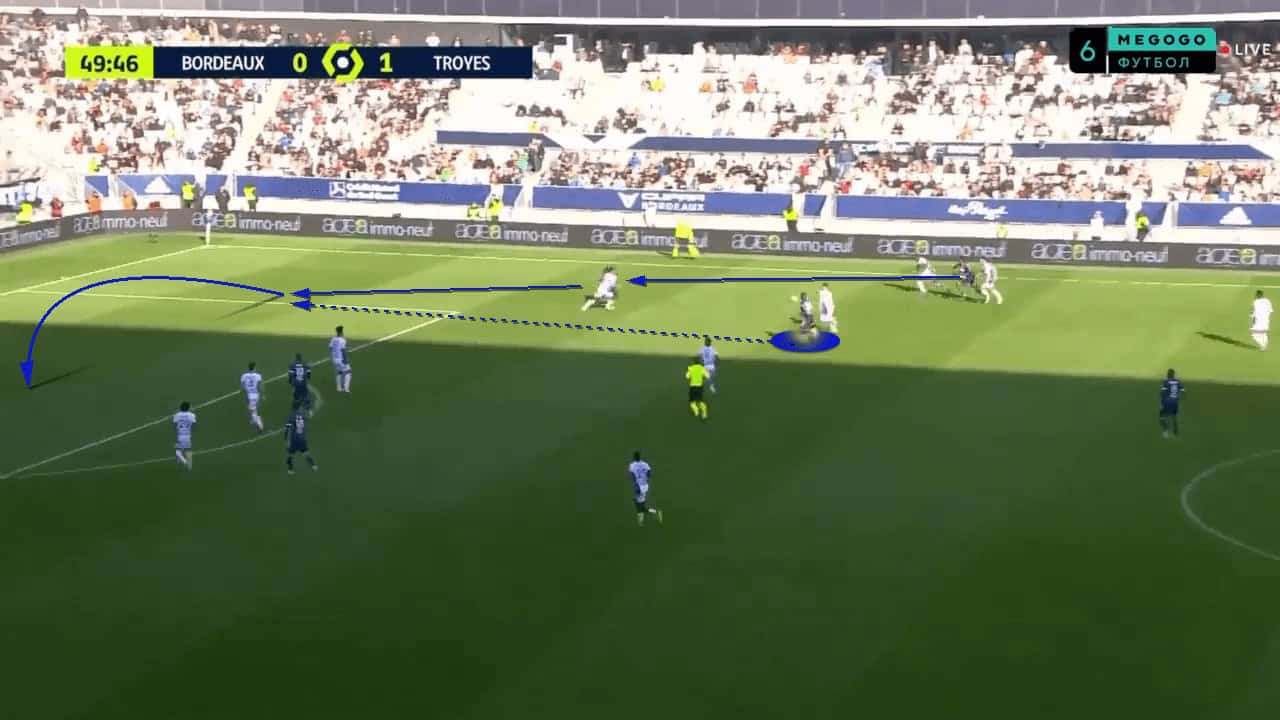 Off-the-ball runs from deeper players were something that Guion introduced into the team and it worked quite well. Whilst defensive players were preoccupied with the Bordeaux front line, a deep run from a central midfielder would be made into a wide channel. This run was usually tough to mark due to the long distance being covered, and the defensive player having to chase after the runner, rather than them already being in a low block with the attacker running at them. This third-man run idea allowed the player to receive the ball on the edge of the box, unmarked, as shown in the image below. Although a goal wasn’t scored off the back of this, it was one of the better chances Bordeaux managed to create against a stubborn defence.