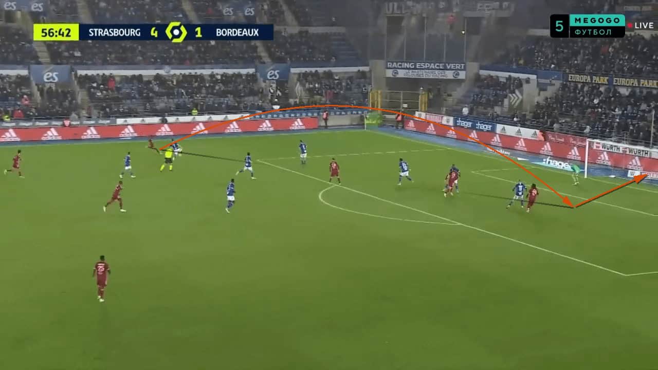 Bordeaux also had achieved success by keeping the ball in wide areas before crossing it in. When Guion came in and implemented the back five, it meant they would attack the box with a front five. This would be particularly effective against a back four where five runners would attack the box, and often one player would be left unmarked. This was usually the far wing-back who was making a slightly later run, so the cross to the back post was always on. This image below demonstrates Bordeaux’s ability to deliver balls towards the back post. A particular target was to aim towards the back post, where an attacker would be in the defenders’ blind side, allowing the attacker to gain space in the box without being tightly marked and scoring the header.